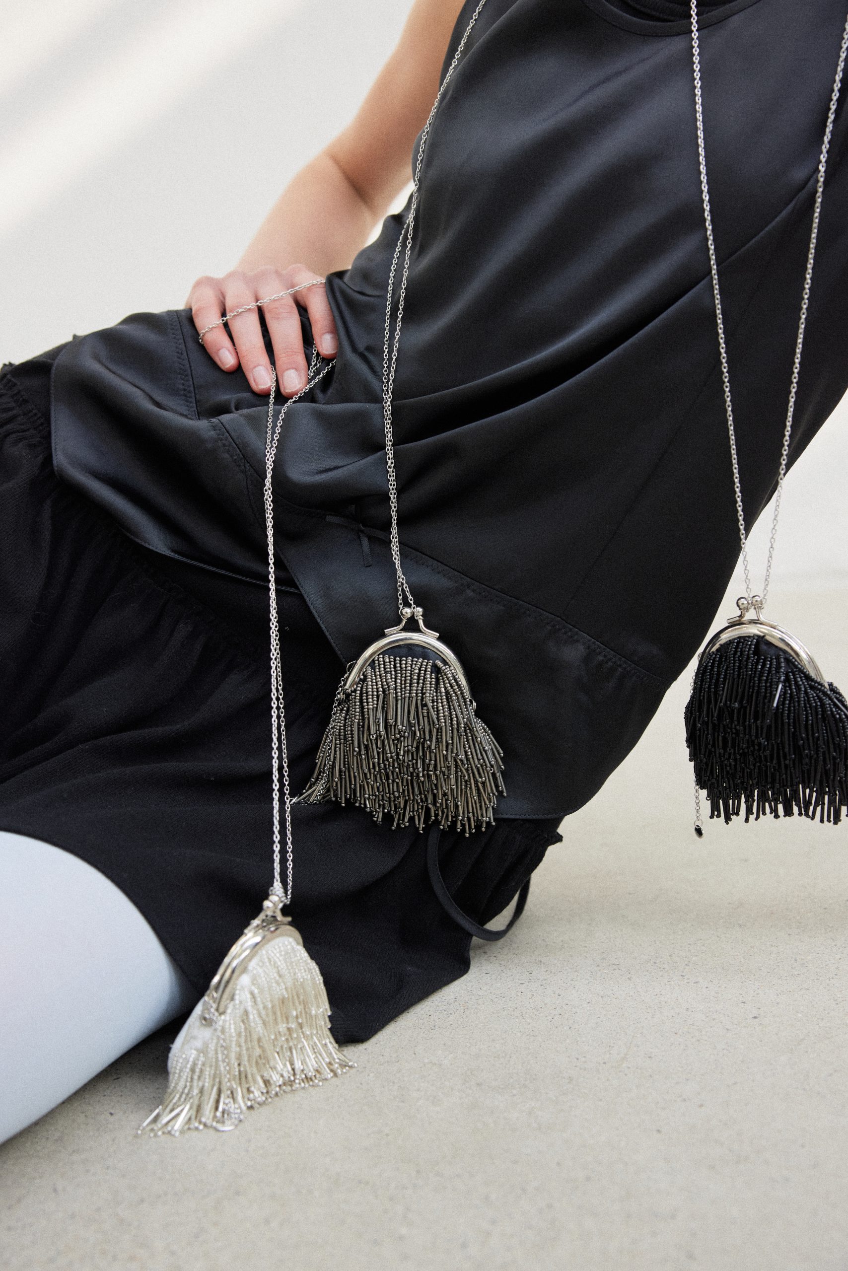 イタリア製ビーズフリンジをハンドメイドで編み込んだ超ミニバッグ。AirPods、リップスティックなどの小物が収納。チェーンを繋げてクロスバッグとしても活用できます。