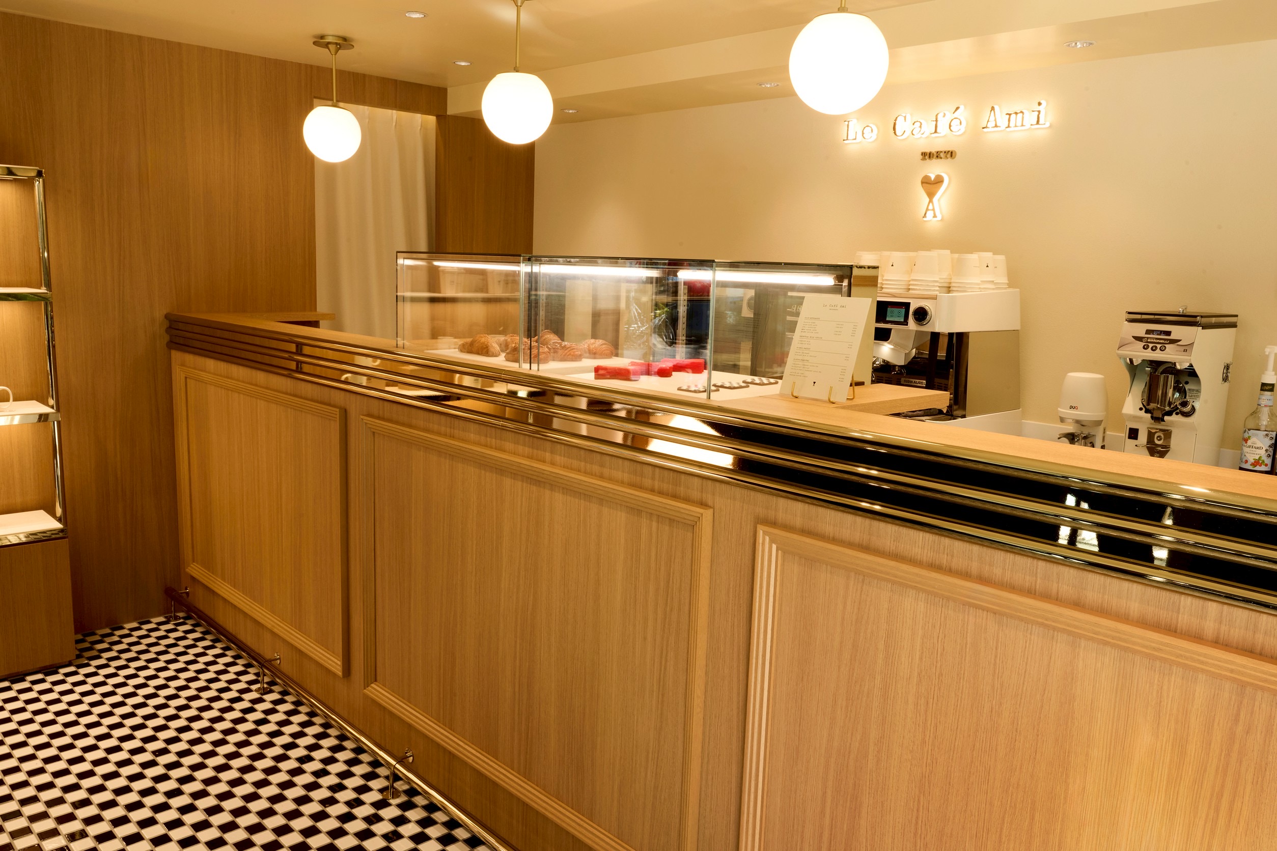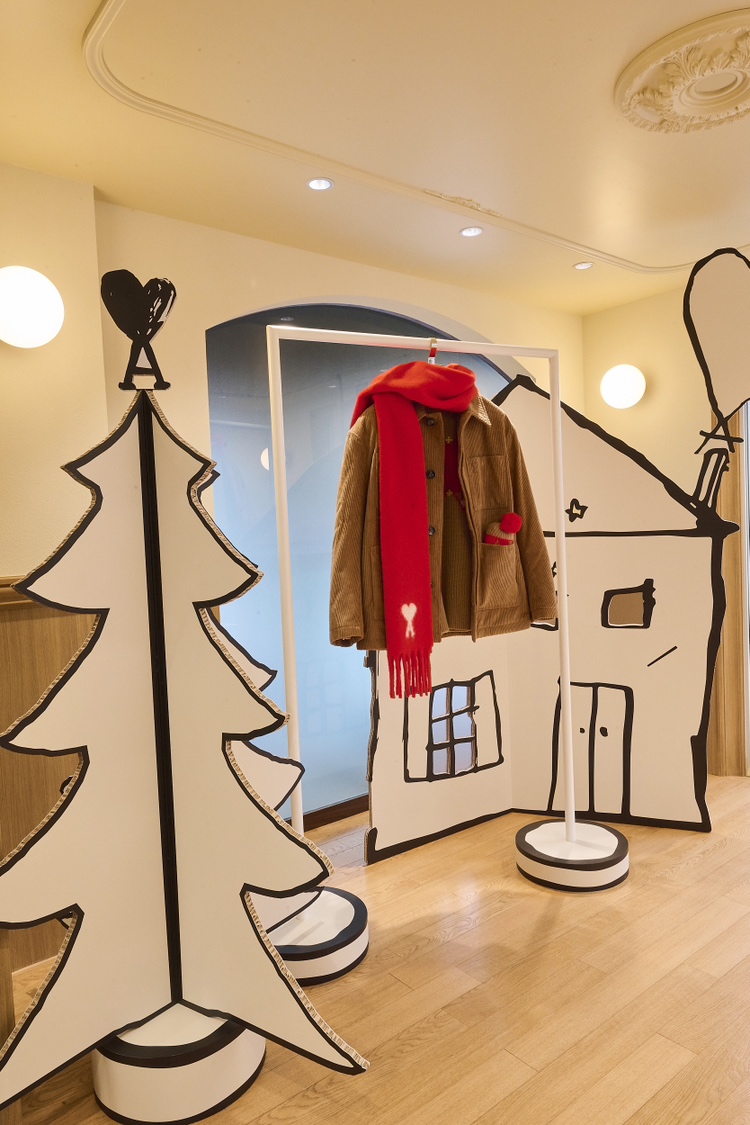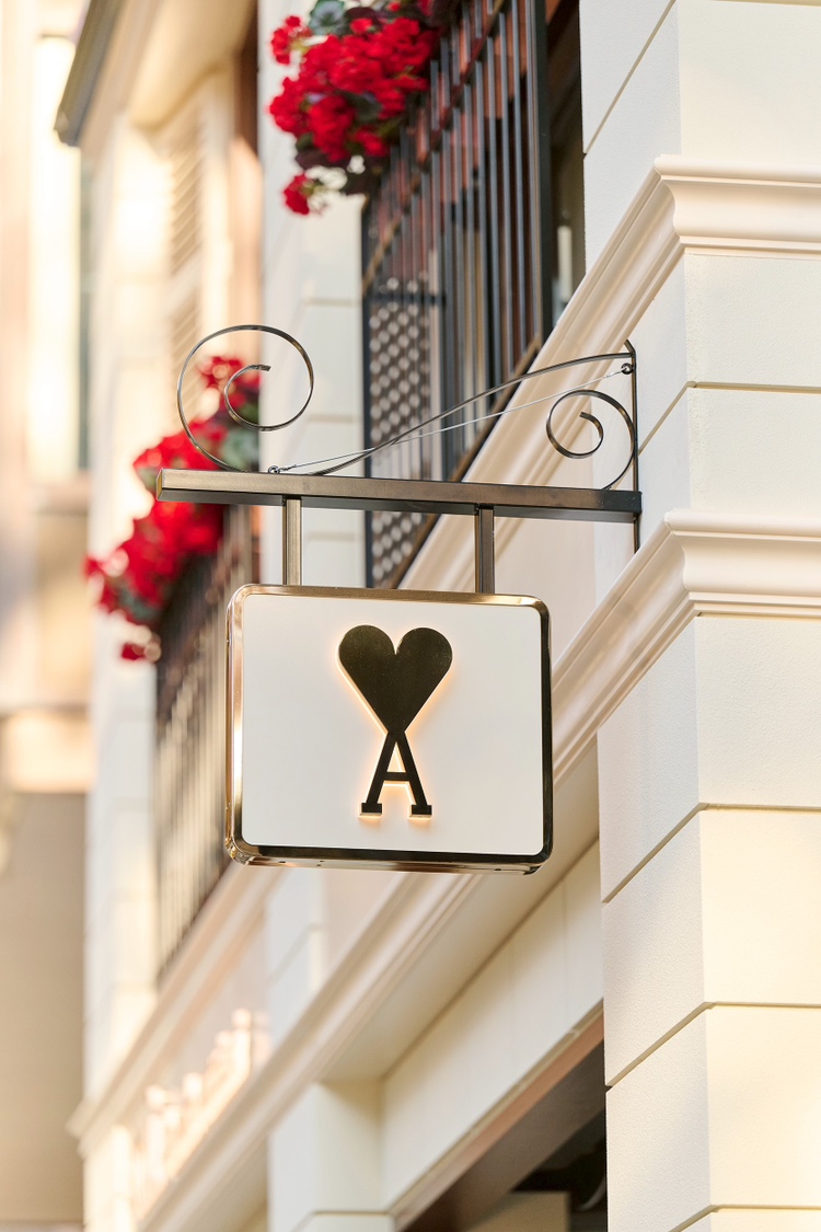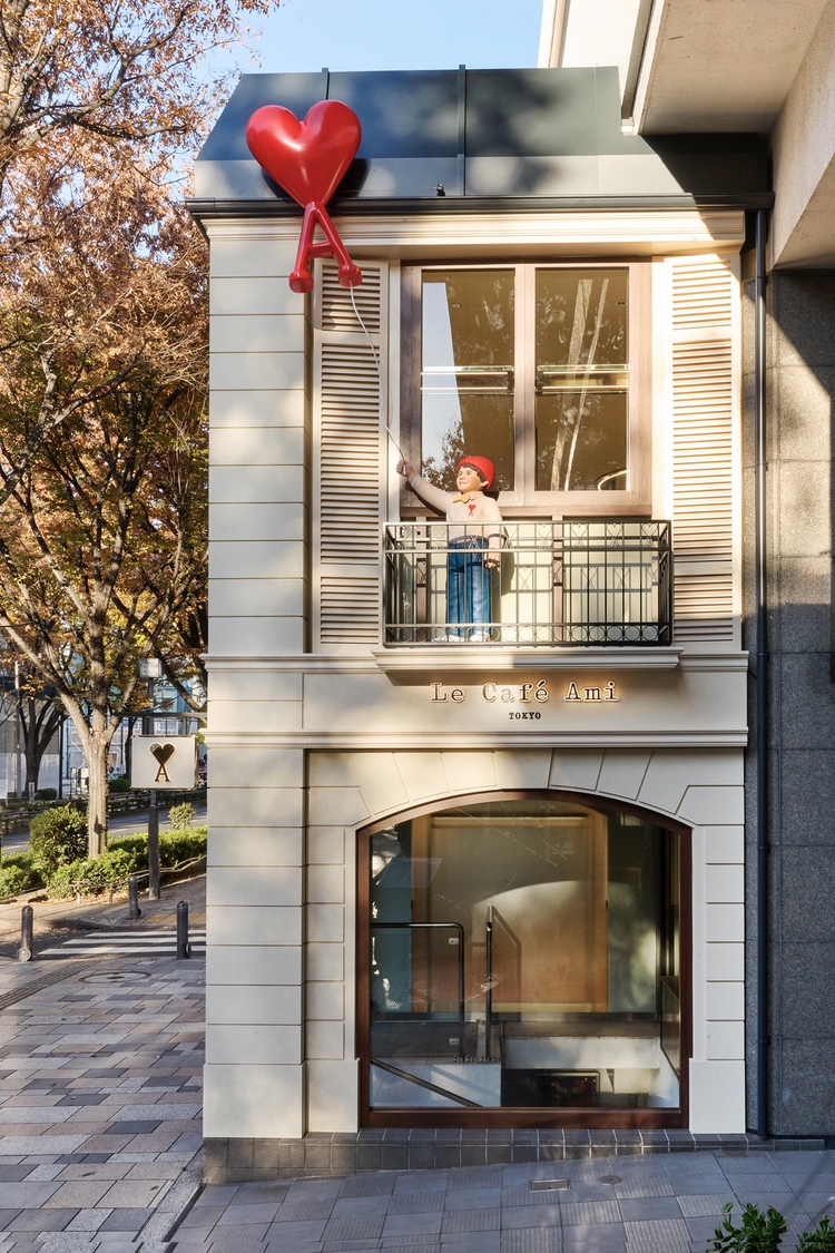 ファサード中央には、創設者兼クリエイティブディレクターのアレクサンドル・マテュッシの幼少期から着想を得た“小さな男の子”のオブジェが佇み、赤いAmi de Cœur(アミ ドゥ クール)のバルーンを手にしています。これは、アルベール・ラモリス監督の名作短編映画『赤い風船(Le Ballon Rouge)』へのオマージュでもあり、ブランドが大切にする詩的な世界観を象徴しています。
