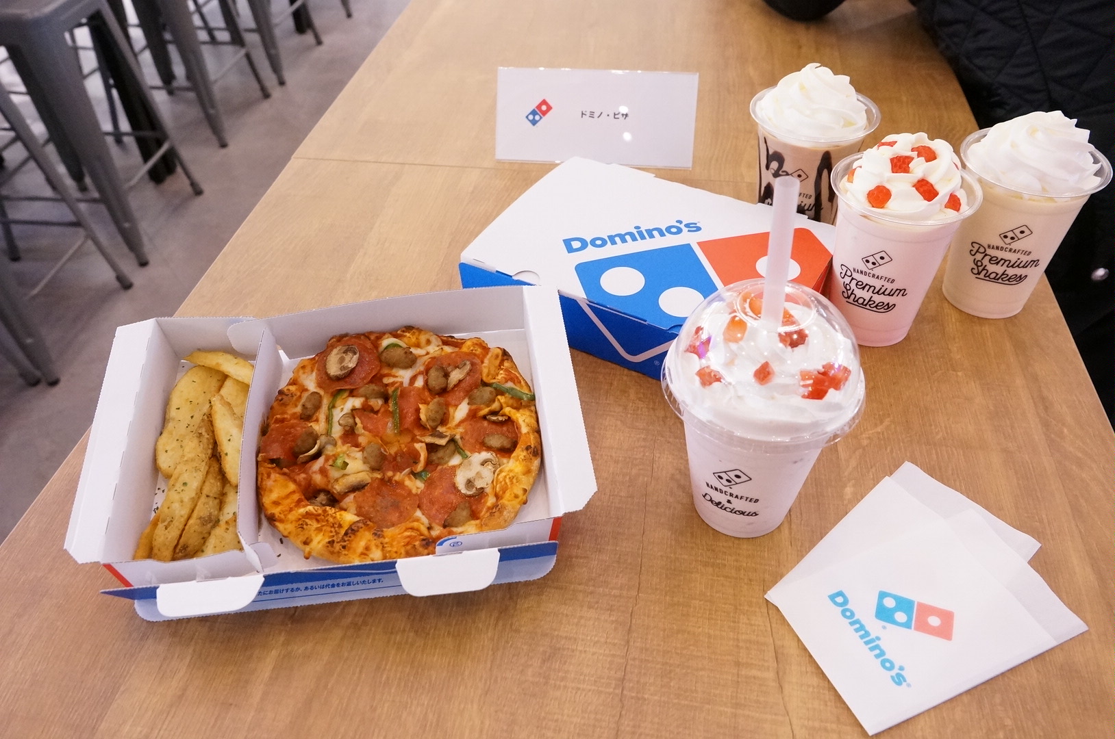 有明ガーデン店では、ピザとポテトフライが“ちょうどいい”コンパクトサイズのお弁当になった「ピザBENTO」、濃厚な味が人気の「ドミノシェイク」シリーズ、ソフトドリンクを取り揃えています。ランチやディナー、カフェタイムの利用にもぴったりです。ぜひ、できたての商品をお召し上がりください。