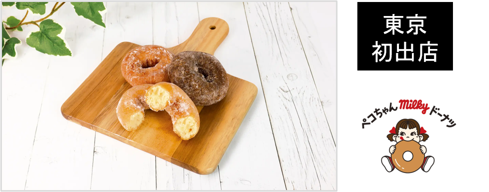 不二家の新ブランド「ペコちゃんmilkyドーナツ」です。米油でひとつひとつ丁寧に揚げた素朴で優しい味わいのドーナツです。「ミルキー」の風味をイメージした、軽いくちどけの不二家自慢のドーナツをお楽しみください。