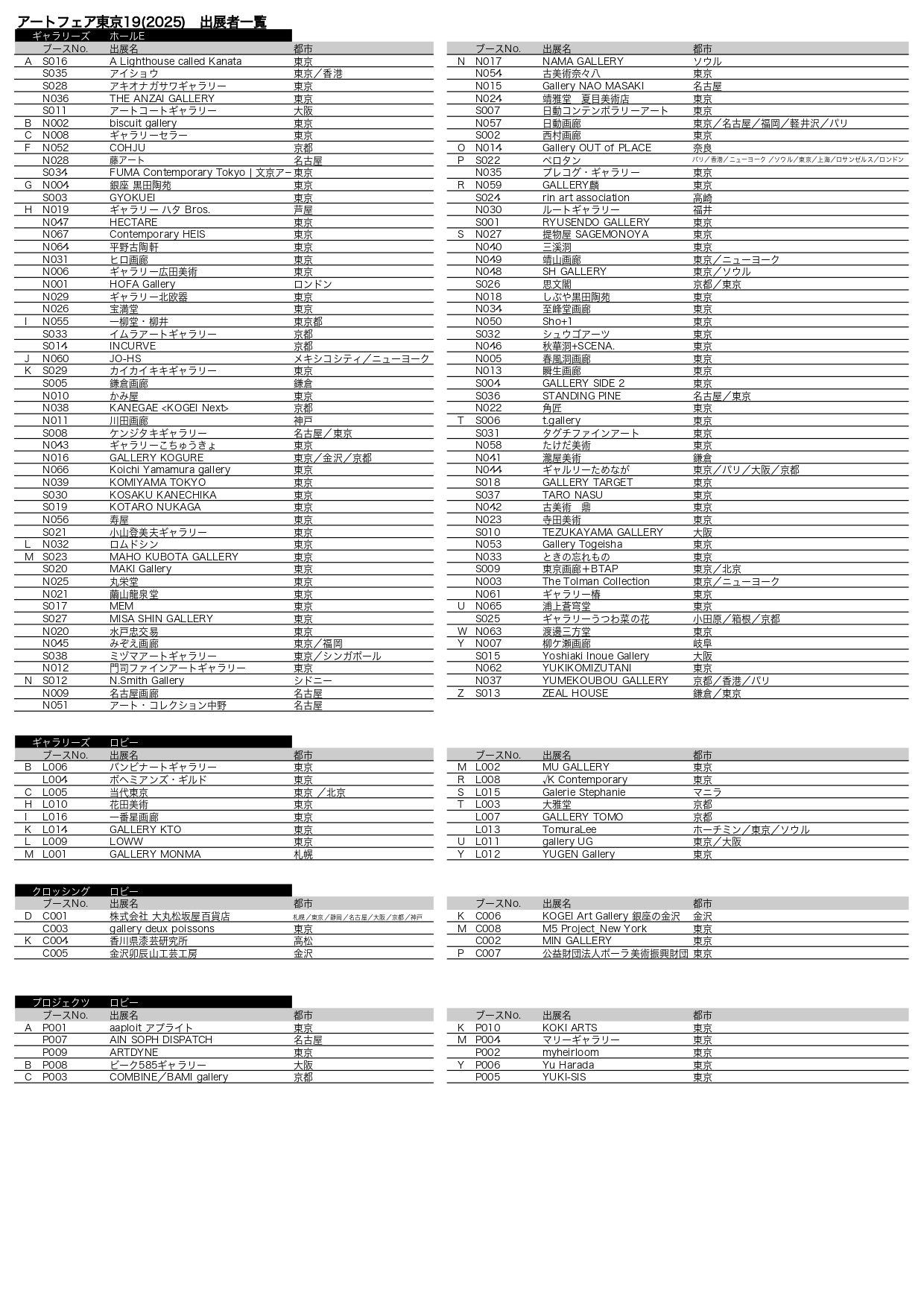 小山登美夫ギャラリー、シュウゴアーツ、MAHO KUBOTA GALLERY、TARO NASU、カイカイキキギャラリー、ケンジタキギャラリー等をはじめとした日本の現代アートシーンを牽引するギャラリーらに加え、ペロタンなど海外のギャラリーらが参加する「ギャラリーズ」においては、日本のアートシーン並びにアートマーケットを展望する機会となるように目指します。
