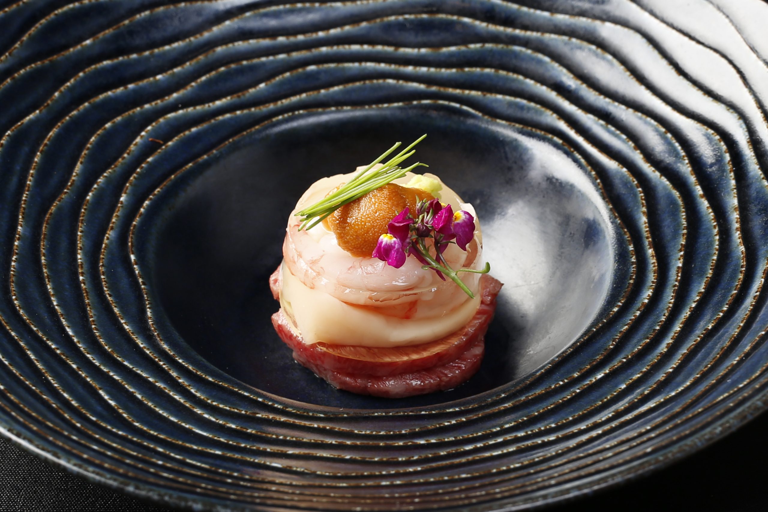 和牛のユッケに甘海老や帆立などの海の幸を重ね、濃厚な雲丹と自家製ジュレで包み込んだ贅沢なひと品。とろけるような和牛の旨みと、海鮮の甘み・磯の香りが一体となり、口に入れた瞬間、奥行きのある味わいが広がります。ジュレが全体をやさしくまとめあげすっきりと引き締めてくれる、まさに”和牛と海鮮のマリアージュ”。