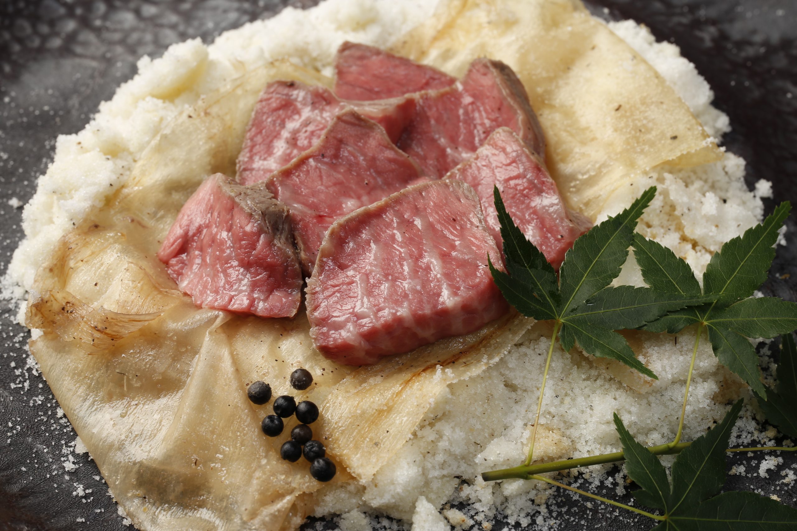 厳選した赤身の和牛を昆布で丁寧に巻き上げ、塩釜でじっくりと焼き上げた、職人の手仕事が光るひと品。塩釜で包み焼くことで肉の水分と旨みを逃さず閉じ込め、ふっくらとジューシーな焼き上がりに。昆布のやさしい香りと塩のミネラルが和牛の赤身のコクと絶妙に調和し、シンプルながら奥行きのある味わいに仕上がっています。