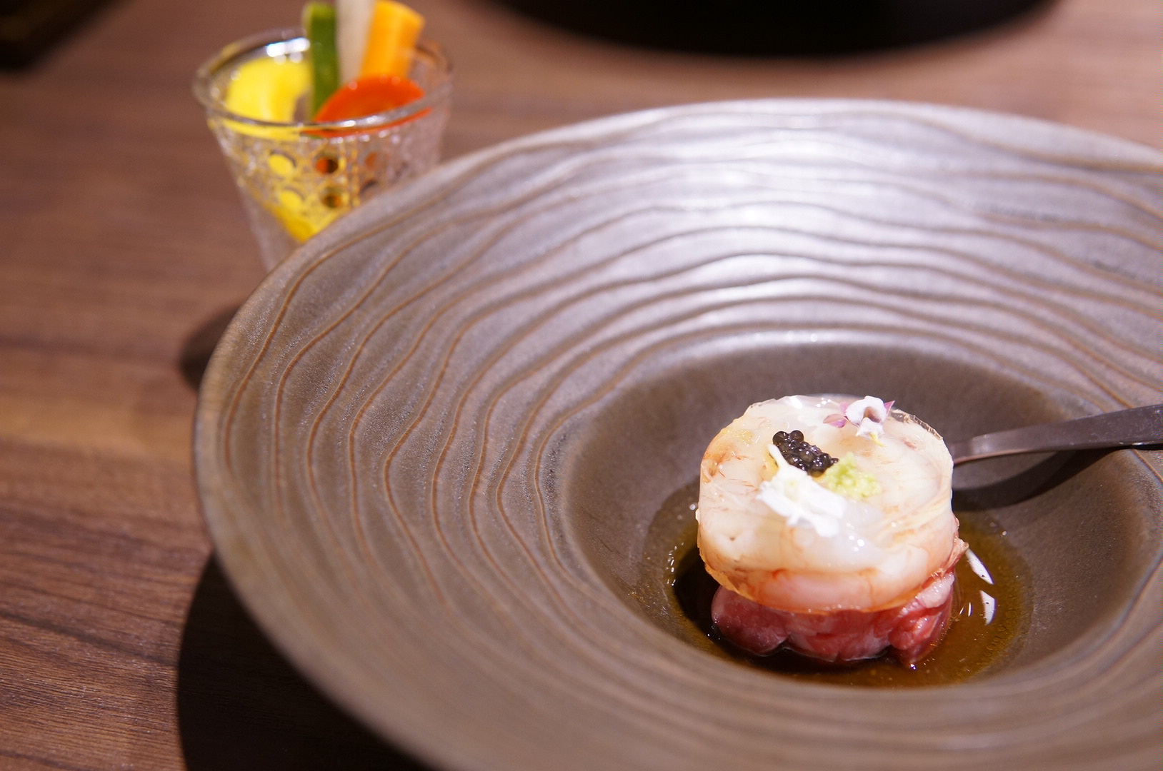 新鮮な和牛のとろける旨みに、濃厚な雲丹と海老と帆立の旨味が凝縮されたジュレが優しく絡み合います。口に含むと海の香りと和牛の甘みが調和し、奥深いコクが広がる逸品。上に添えられたキャビアの塩味と粒感がアクセントとなり、一口ごとに贅沢な余韻をもたらしてくれました。
