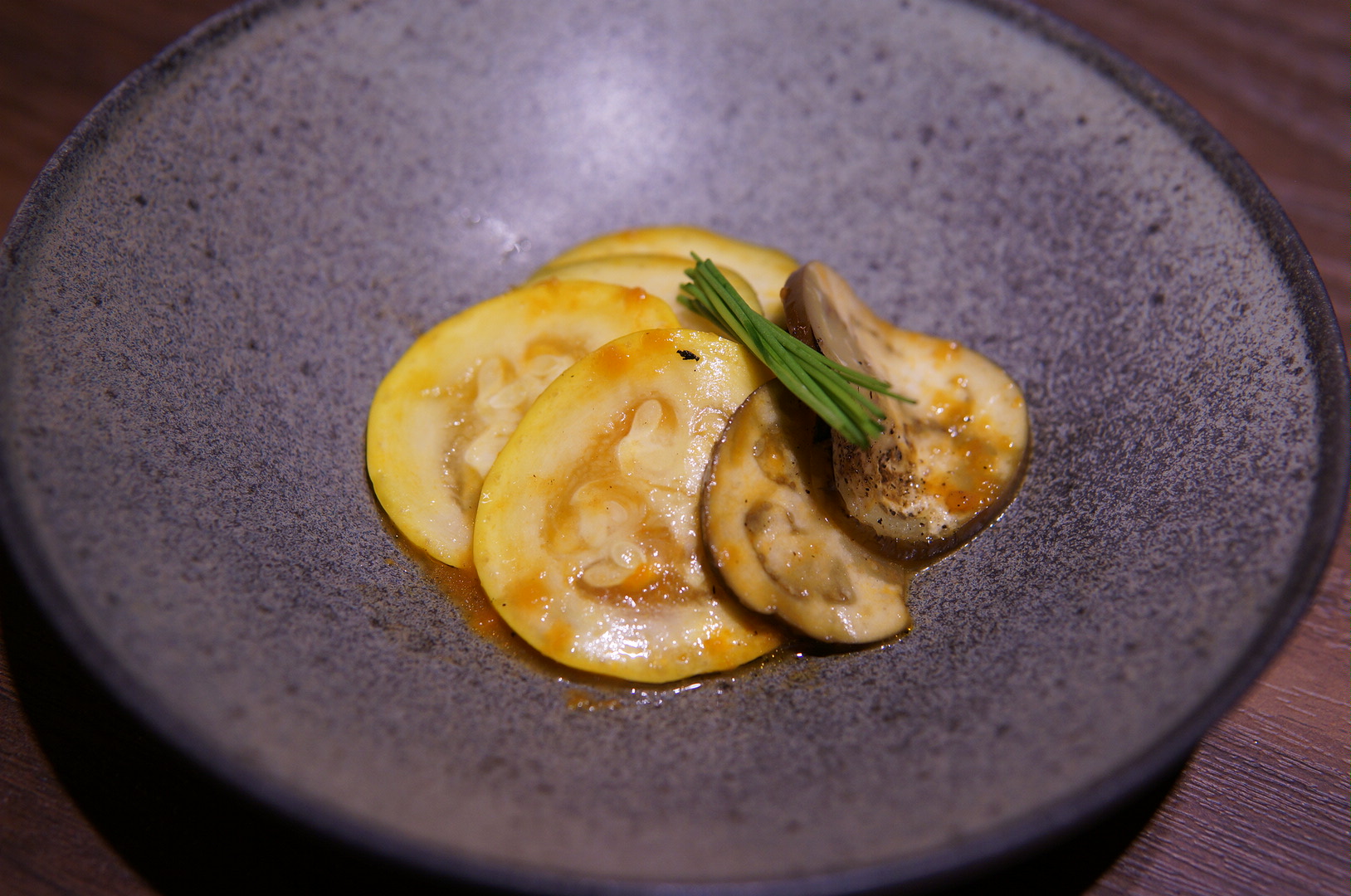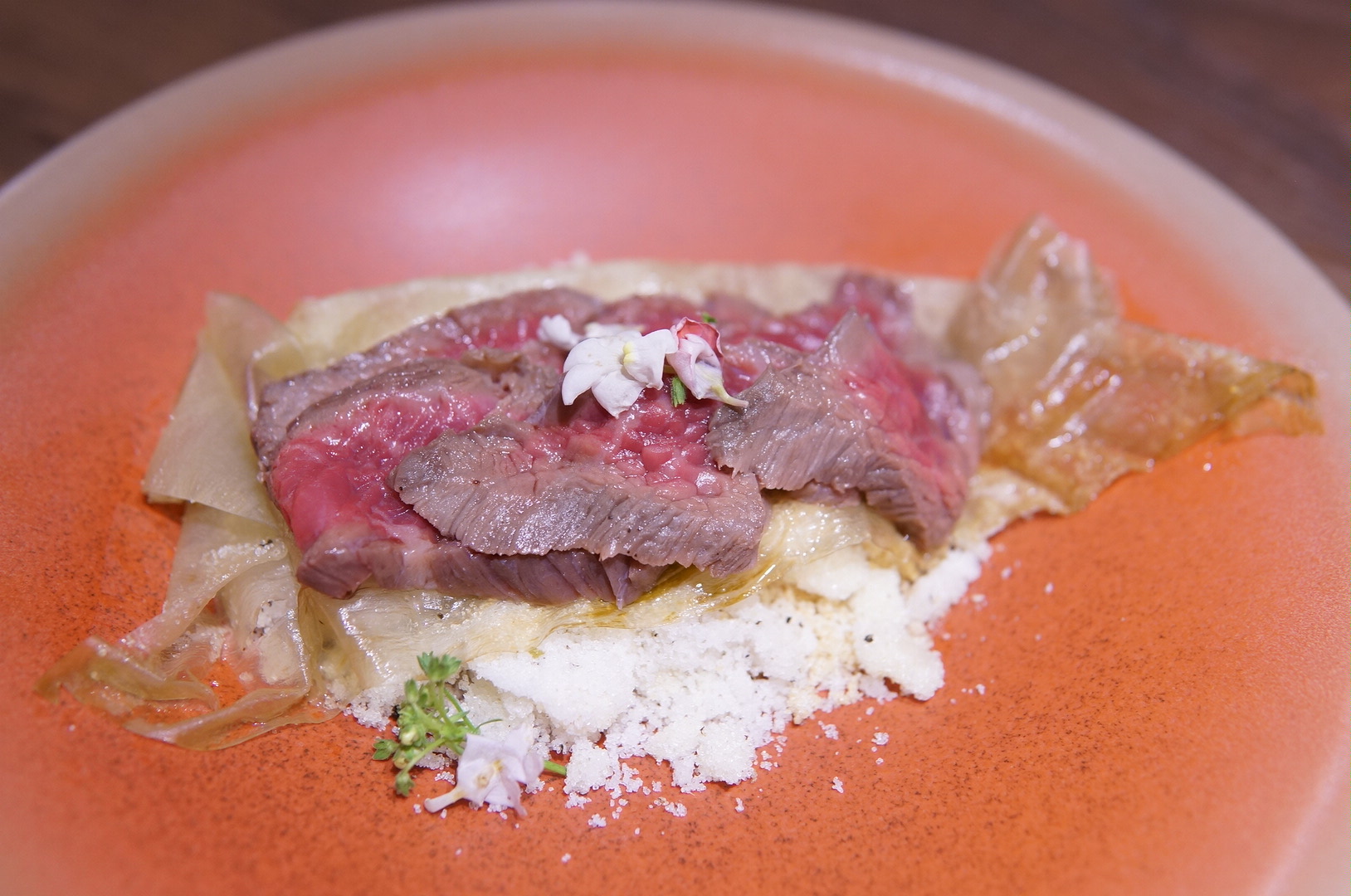 鹿児島黒牛の中でも特に希少なシャトーブリアンを贅沢に厚切りカット。まるで上質なステーキのような存在感で登場します。口に運べば、その肉質は驚くほどきめ細かく、食べた瞬間の柔らかさに感動します。ジューシーでありながら上品な脂が、口の中でふんわりと広がります。添えられた燻製塩が、肉の甘みと旨味を優しく引き立て、味わいのバランスも絶妙。まさに“特別”の名にふさわしい一皿でした。