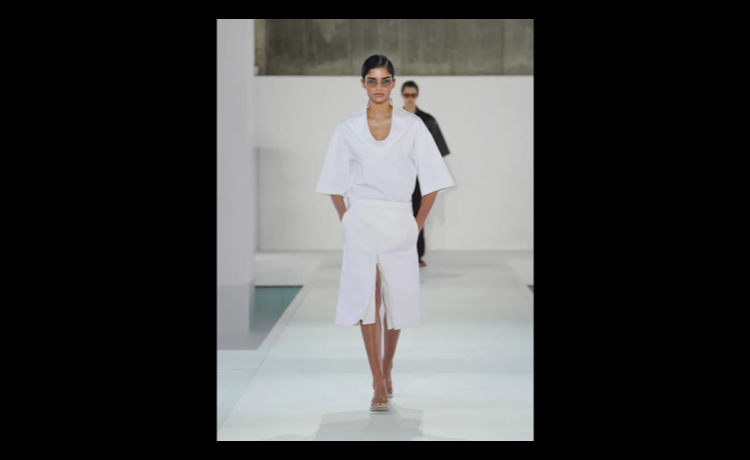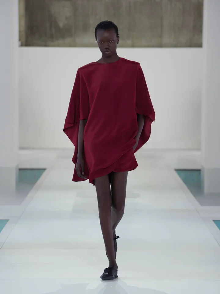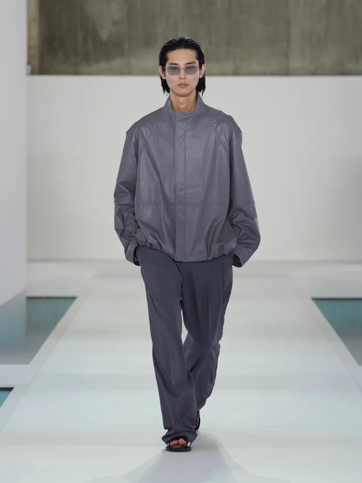 素材への探求は、今シーズンの立体感をさらに際立たせています。レザーやテクニカル素材はほのかな光沢を帯び、意図されたドレープや彫刻的なフォルムを強調。紙のような質感はしわ感のある触覚的な表情をもたらし、リネンのメランジがテクスチャーに奥行きを加えています。ランウェイでは、透け感のある素材が動きの中で身体をほのかに映し出し、軽やかなファブリックが自然に揺れることで、静かな洗練さを感じさせるムードを強調しました。