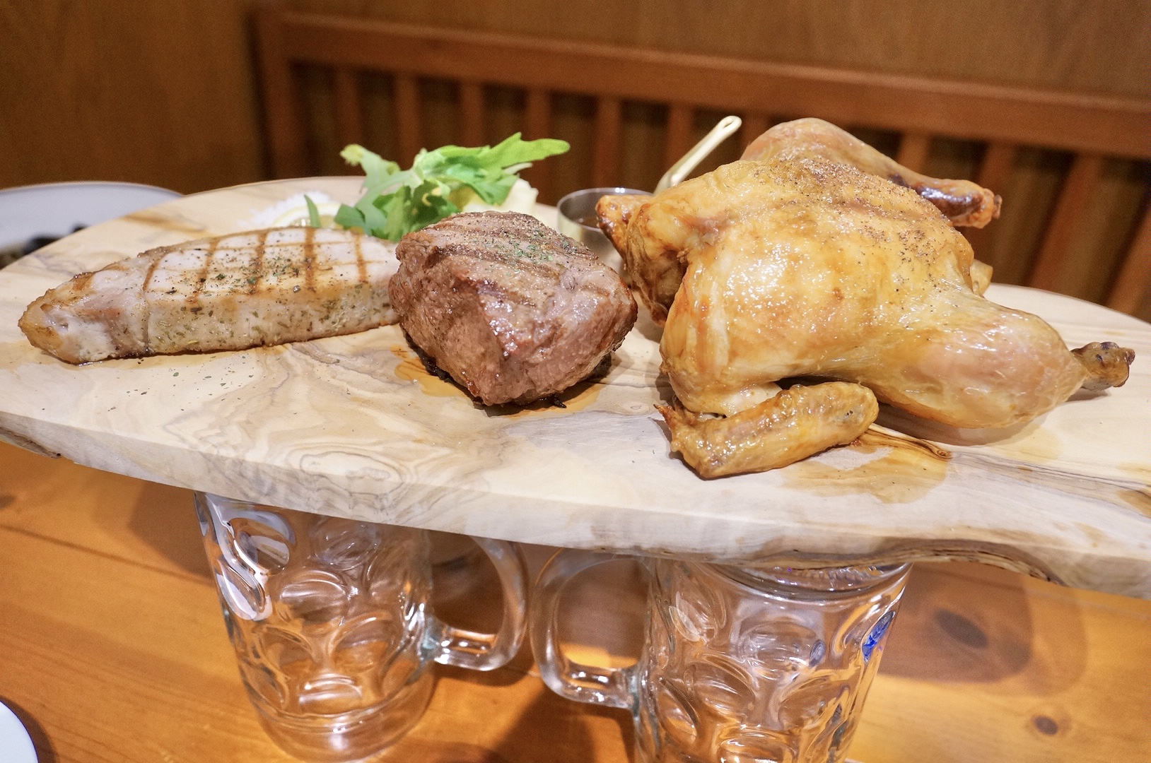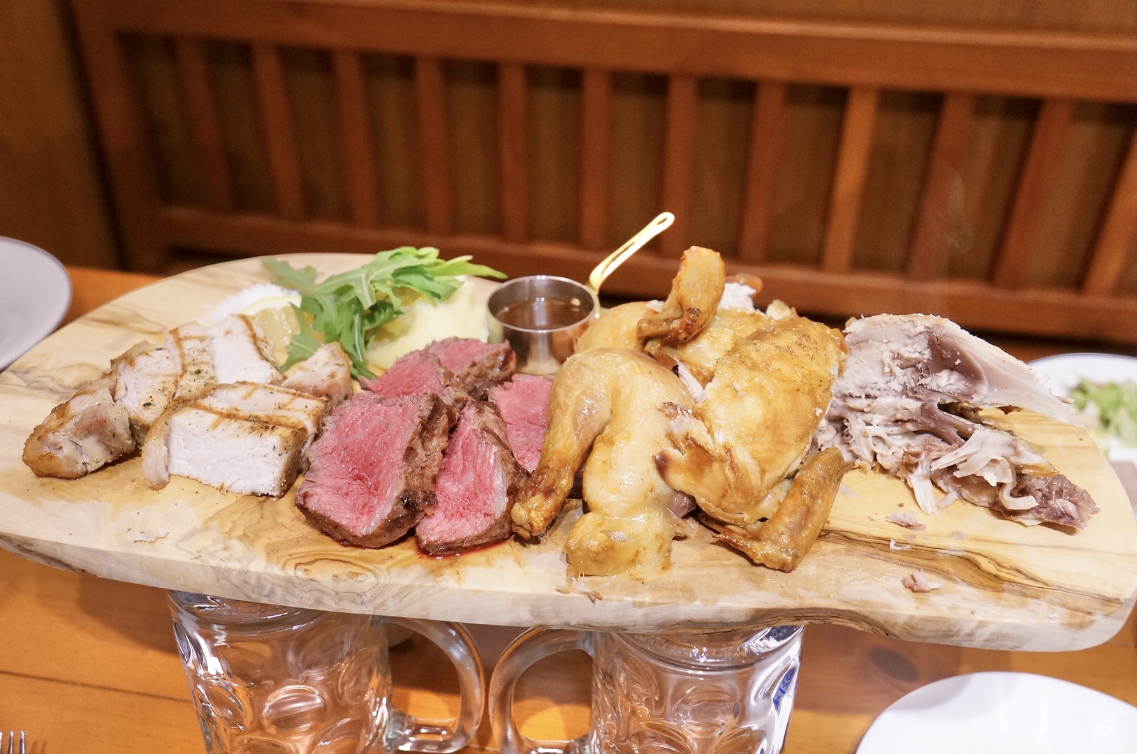 メインとして登場したのは、肉料理を豪快に盛り合わせた名物プレート。中でも印象的だったのがローストチキン。皮はパリッと香ばしく焼き上げられ、中は驚くほどジューシー。これは オクトーバーフェスト でも人気を誇るのも納得の完成度です。ボリュームも申し分なく、シェアしながら楽しむことでより満足感が高まる一皿でした。