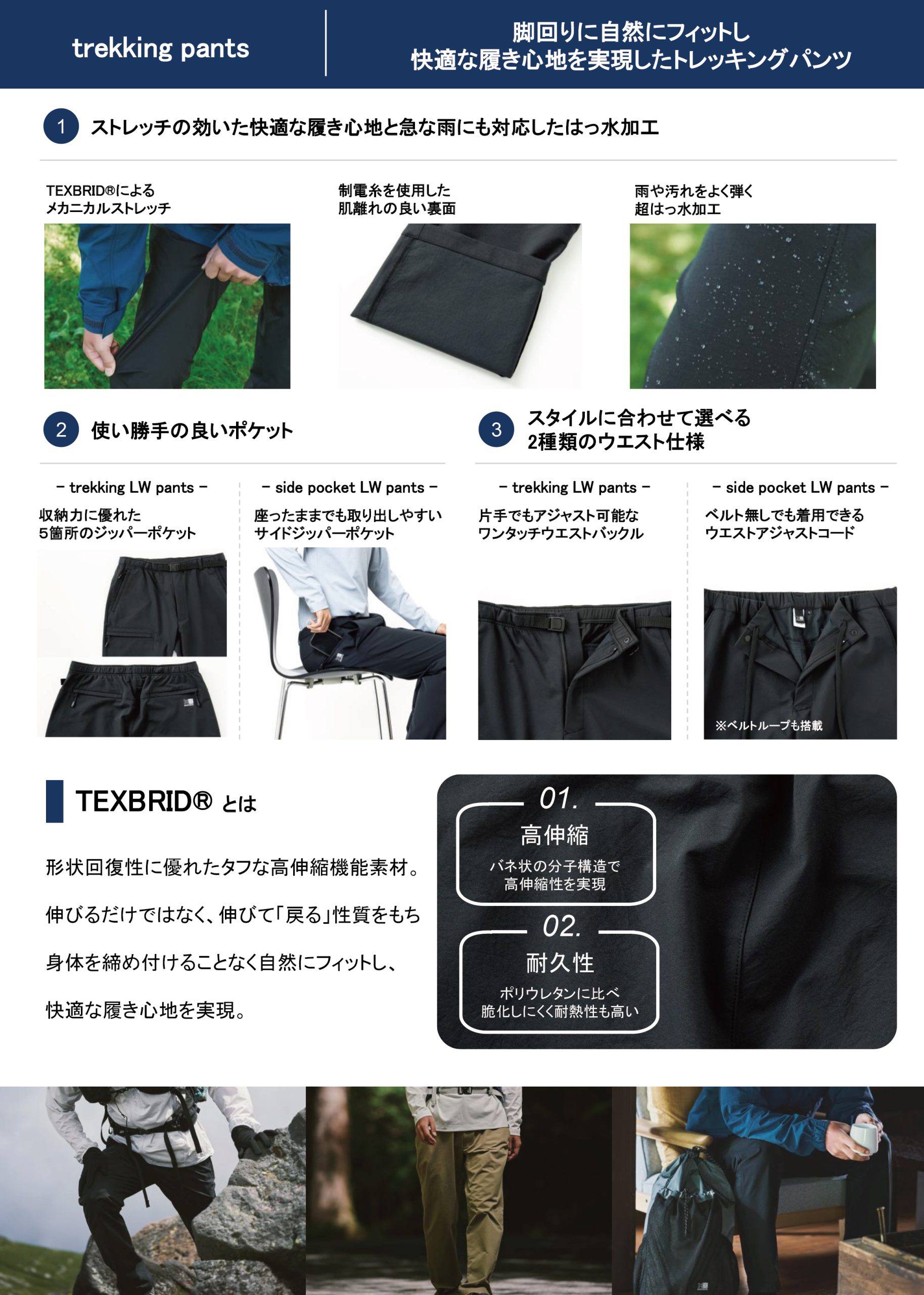 今季のトレッキングパンツは、形状回復に優れ、タフな高伸縮機能性を持つ「TEXBRID®」を採用しています。