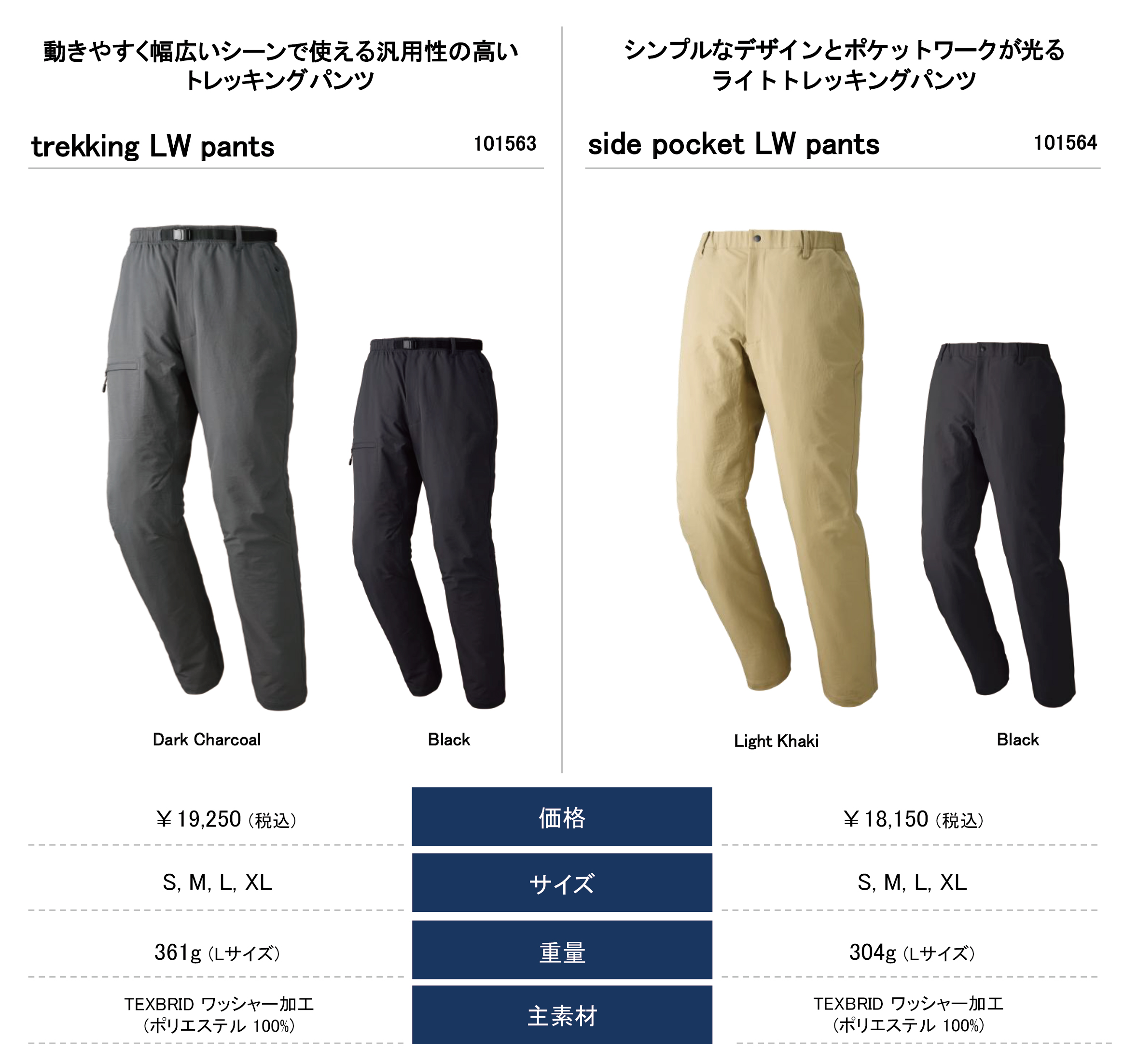 幅広いシーンで汎用性の高い「trekking LW pants」と、より軽量で、座ったままでも物が取り出しやすいポケットを搭載した「side pocket LW pants」の2モデルを展開しています。