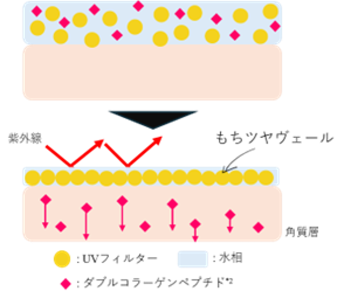 独自開発「マイクロメッシュフィルターテクノロジー」を搭載。UVフィルターを従来の1/20サイズまで超微細化し、肌上にムラなく均一に並べることに成功。肌の上に綿密なヴェールを形成し紫外線をしっかりブロック。さらにダブルコラーゲンペプチド*³が角質層まで浸透します。