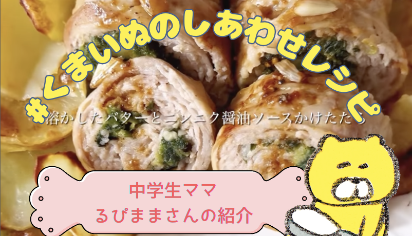 くまいぬのやさしい世界観と、食欲の湧く香りが漂う“簡単豚バラ巻き「和風ポルケッタ」”。