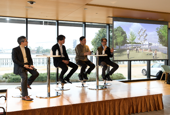 設置を記念して、3月13日(金)に三井リンクラボ新木場3コミュニケーションラウンジにてトークセッション『新木場で考える アート×サイエンス イノベーションを生み続ける街へ』を一般社団法人ライフサイエンス・イノベーション・ネットワーク・ジャパン( 以下「LINK-J」)共催にて実施。イベント当日には、E&K Associates代表の長谷川一英様をモデレーターに迎え、名和晃平様、三井リンクラボ新木場2に入居されている株式会社Dioseve代表取締役社長の岸田和真様、当社常務執行役員イノベーション推進本部長の山下和則が登壇。彫刻作品のお披露目とともに、サイエンスとアート思考の共通点や産業とアートが融合することで生まれる新しいイノベーション環境、そして三井不動産が描く次世代のまちづくりの可能性について語りました。