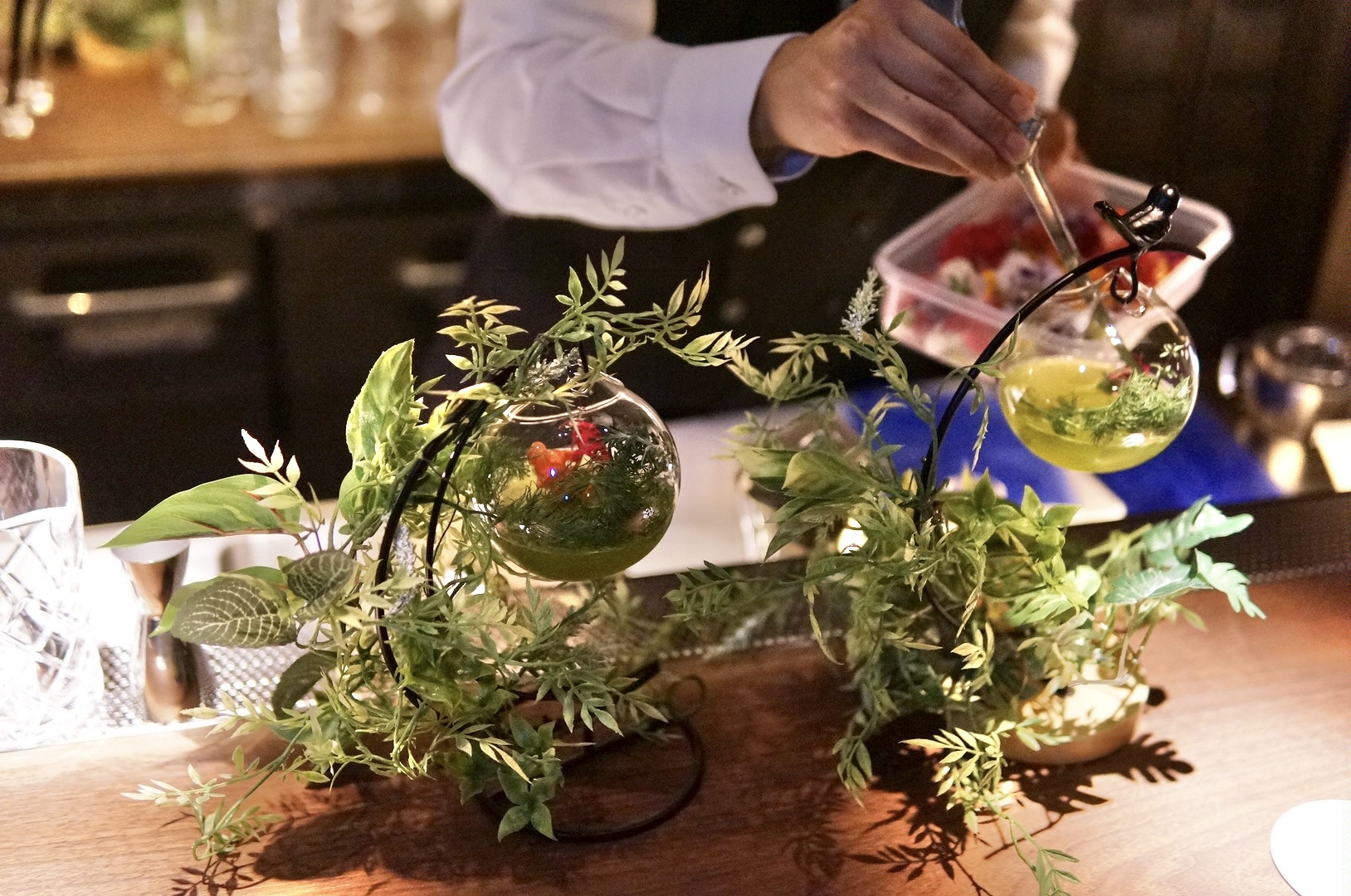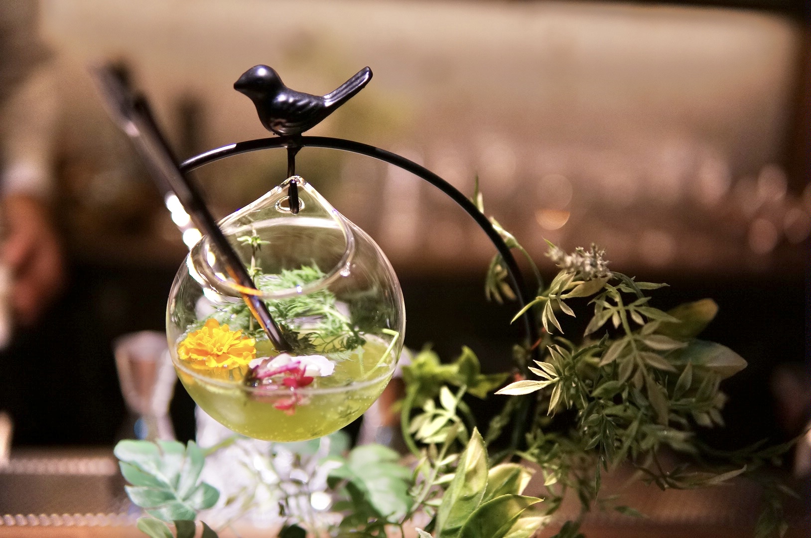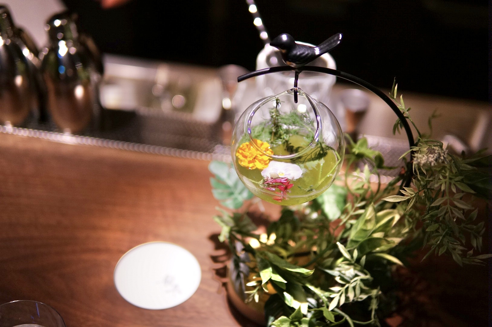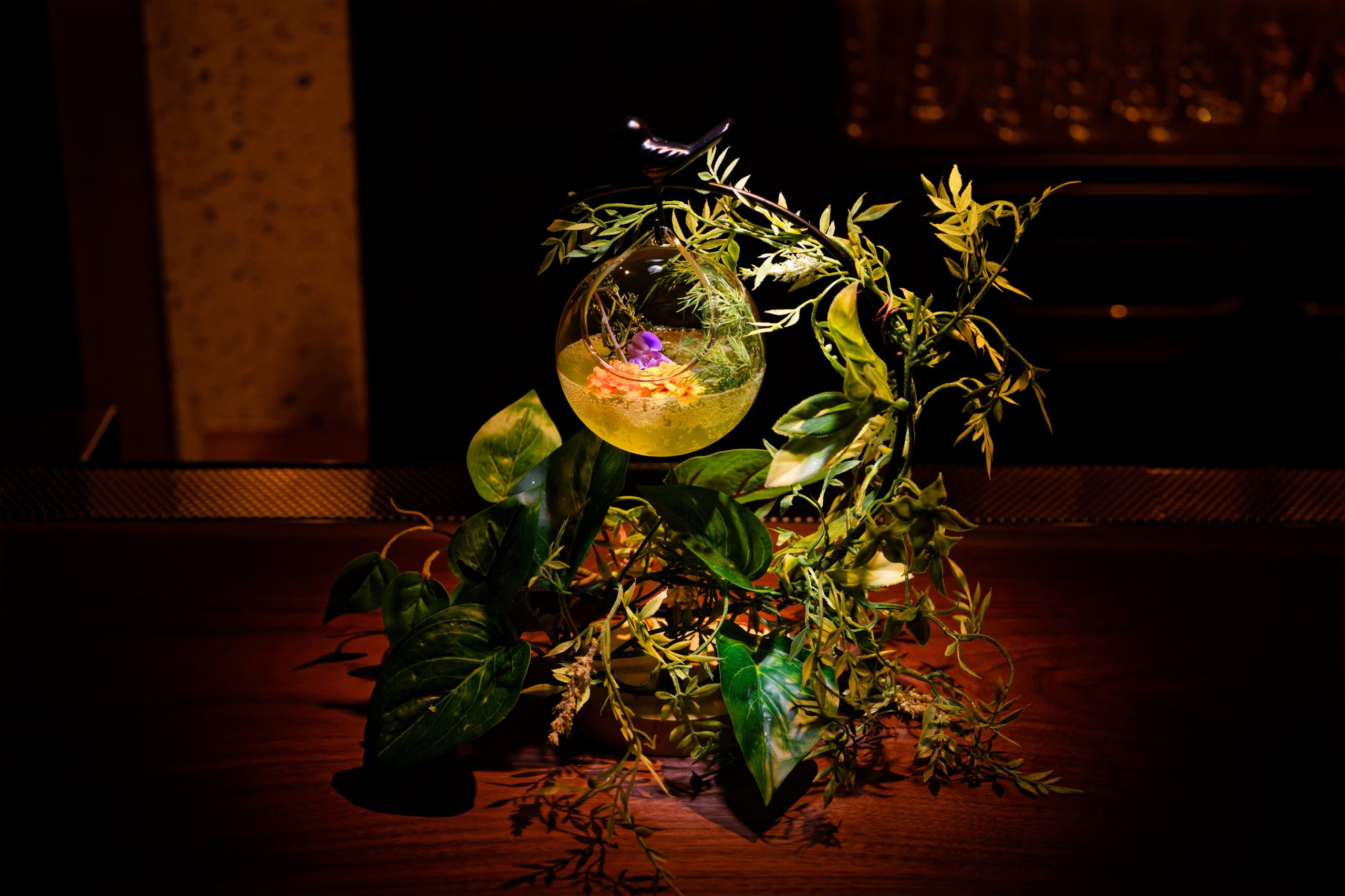 木々をイメージした器は、マスター自らがひとつひとつ手作業で仕上げています。“箱根の森でメジロが羽を休めるように、訪れる人にも穏やかなひとときを感じてほしい”そんな想いが込められたオリジナルカクテル。ストローを通してそっと口に含むと、ウィスキーベースならではの深みと丸みのあるコクが、まるで森を吹き抜けるやわらかな風のように広がり、後からキンモクセイの甘く優しい香りがそっと包み込みます。華やかさの中にどこか安らぎを感じさせる、心をそっと整えてくれる一杯でした。