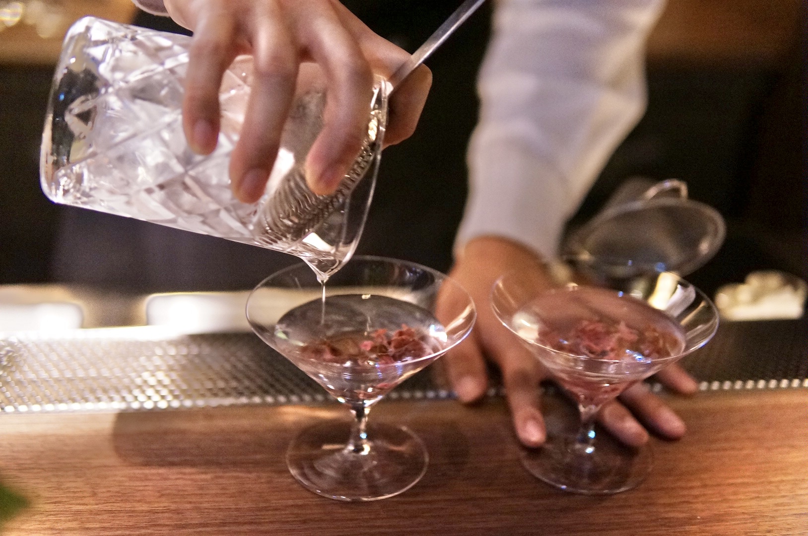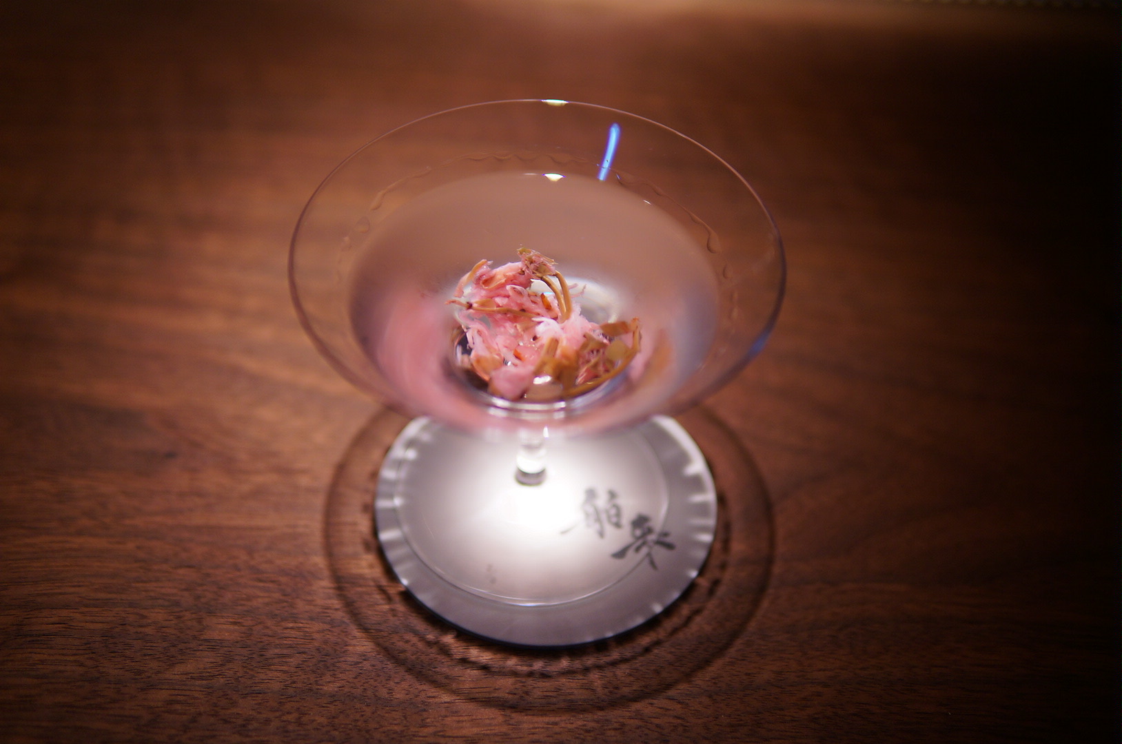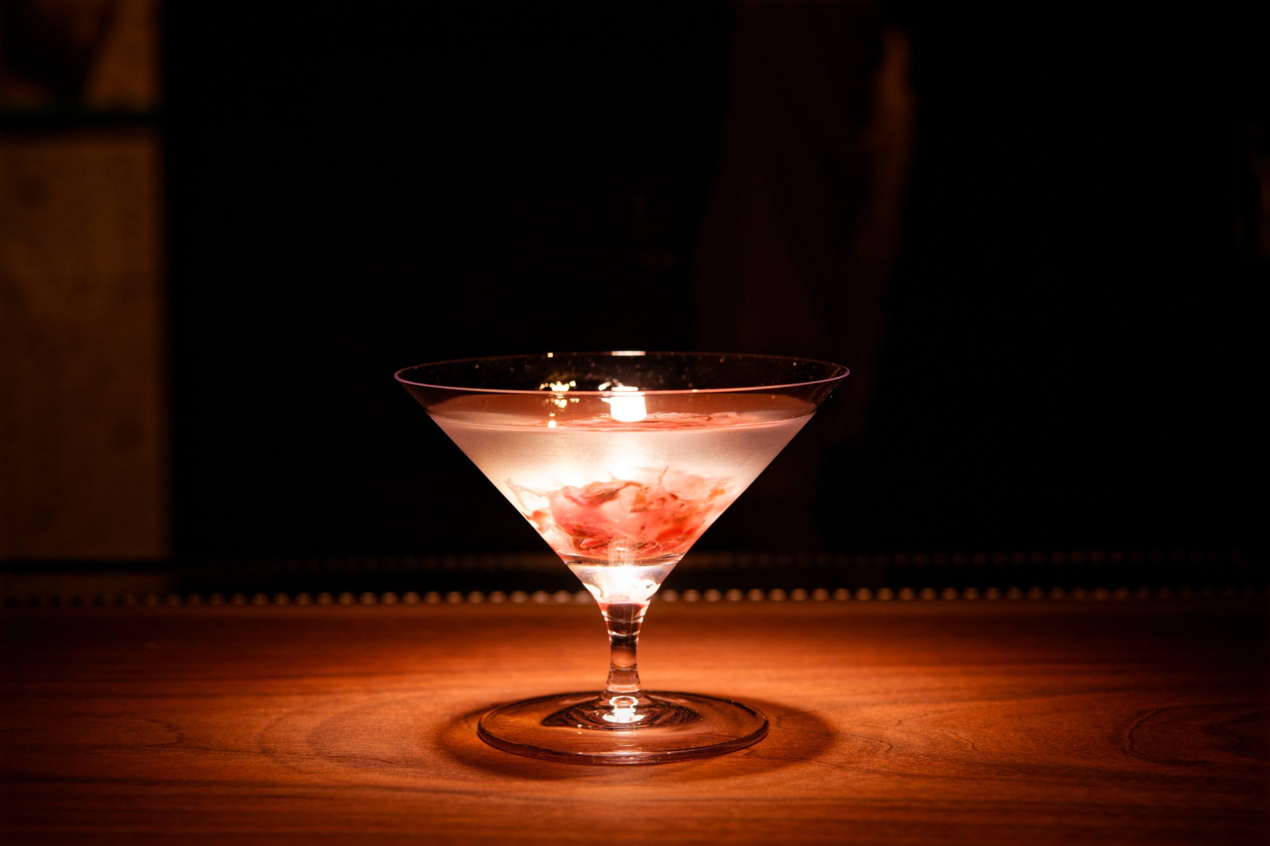 グラスを傾ける前から、ふわりと漂う桜の香りが心地良く、ひと口含むと、マティーニ特有のシャープなキレの中に、花びらのように繊細で淡い甘みがそっと広がり、続いて白檀の上品で落ち着いた香りが余韻を包み込みます。時間の経過とともに、塩漬けされた桜のほのかな塩味が溶け出し、味わいに奥行きと旨みを加えていきます。華やかでありながらどこか凛とした佇まいを感じさせる、和の美意識をまとったマティーニです。