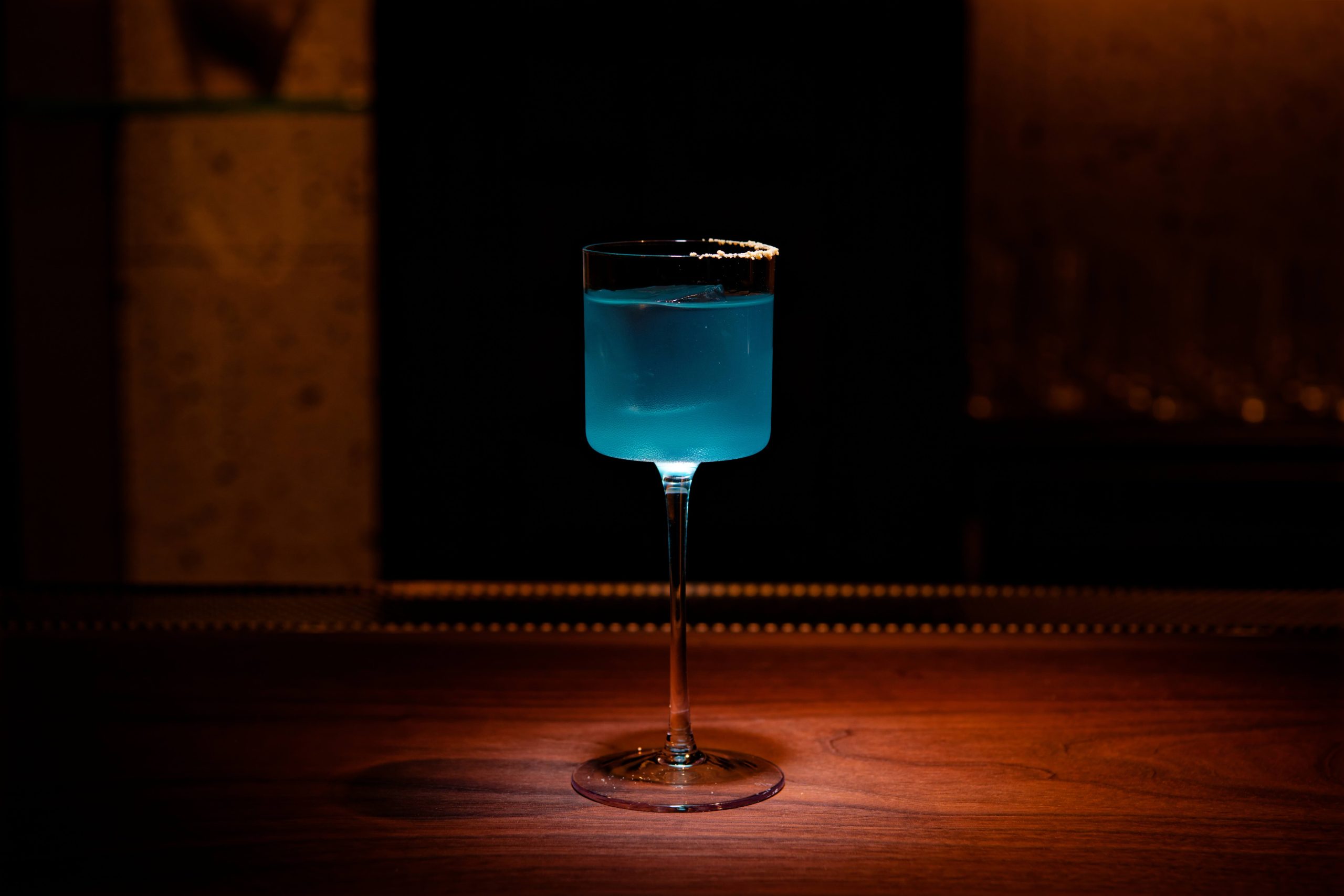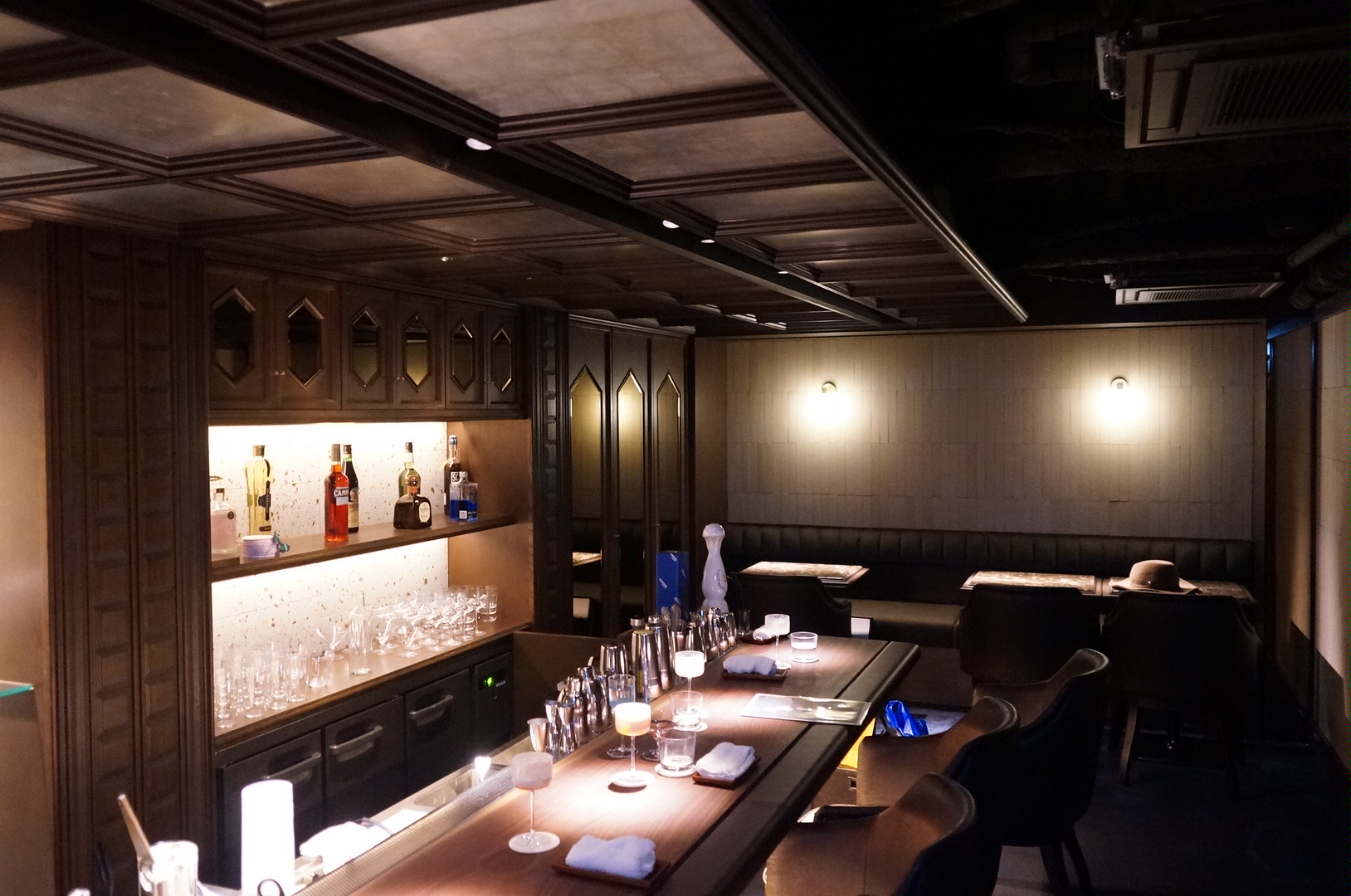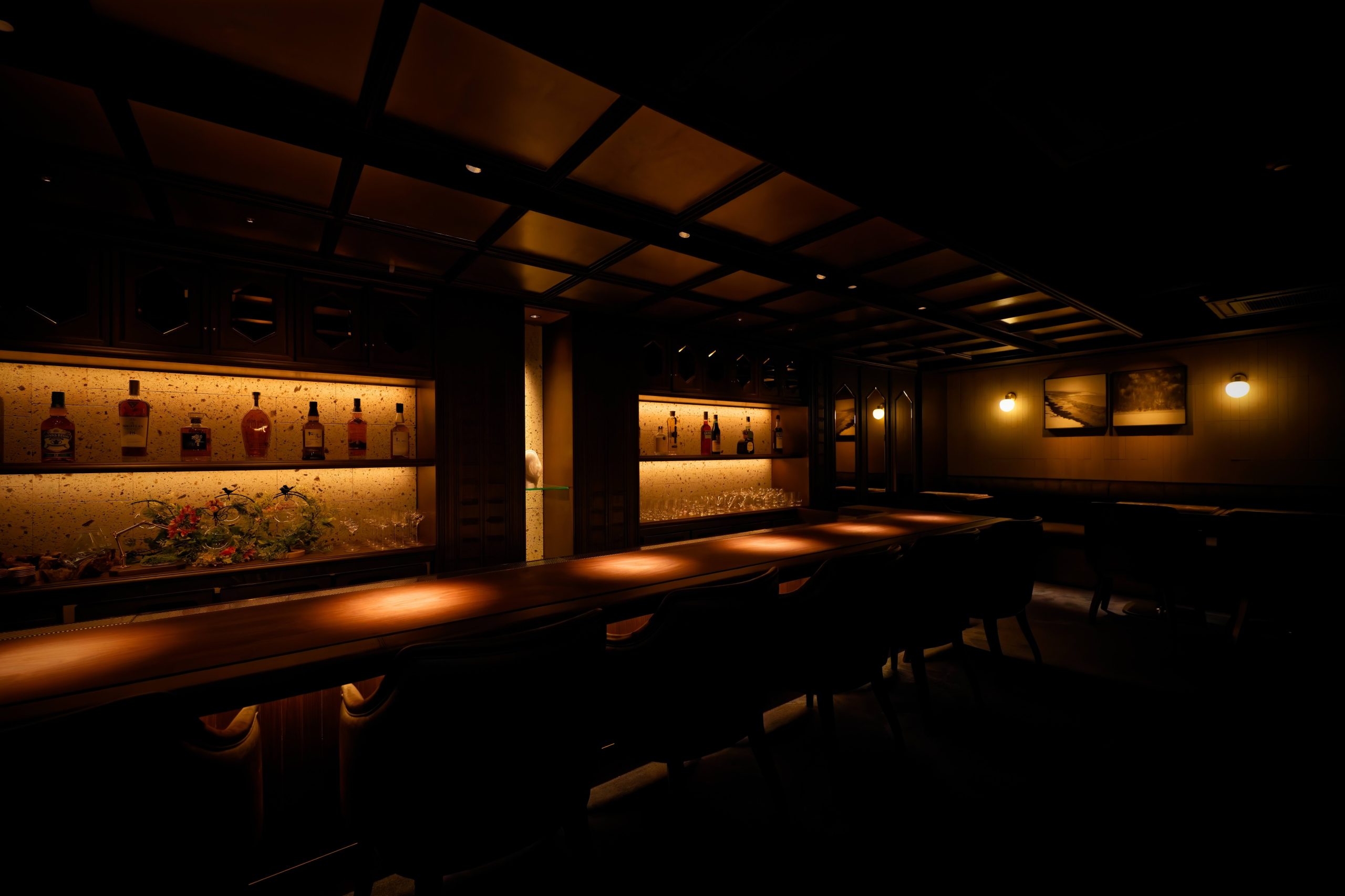 薄暗く落ち着いた店内は、ムードあふれる大人の空間が漂い、ゆったりとした時間が楽しめます。バーカウンターには計算されたライティングが施され、グラスが美しく光を纏うように演出。一杯のカクテルをより一層特別なものへと引き立ててくれます。