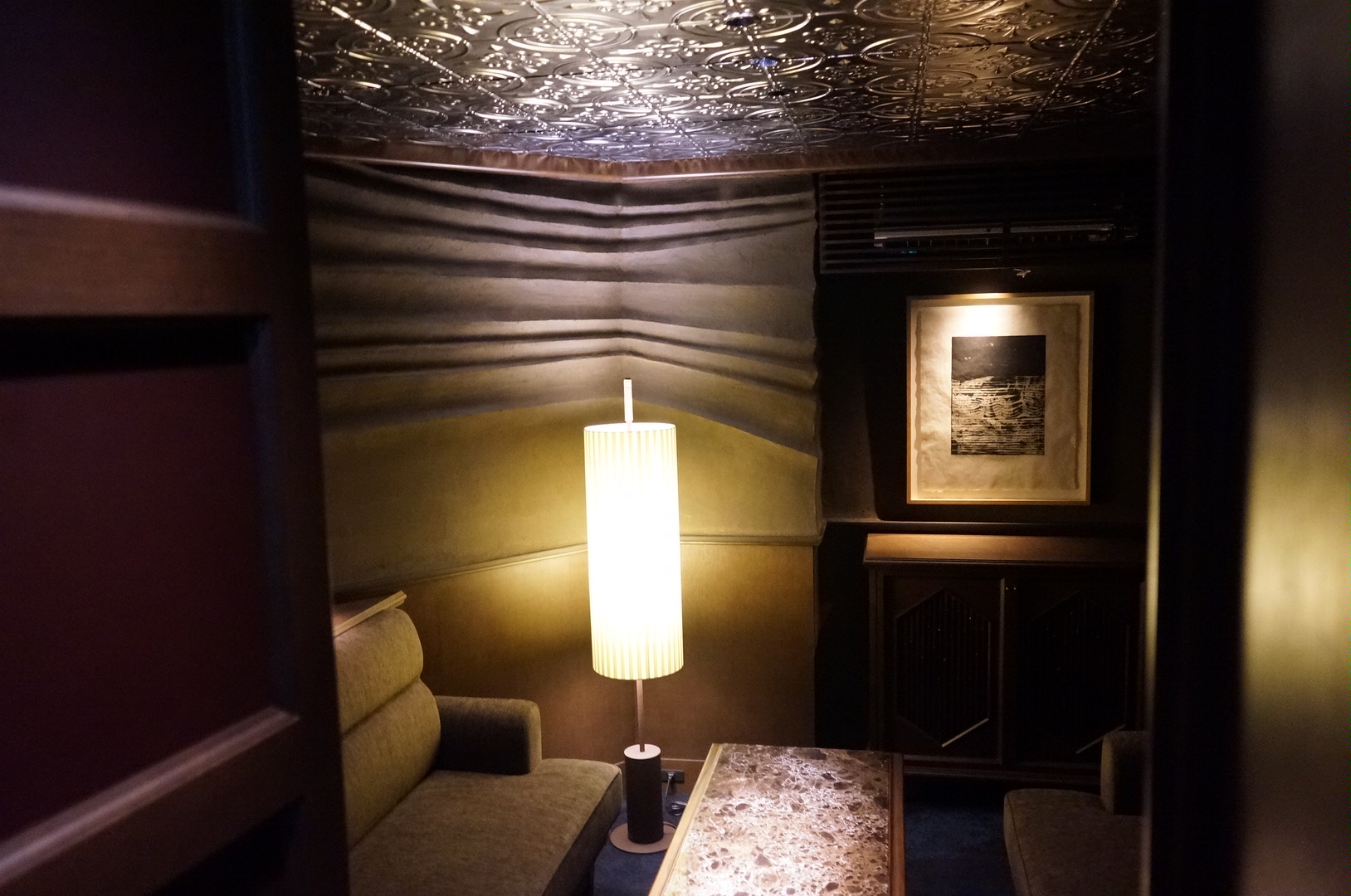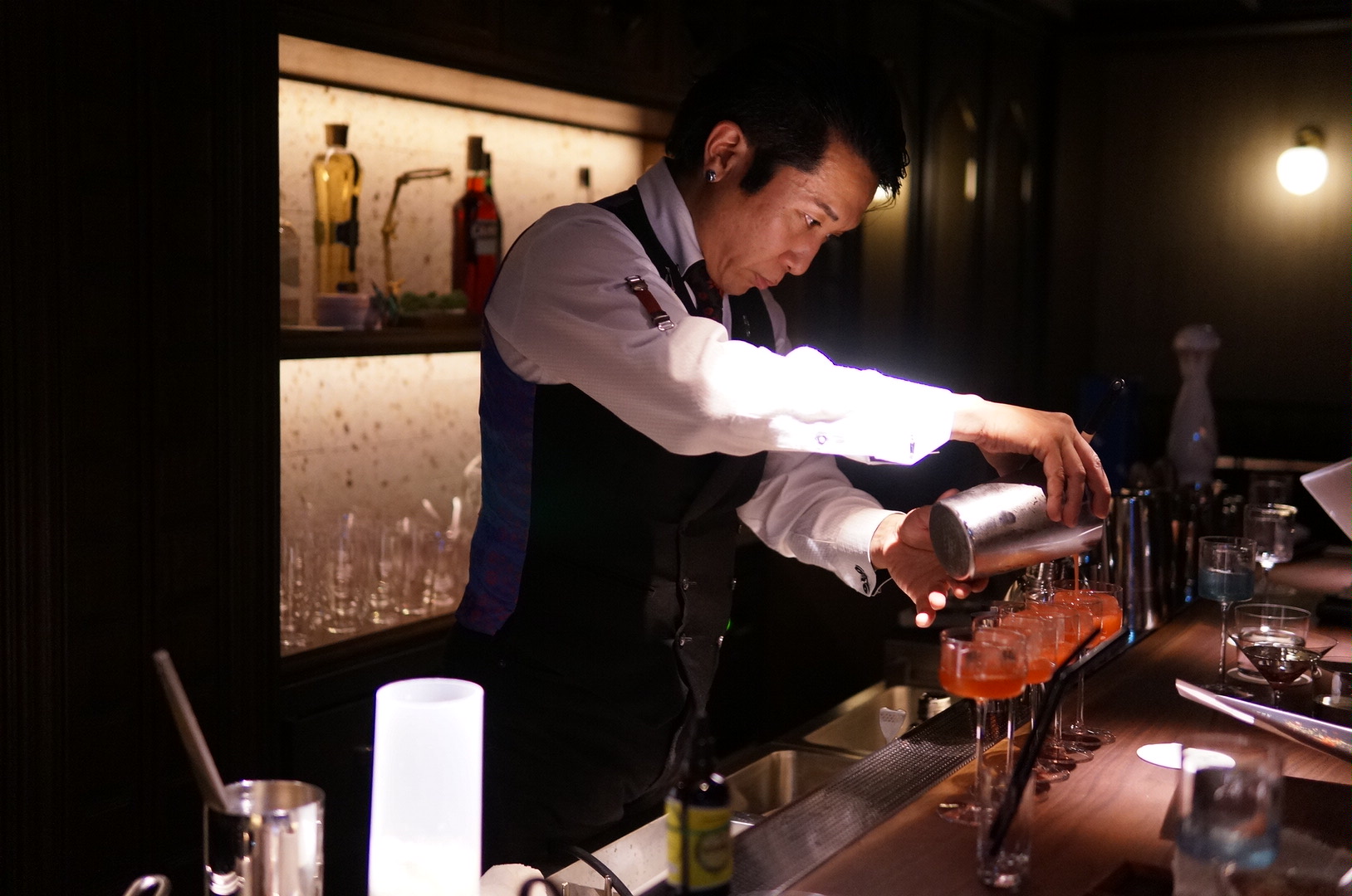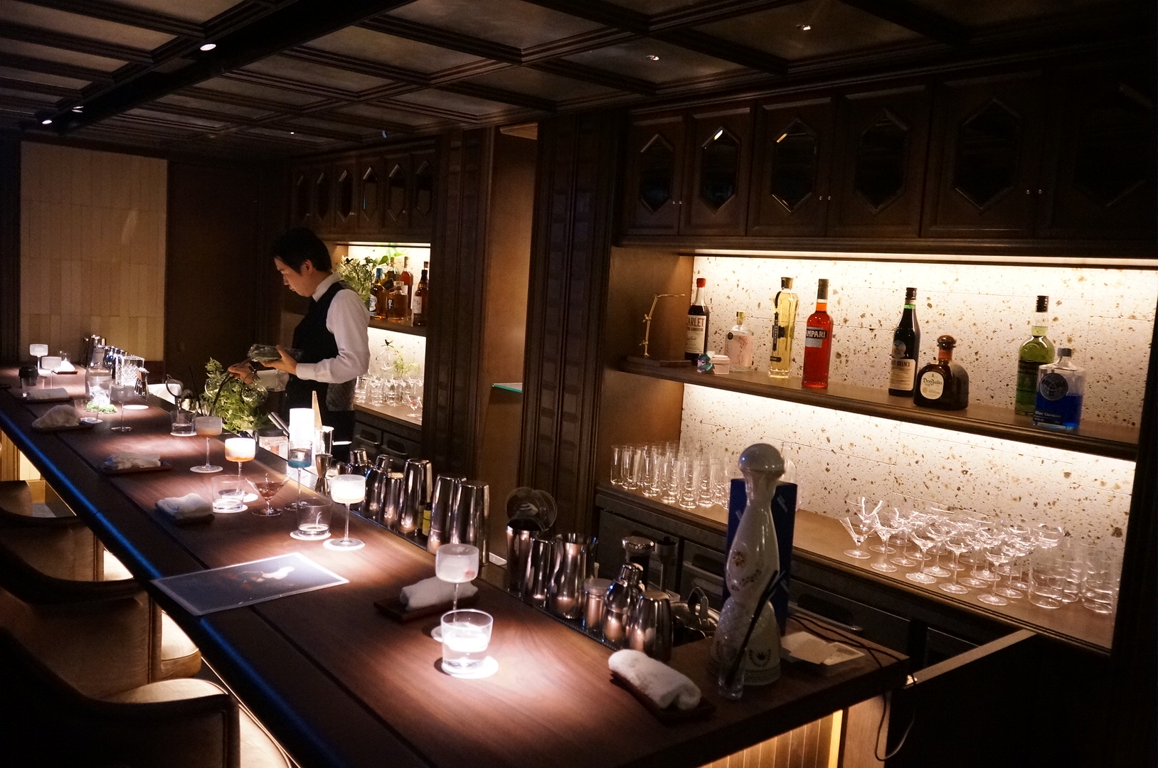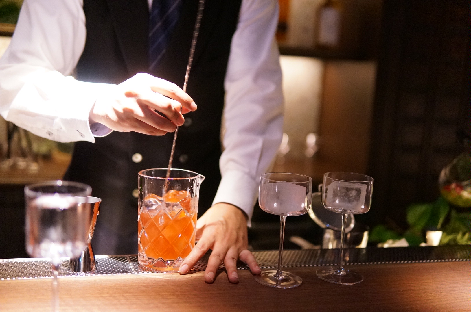 薄暗く落ち着いた店内は、ムードあふれる大人の空間が漂い、ゆったりとした時間が楽しめます。バーカウンターには計算されたライティングが施され、グラスが美しく光を纏うように演出。一杯のカクテルをより一層特別なものへと引き立ててくれます。