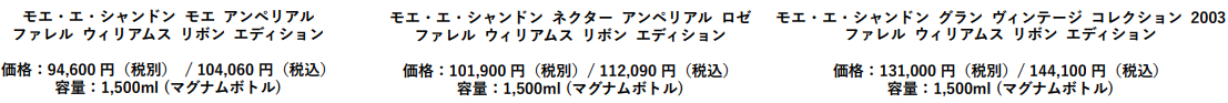 また、ファレル・ウィリアムスがデザインした1.5Lのマグナムボトル「リボン エディション」も、ポップアップストアだけで数量限定で発売いたします。ボトルネックを飾るパールビーズをあしらった特大のリボンは、アクセサリーとしても使えるファッショナブルなアイテム。「モエ アンペリアル」、「ネクター アンペリアル ロゼ」、「グラン ヴィンテージコレクション 2003」の3種類で登場します。ポップアップストアだけで出会える貴重なコレクションアイテムをお見逃しなく。