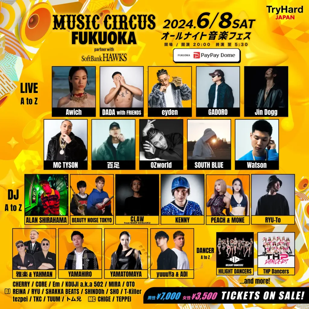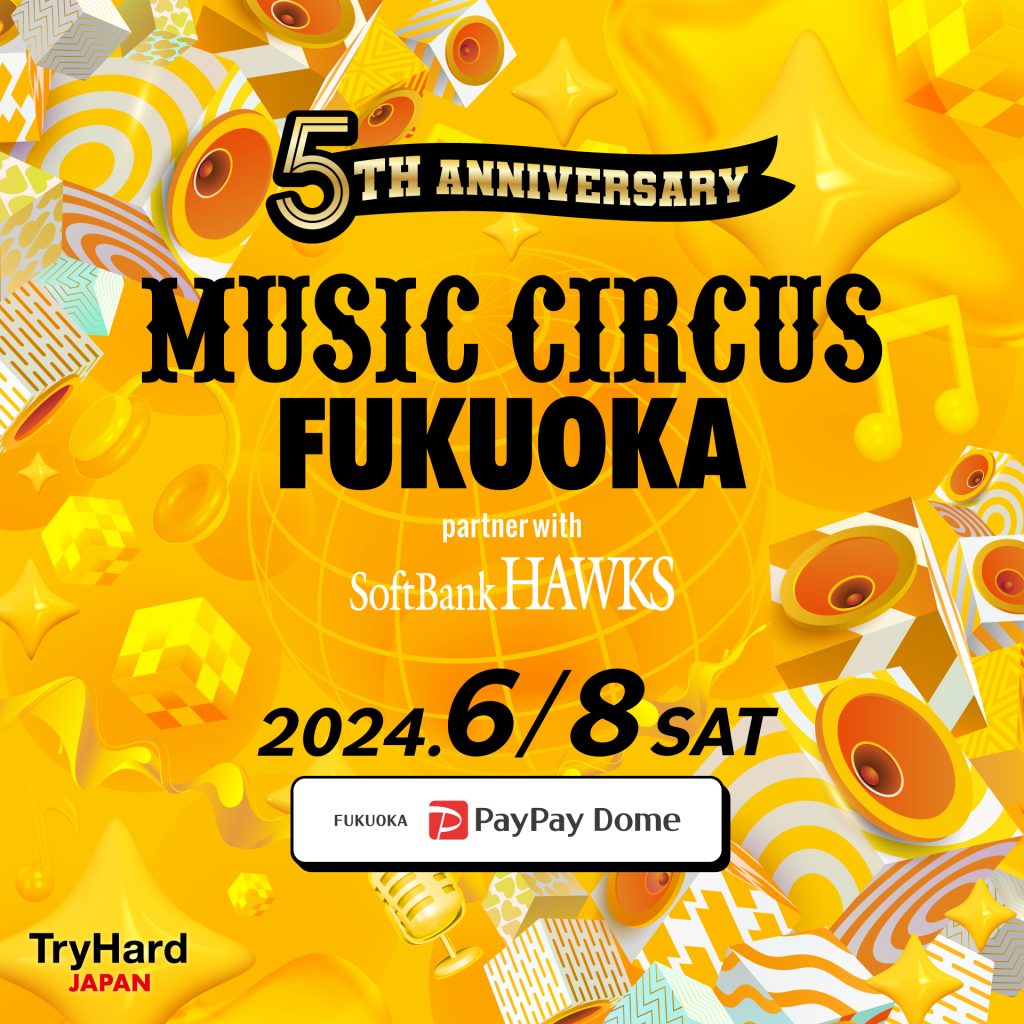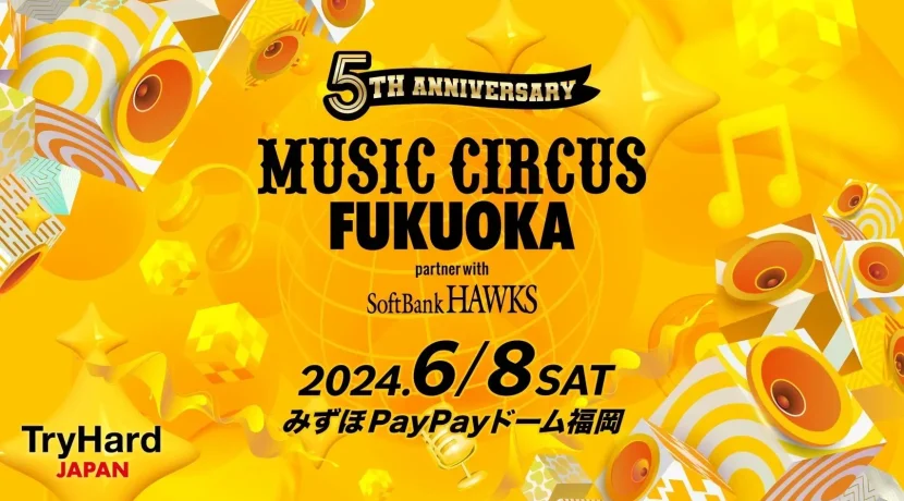 株式会社トライハードジャパンと福岡ソフトバンクホークス株式会社は、オールナイト音楽フェスティバル「MUSIC CIRCUS FUKUOKA partner with SoftBank HAWKS」を2024年6月8日(土)に開催します。