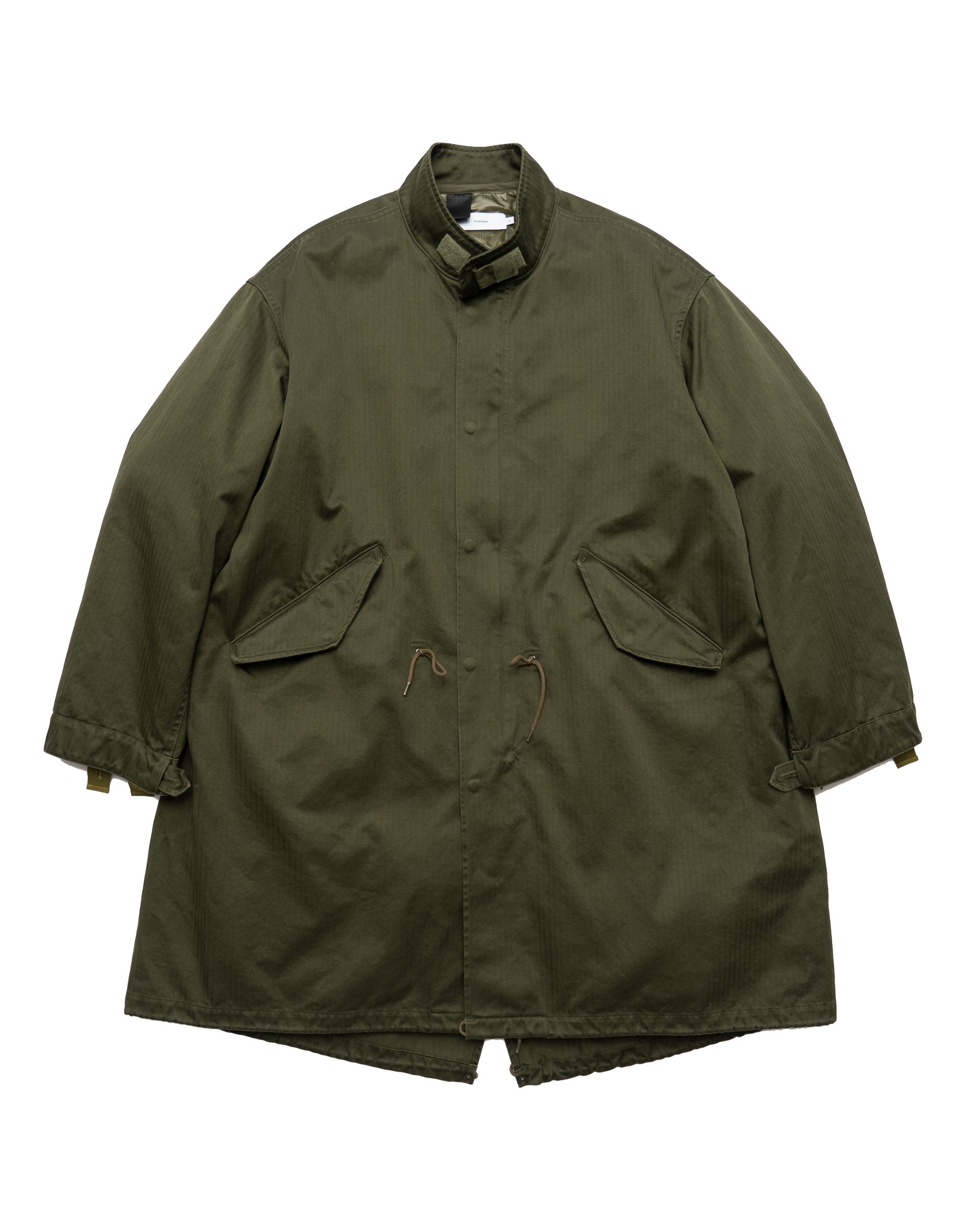 N.HOOLYWOOD TEST PRODUCT EXCHANGE SERVICE の名作である 2WAY 仕様の M-65 をベースに、Graphpaper オリジナルのヘリンボーン生地で再構築した “Fishtail Mods Coat” は、アイコニックなディテールを踏襲しつつ、フードを排したミニマルなデザインへアップデート。脱着式ライナーには PERTEX® QUANTUM とリップストップ、PRIMALOFT® を採用し、撥水性・断熱性・軽量性を備えた都市生活に適した一枚に仕上げました。