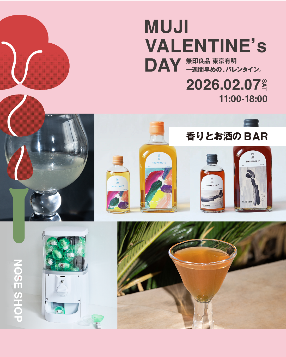 “香水砂漠”と呼ばれる日本の香水市場に一石を投じ、「他の誰でもない、あなたの鼻が主役のお店。」というコンセプトで、2017年の8月にスタートした日本初のニッチフレグランス専門店「NOSE SHOP(ノーズショップ)」は、無印良品 東京有明にて開催されるイベント「MUJI VALENTINE’S DAY」へ2026年2月7日(土)出店します。
