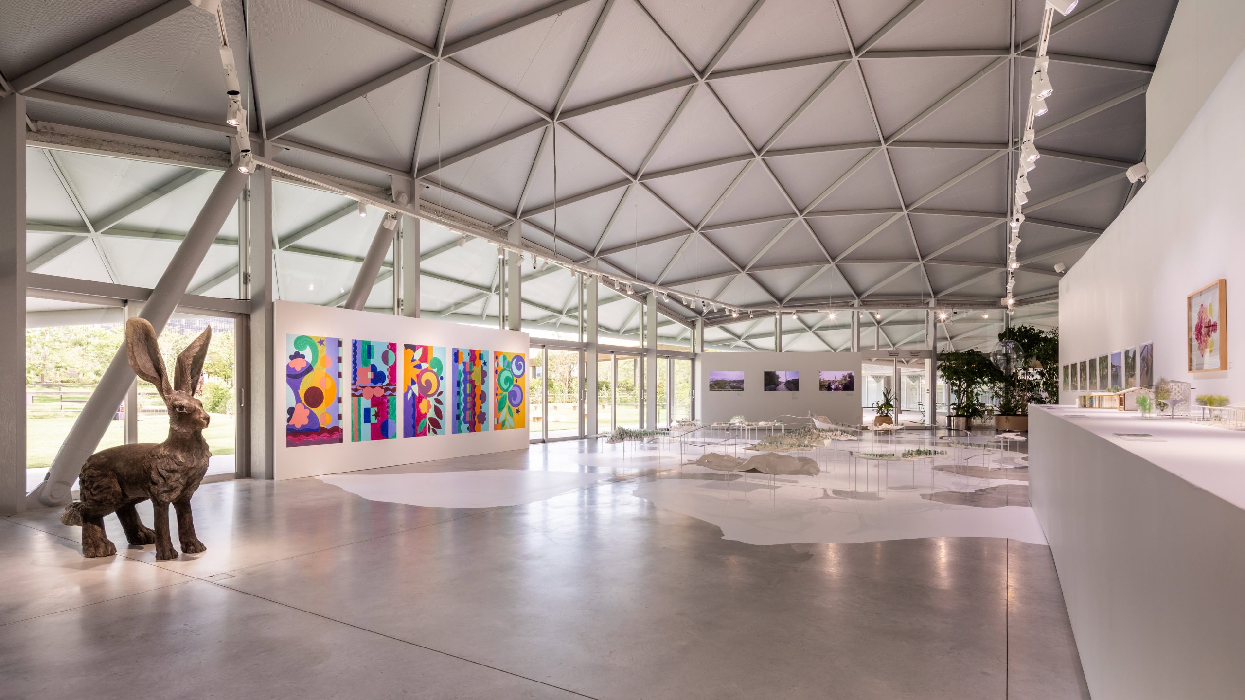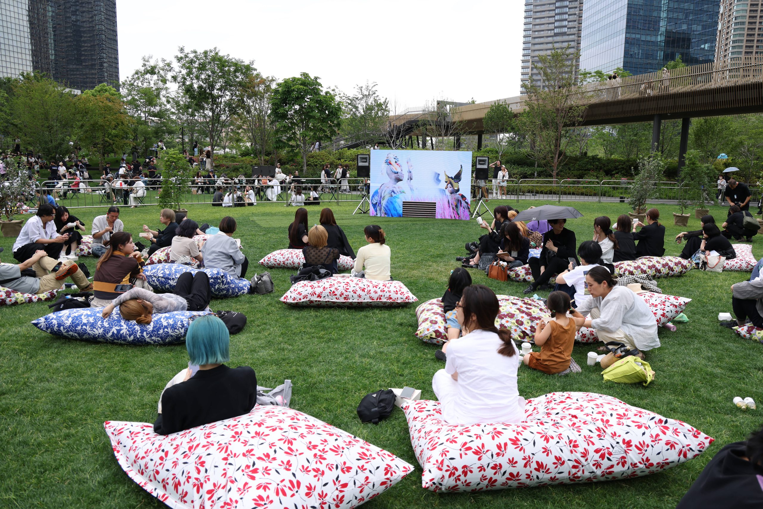 うめきた公園は2024年秋にオープンした、大阪の中心部に位置する公園です。西日本最大のターミナル駅である大阪駅に直結しており、面積45000平方メートルを誇るこの公園は大規模ターミナル駅直結の都市公園として世界最大級です。「PRADA MODE 大阪」は、公園内にあるSANAA設計の大屋根施設で開催されました。大屋根施設は、半野外の広場、インフォメーション、カフェの3つのスペースが屋根の起伏に合わせて配置されています。