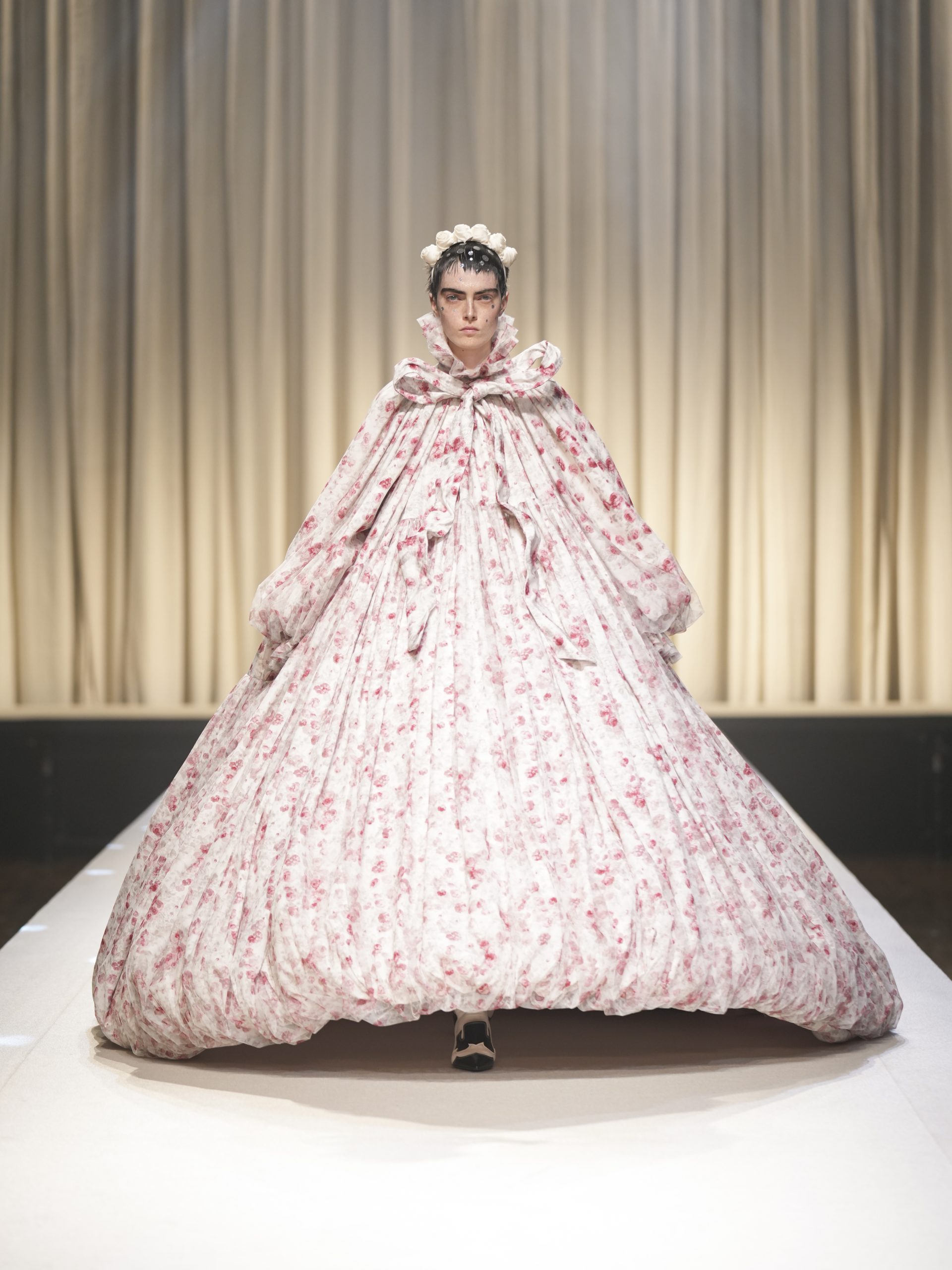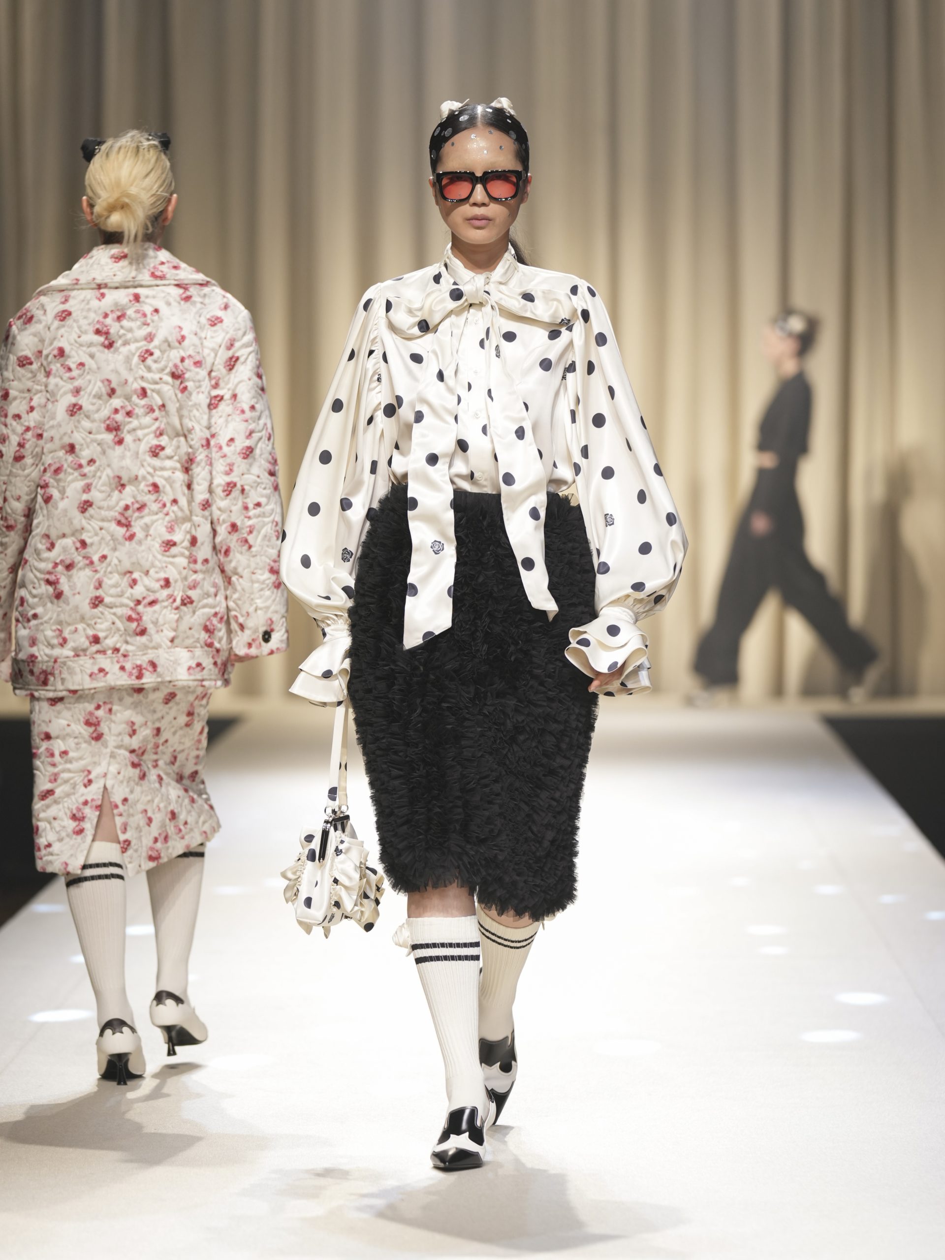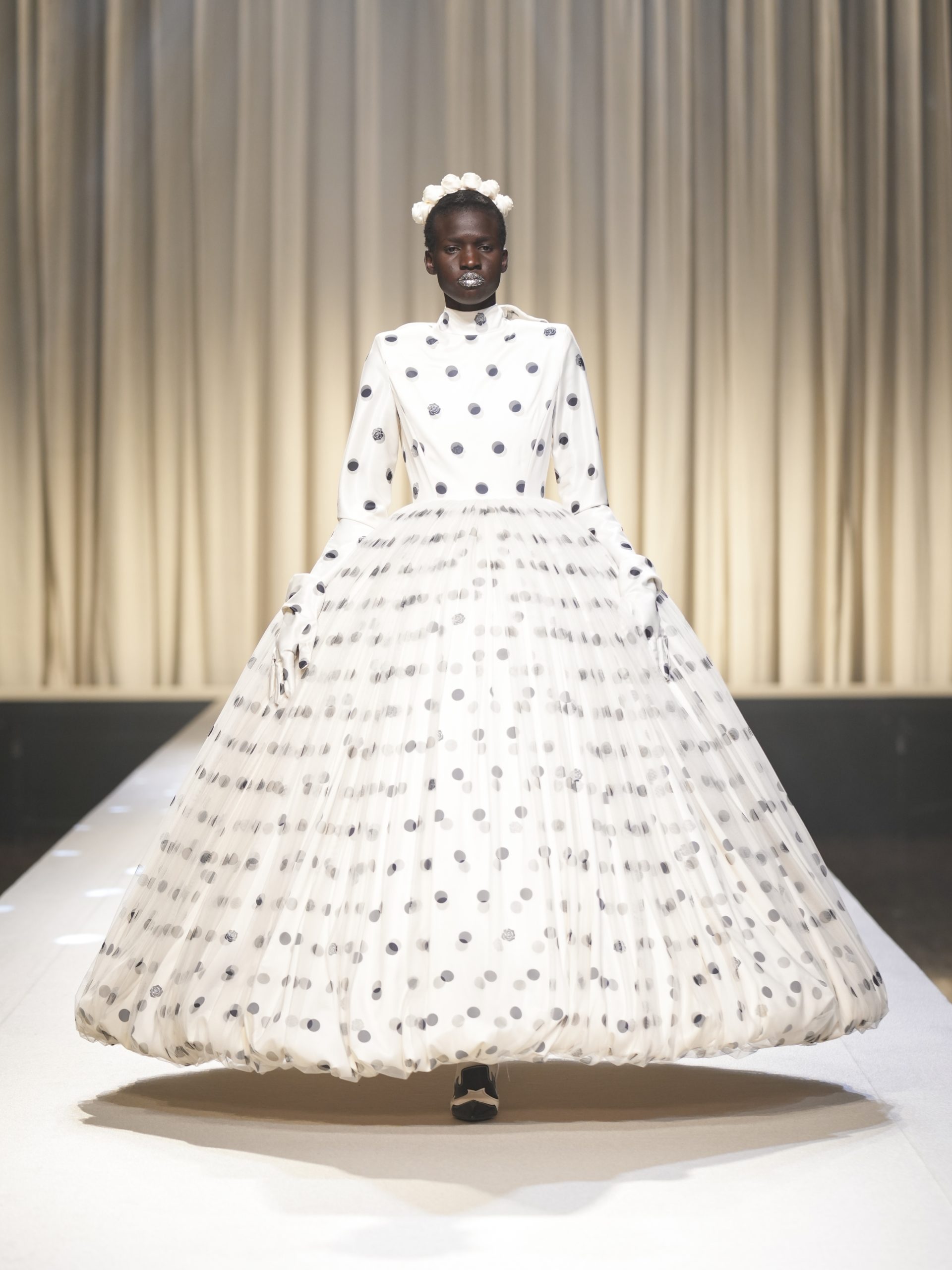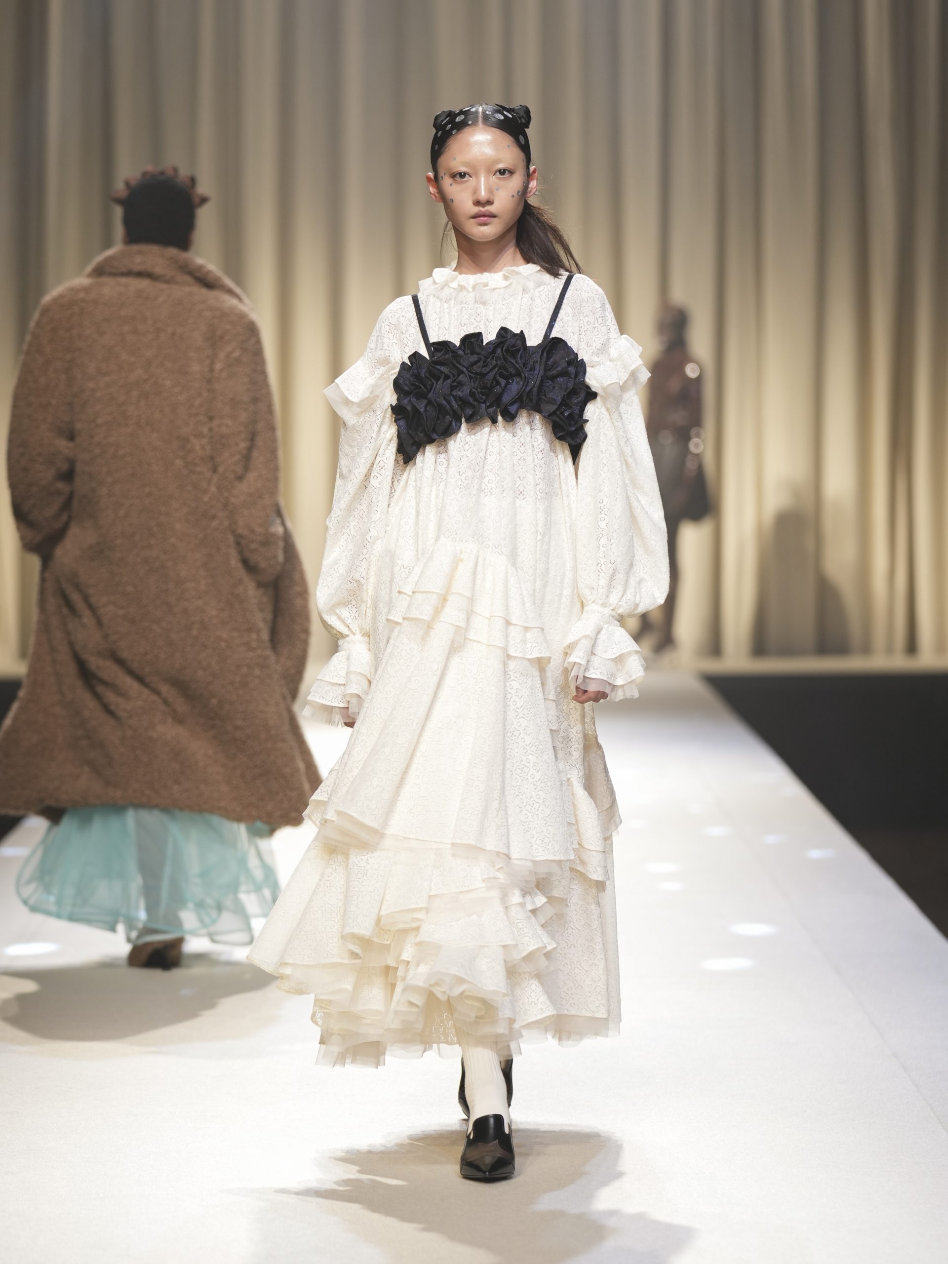 サテンの生地に施したウエスタン柄のキルティング、60 年代の織機で織り上げたヴィンテージライクなレース、リズミカルなチュールに、ウエスタンブーツのようなピンヒール。