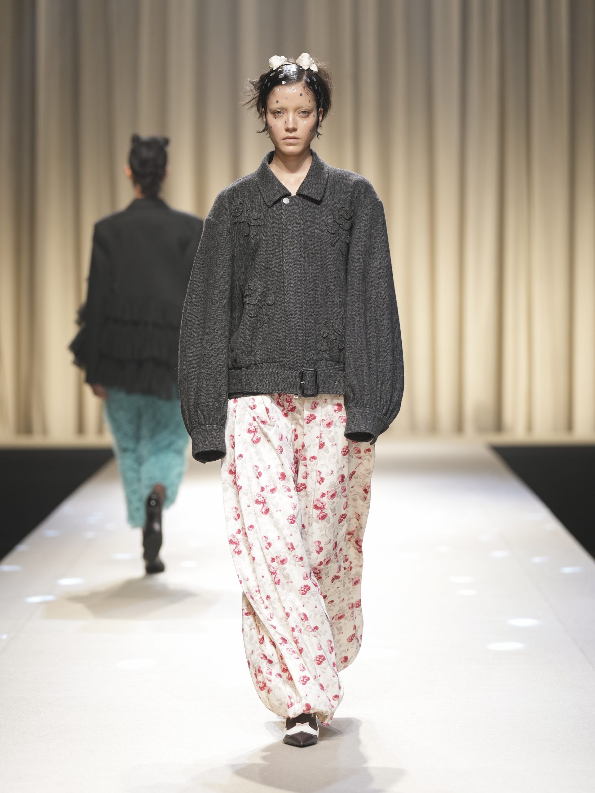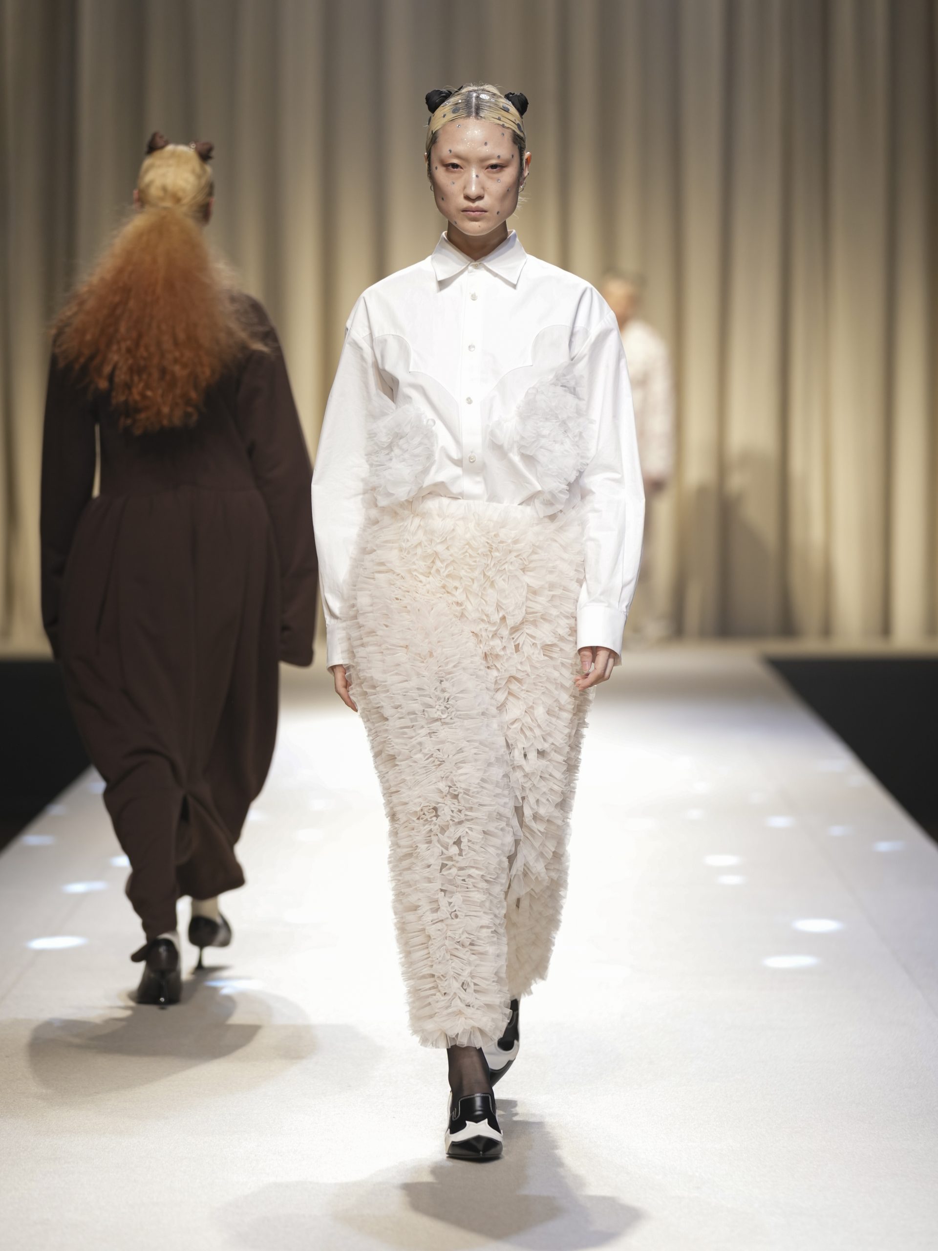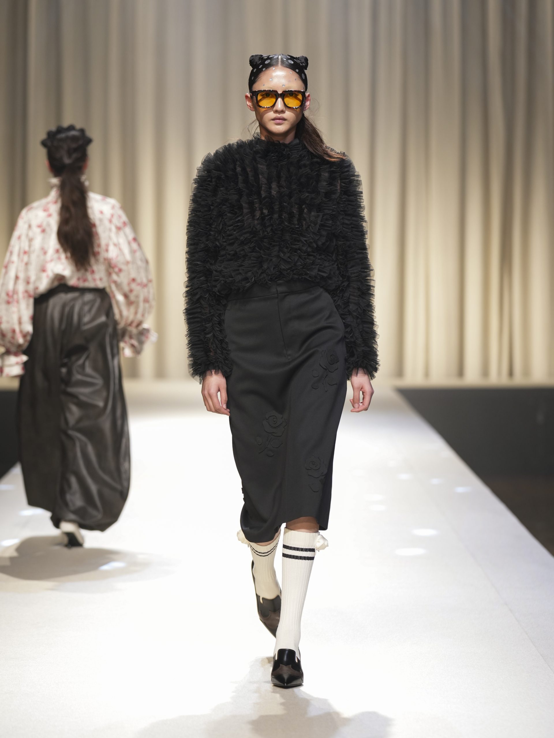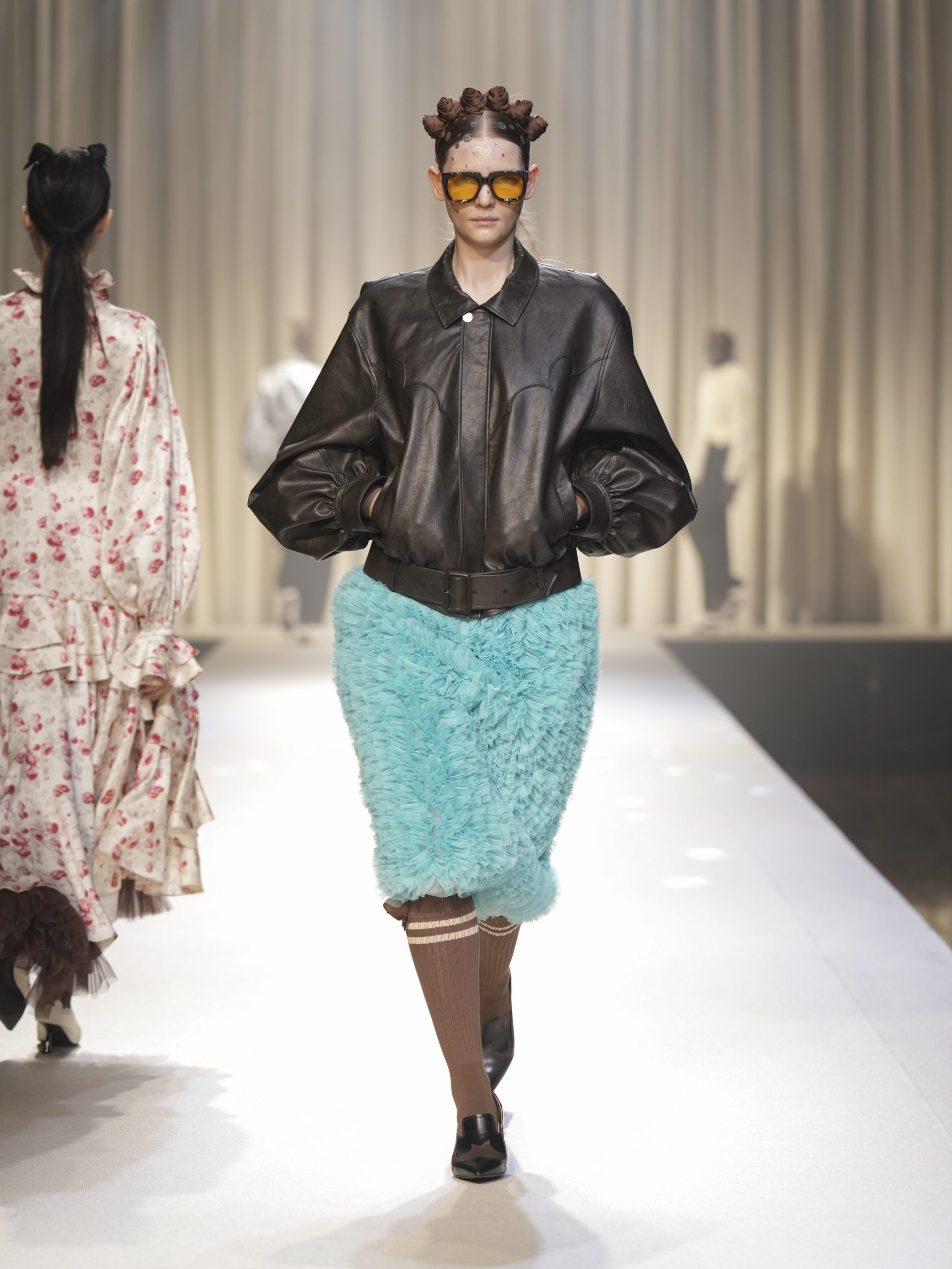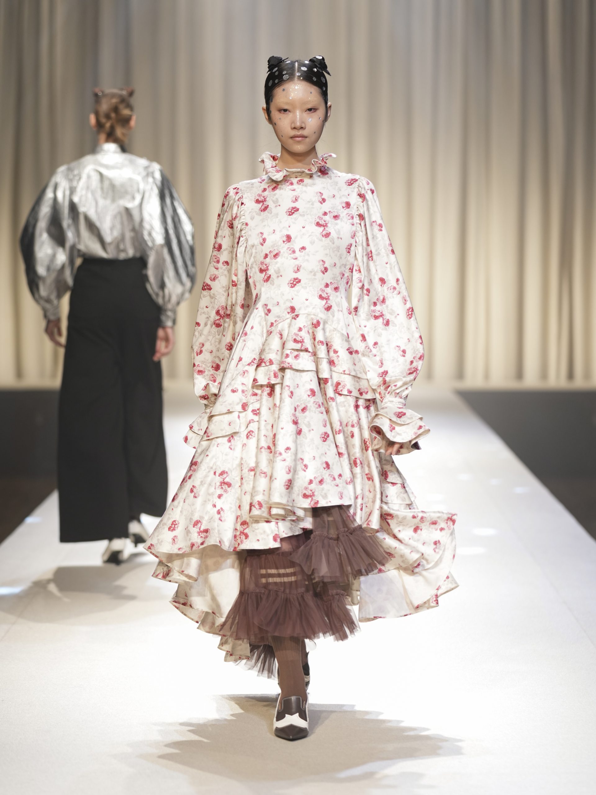 サテンの生地に施したウエスタン柄のキルティング、60 年代の織機で織り上げたヴィンテージライクなレース、リズミカルなチュールに、ウエスタンブーツのようなピンヒール。