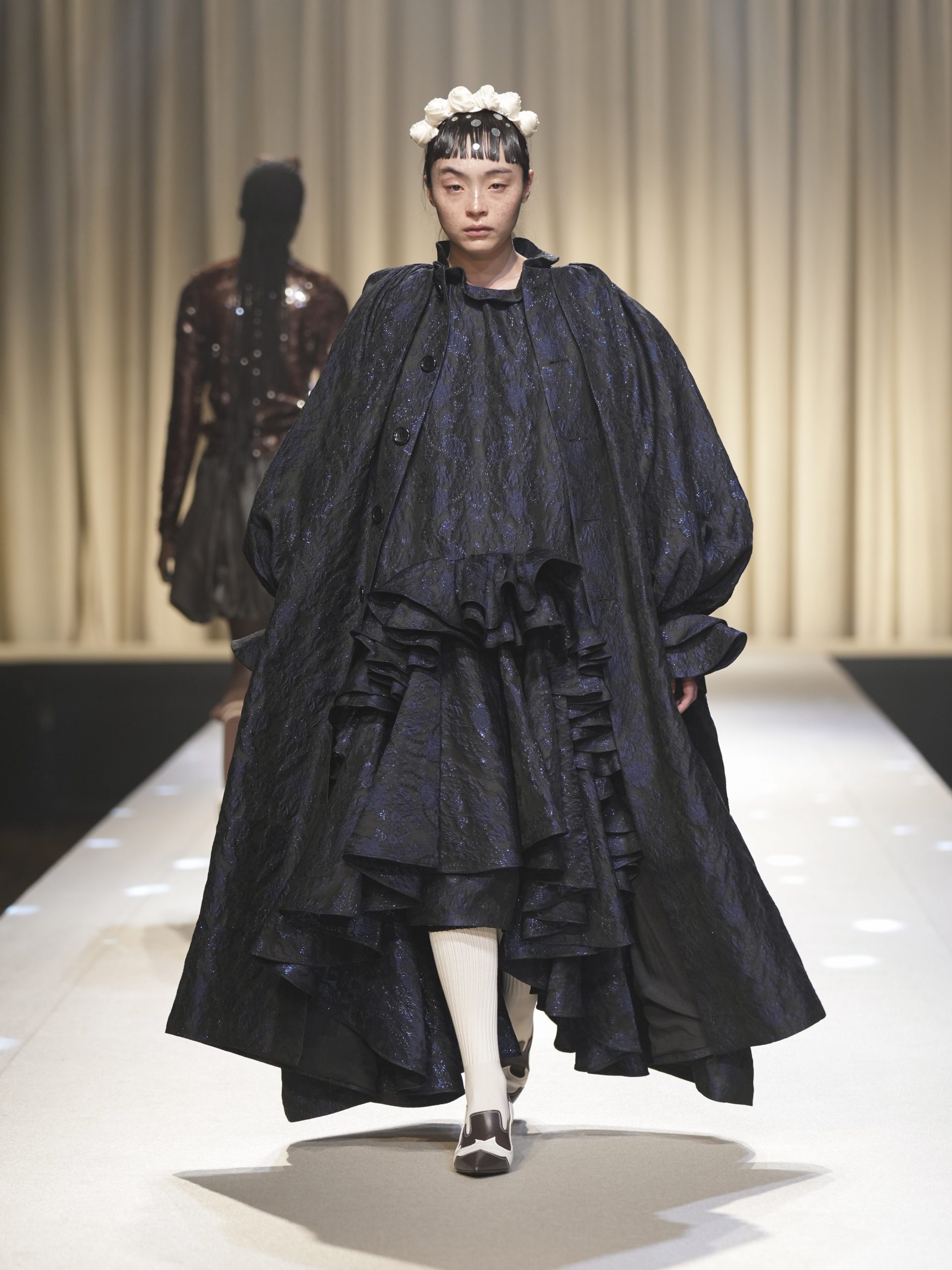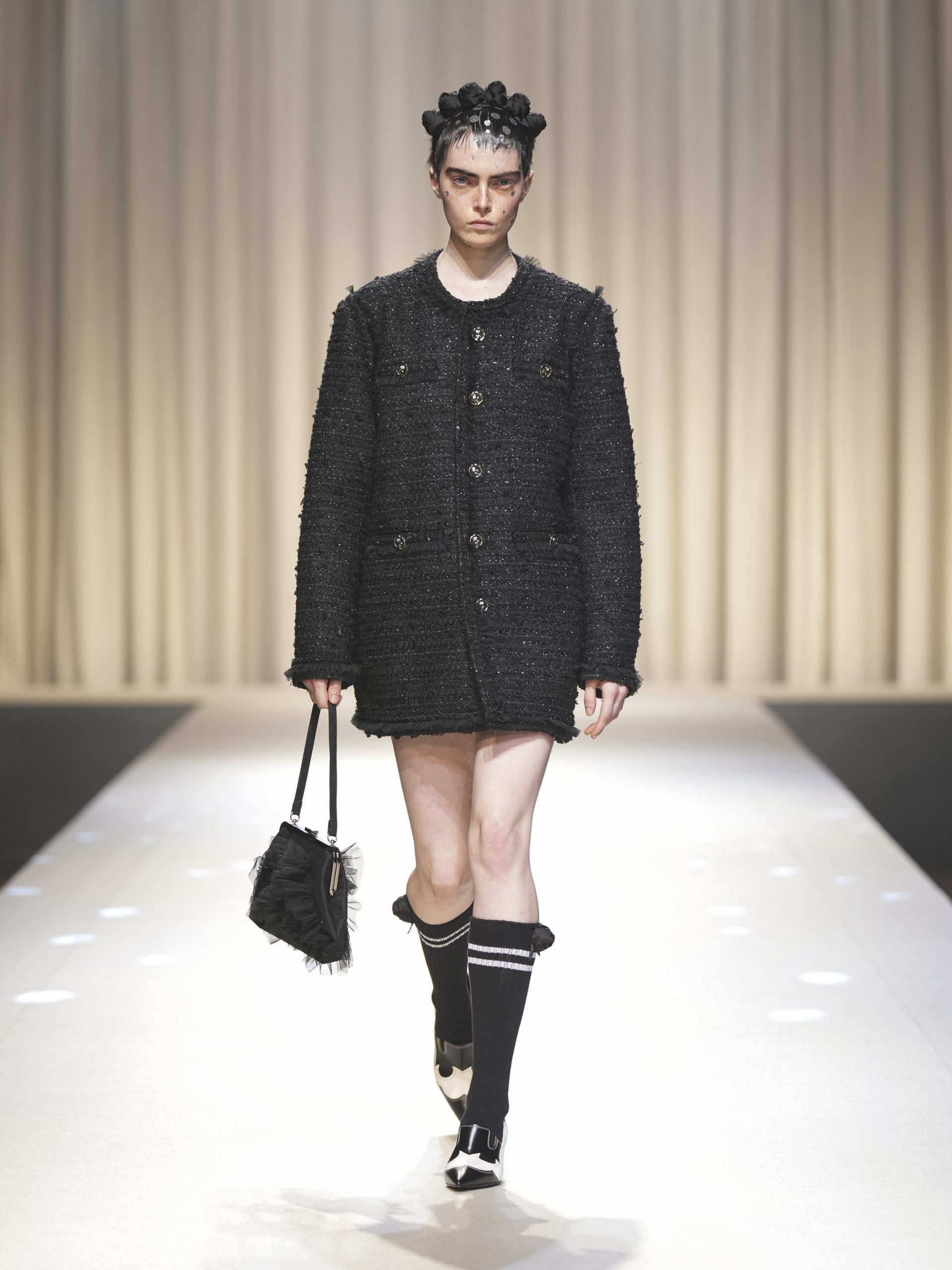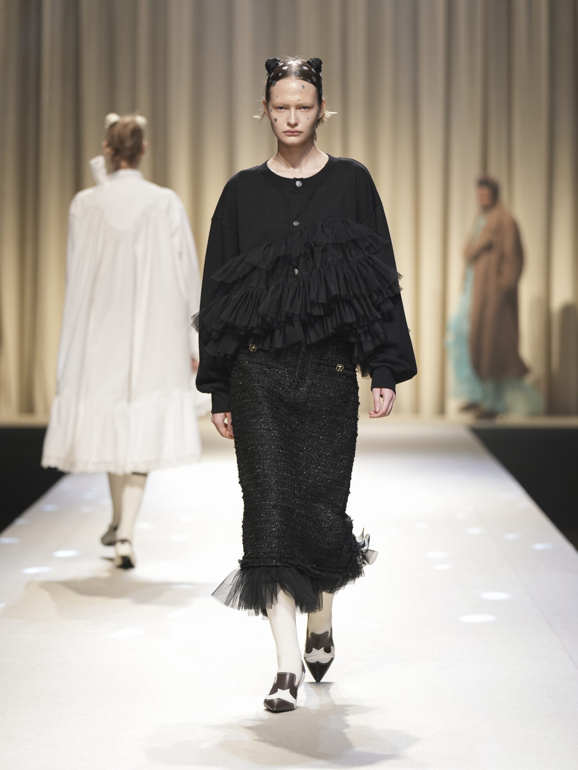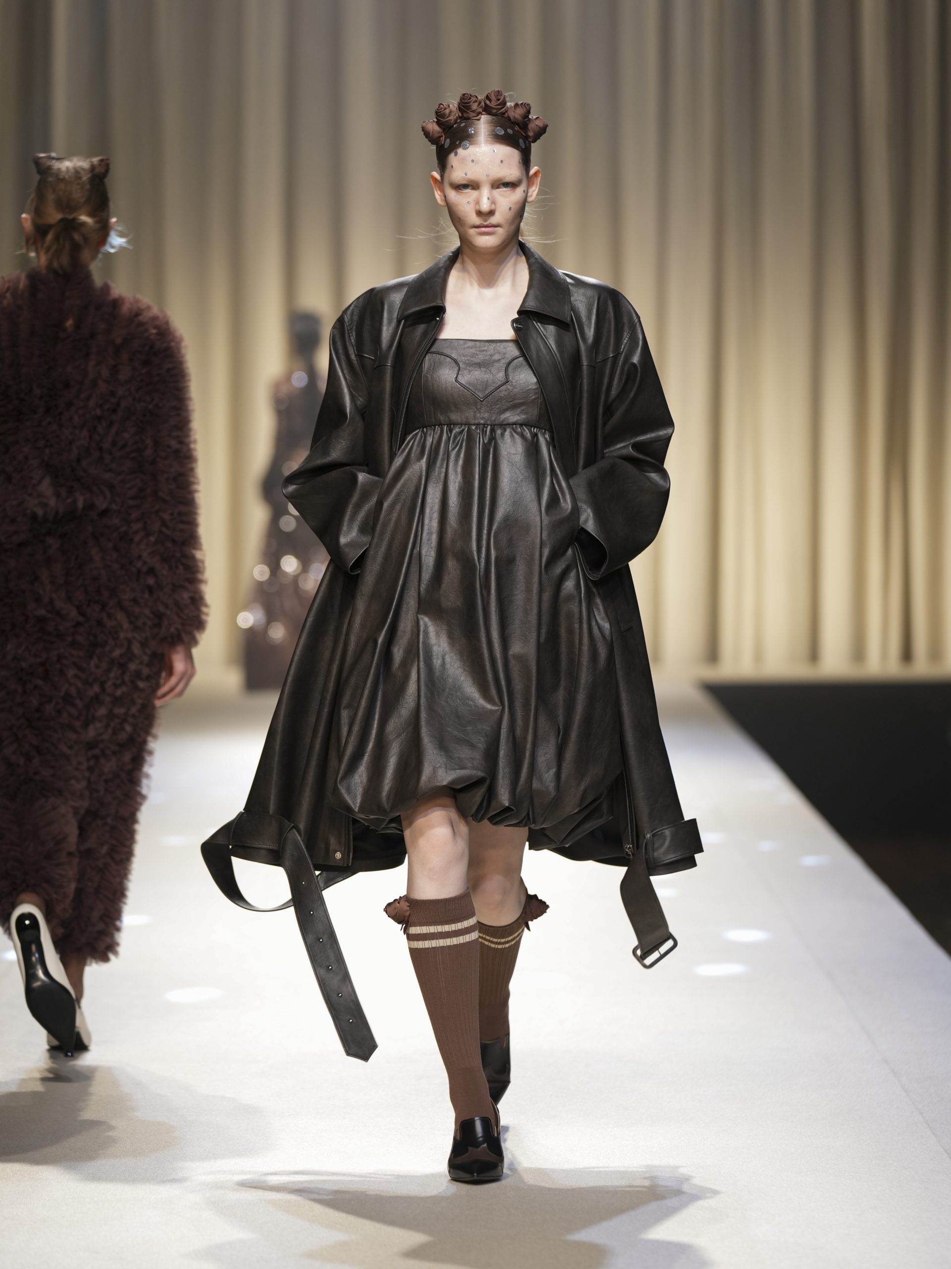 サテンの生地に施したウエスタン柄のキルティング、60 年代の織機で織り上げたヴィンテージライクなレース、リズミカルなチュールに、ウエスタンブーツのようなピンヒール。