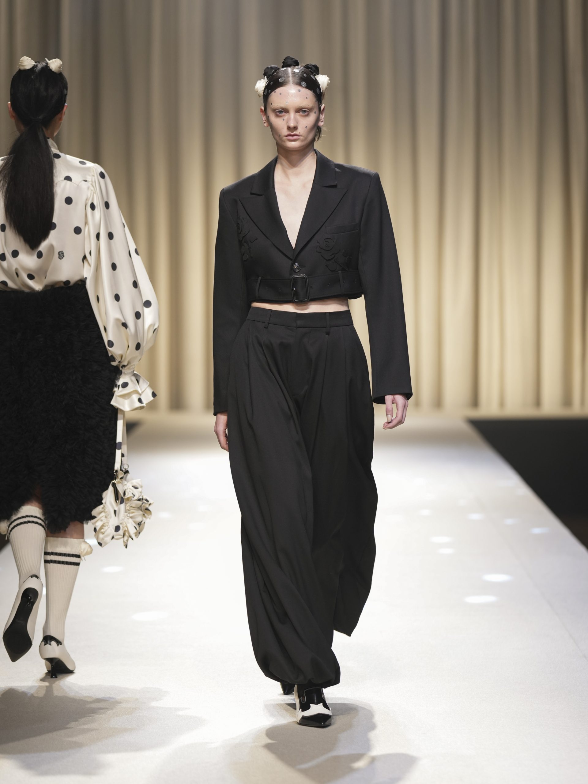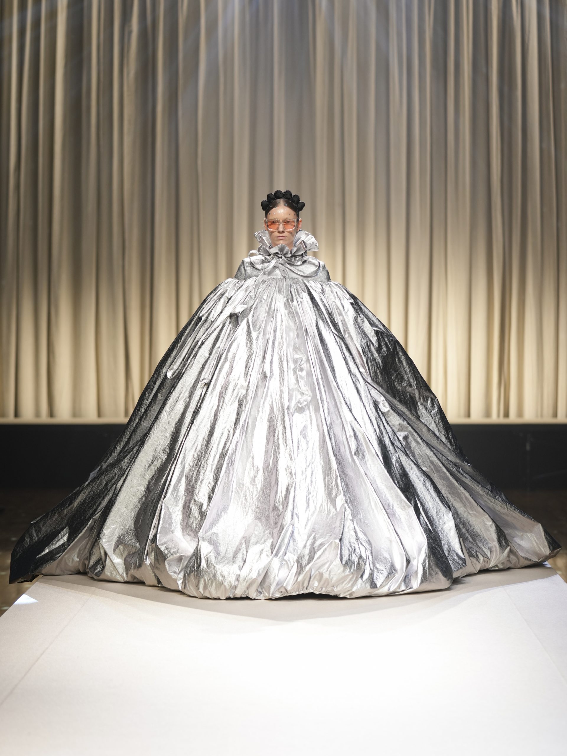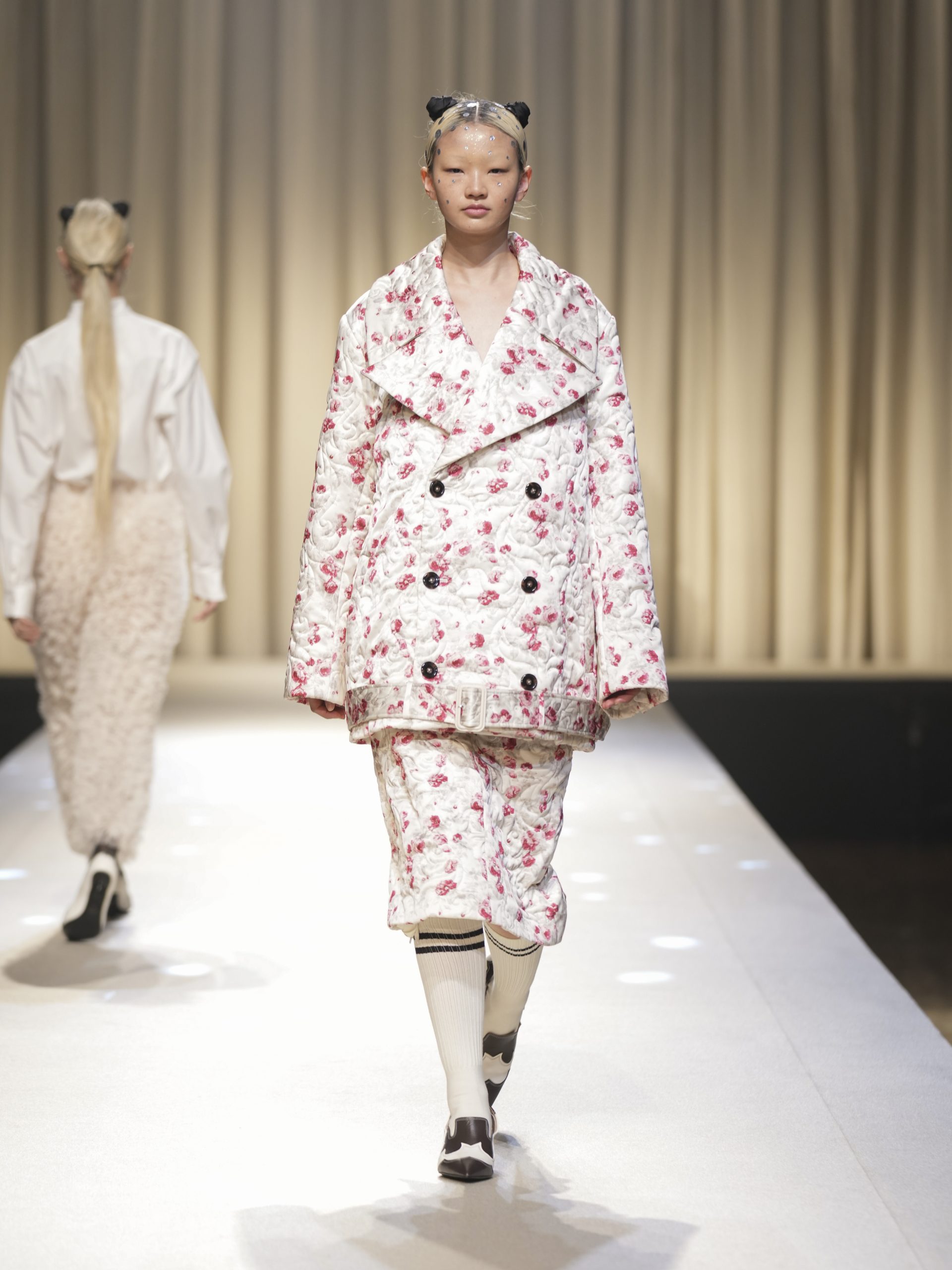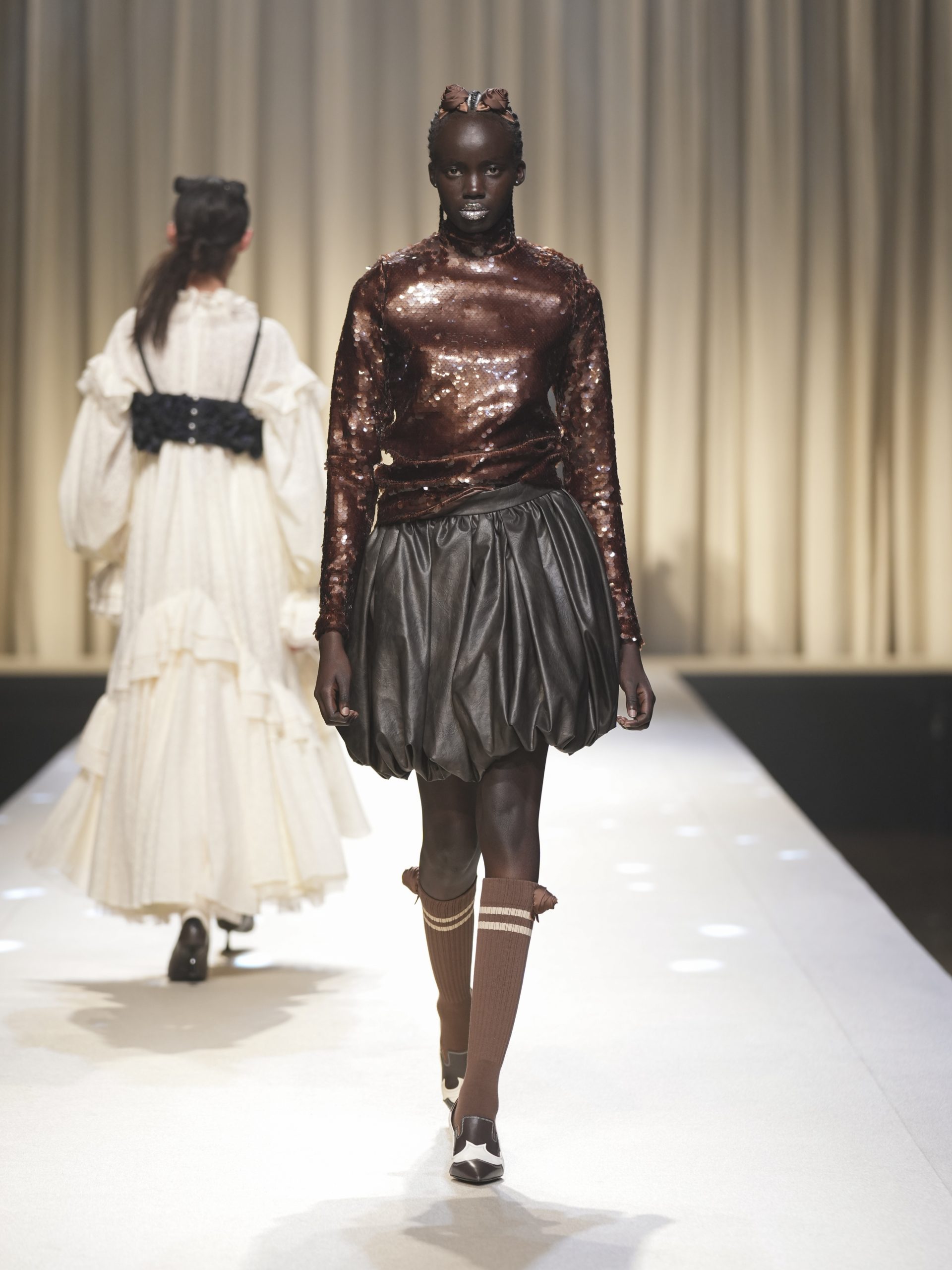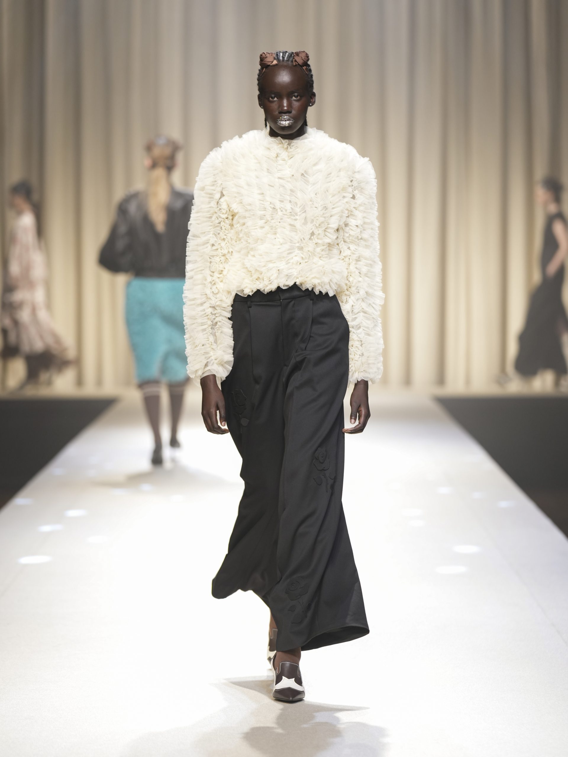 サテンの生地に施したウエスタン柄のキルティング、60 年代の織機で織り上げたヴィンテージライクなレース、リズミカルなチュールに、ウエスタンブーツのようなピンヒール。