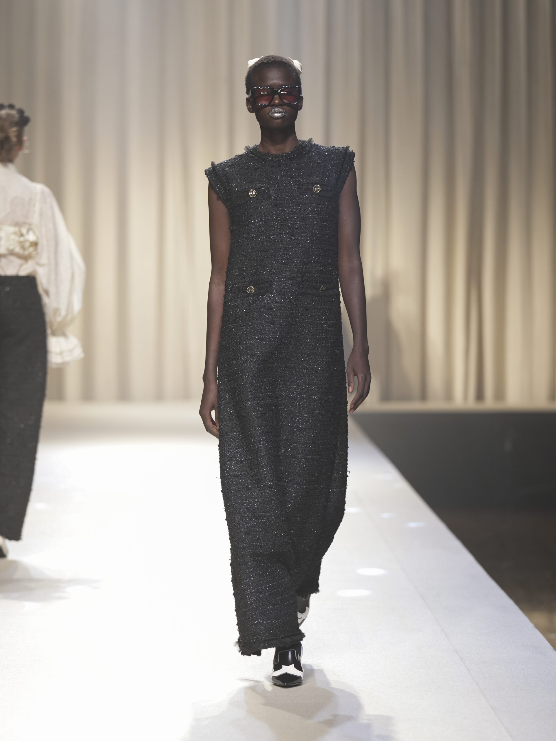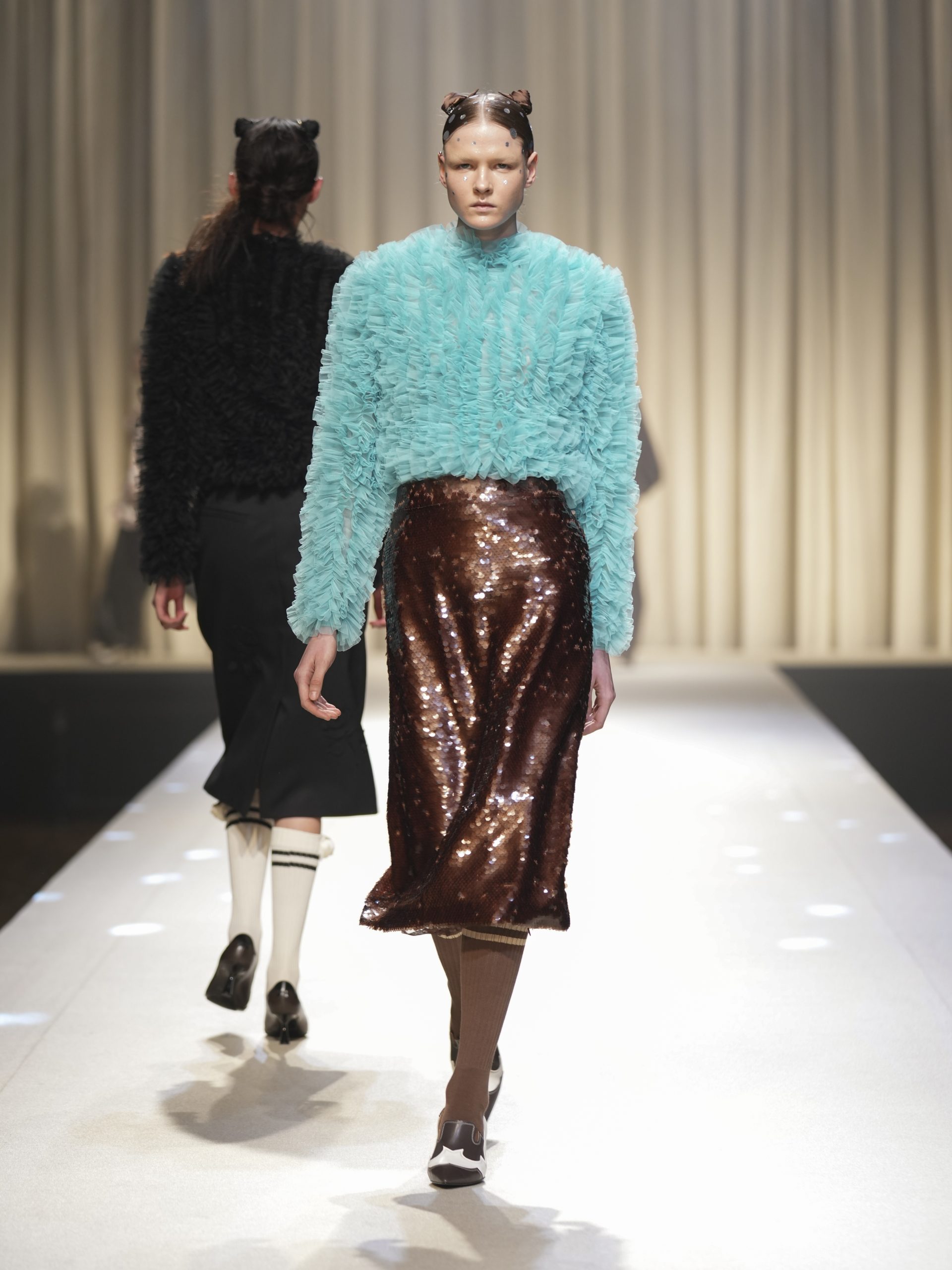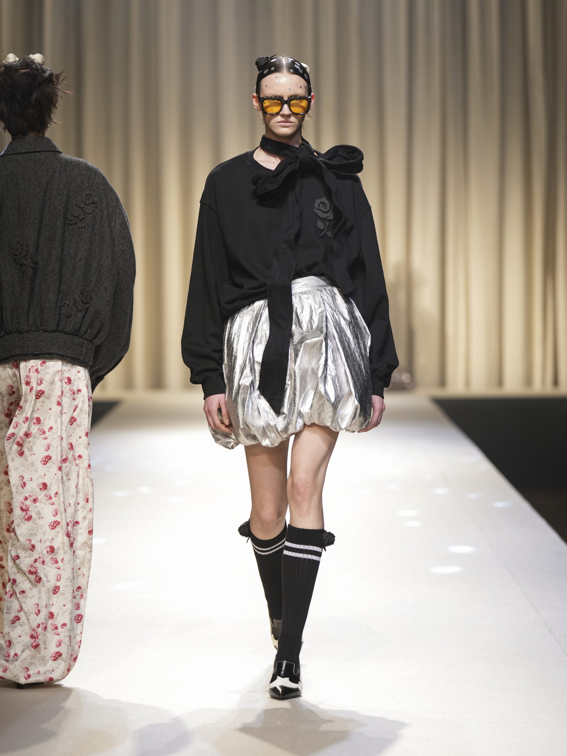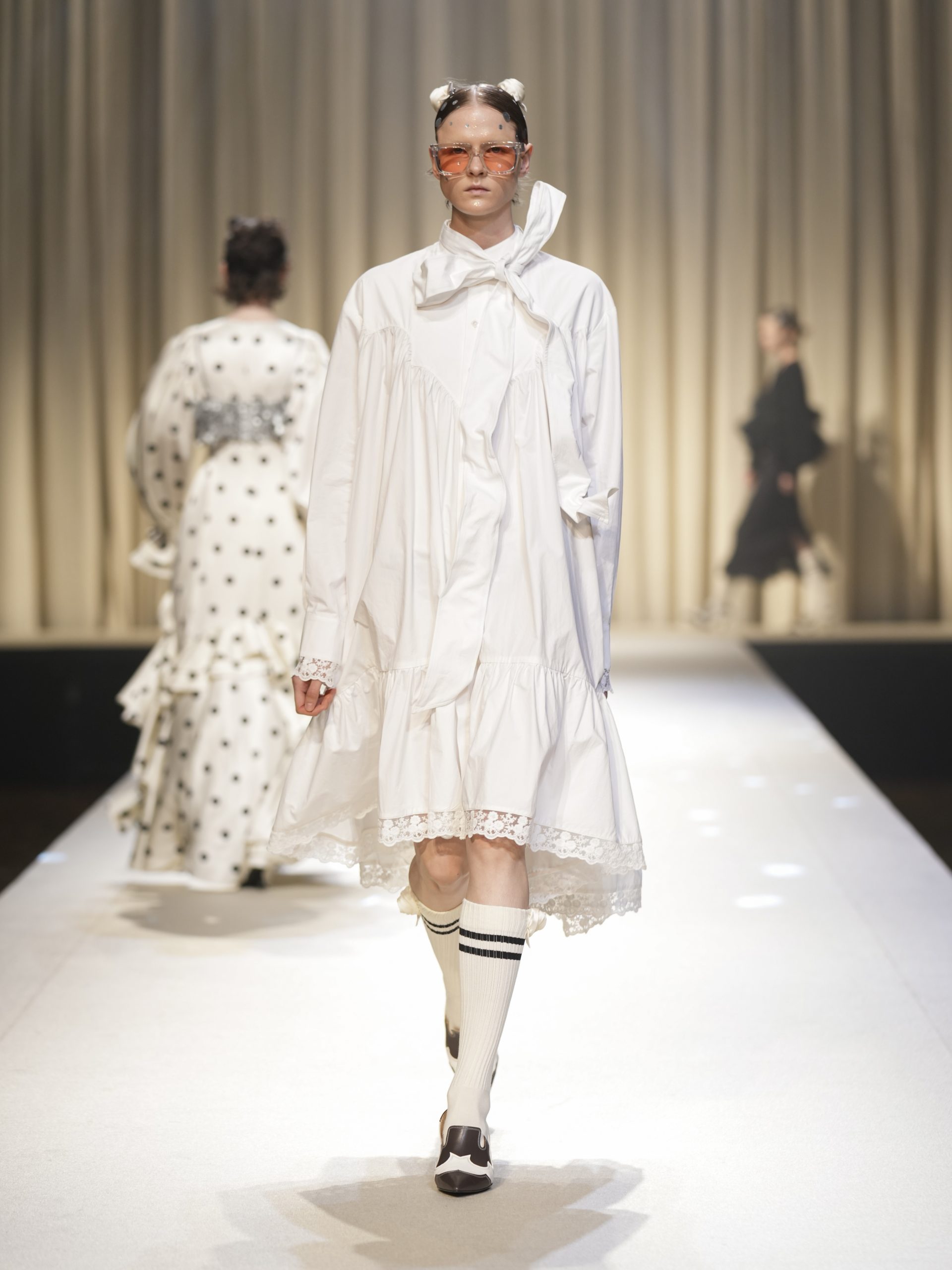 サテンの生地に施したウエスタン柄のキルティング、60 年代の織機で織り上げたヴィンテージライクなレース、リズミカルなチュールに、ウエスタンブーツのようなピンヒール。