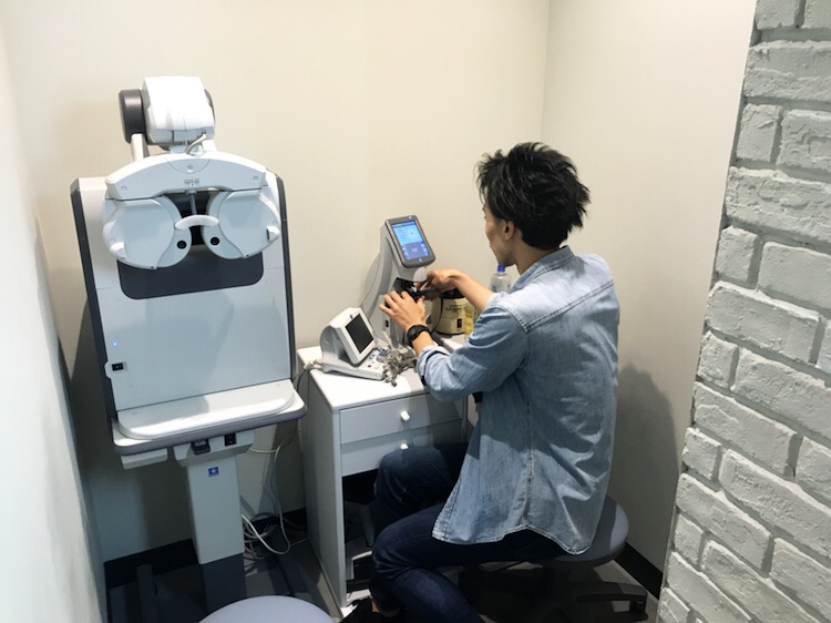 フレームを選んだら常設してある検眼室にて検眼、所要時間は15〜20分ほど。ヒアリングから始まり視力や焦点、最後はDTS用に細々な検眼をしてもらいました。無料オプションとしてブルーライト加工の有無も選べます。