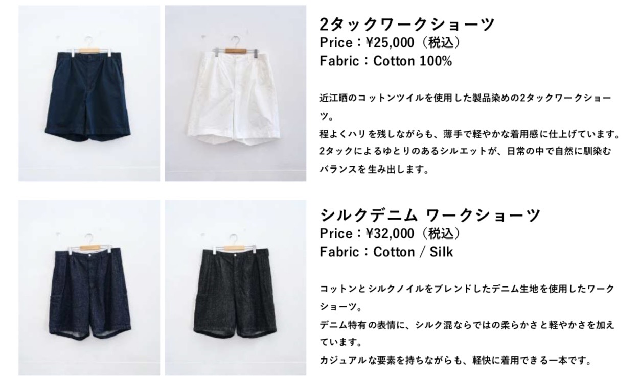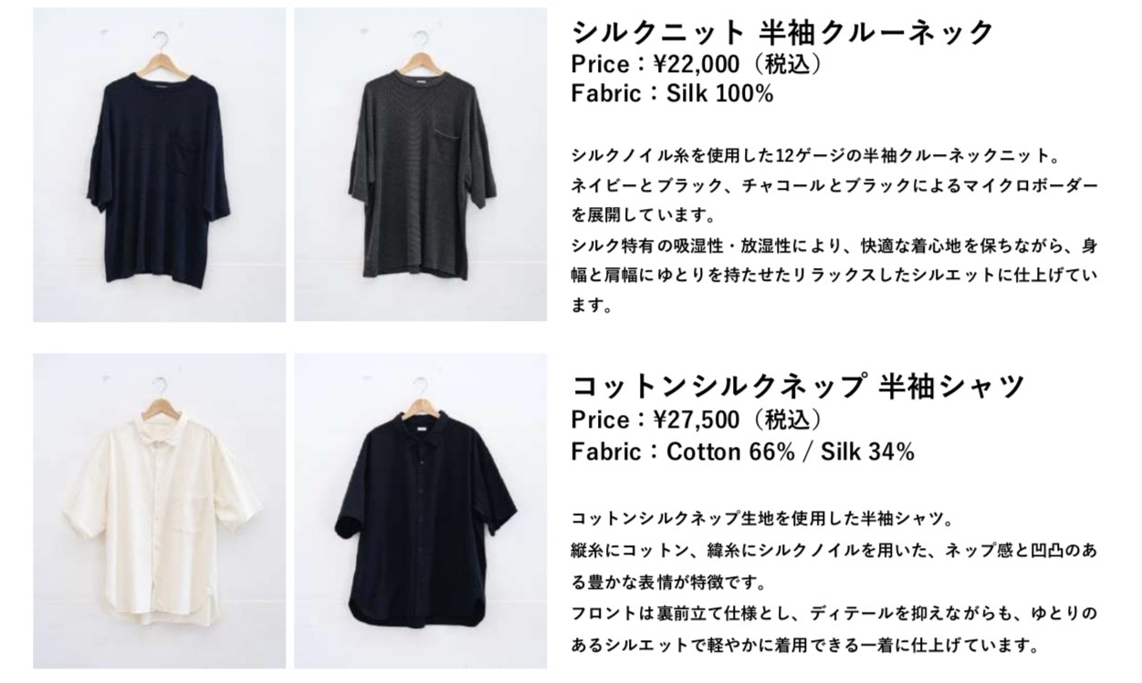 シルクニット半袖クルーネックやコットンシルクネップ半袖シャツ、デニムショーツ、 ガーメントダイコットンショーツなど、これからの季節に向けた軽やかなアイテムをラ インナップします。