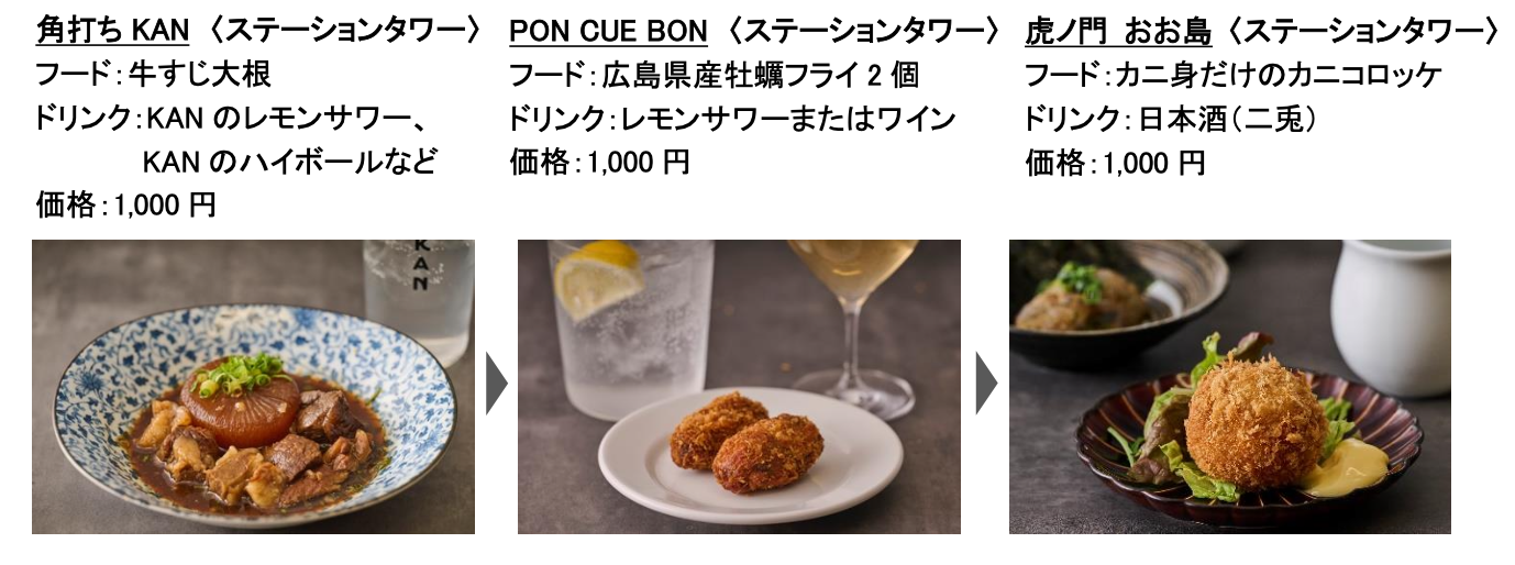 「虎ノ門ヒルズの飲食店が気になっていたけれど、まだ訪れたことがない。」そんな方には、前回大変好評だった人気店を巡るプランがおすすめ。店舗オリジナルドリンクが人気の「角打ちKAN」「PON CUE BON」では、虎ノ門ヒルズだからこそ味わえる1杯をお楽しみいただけます。また、2023年のオープンから多くのお客様にご好評いただいている「虎ノ門 おお島」のカニコロッケも、この機会にぜひご堪能ください。