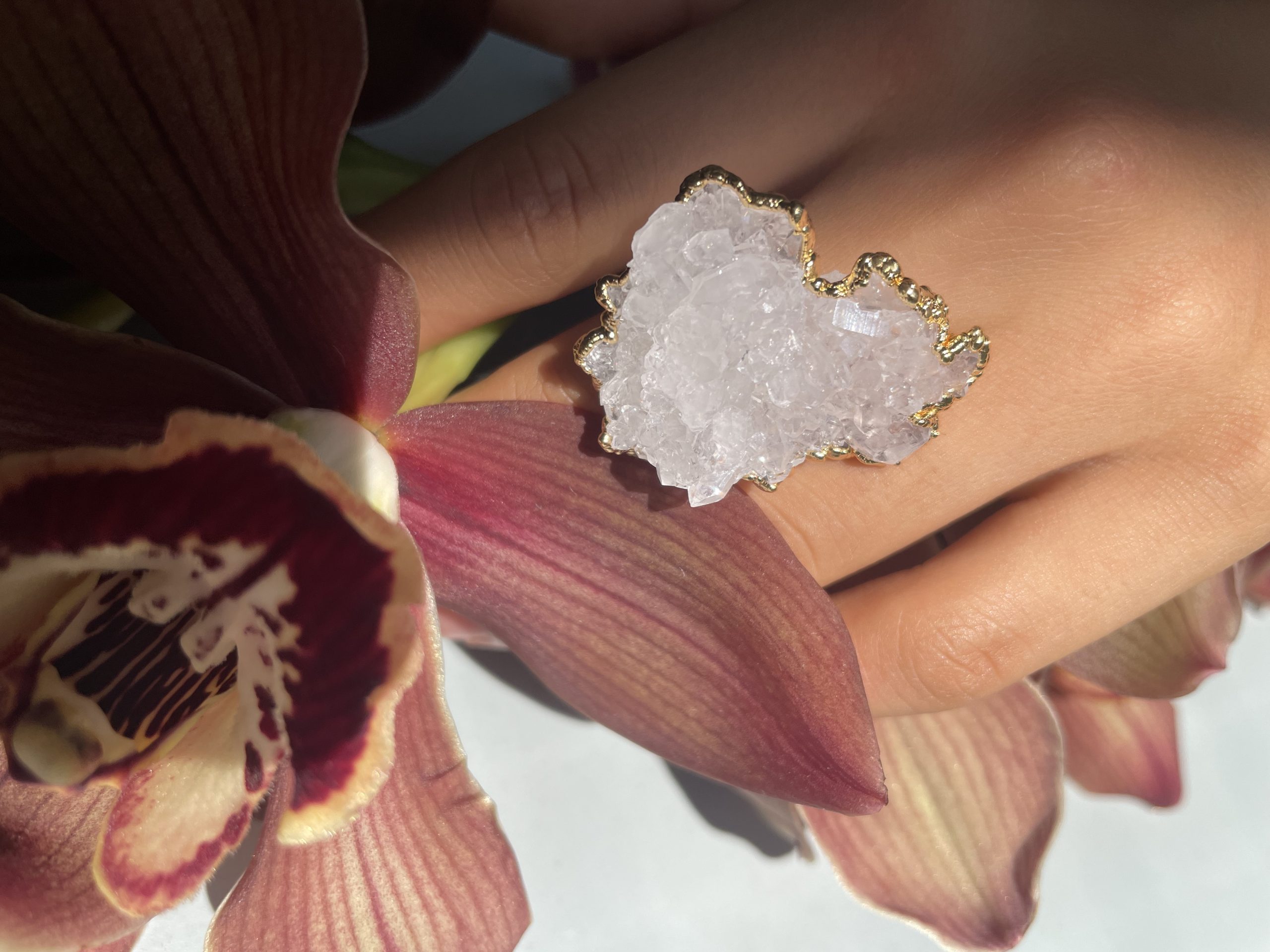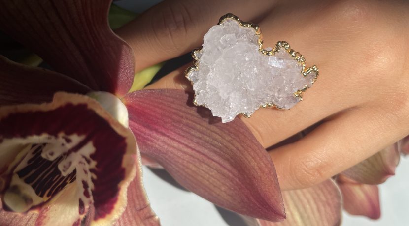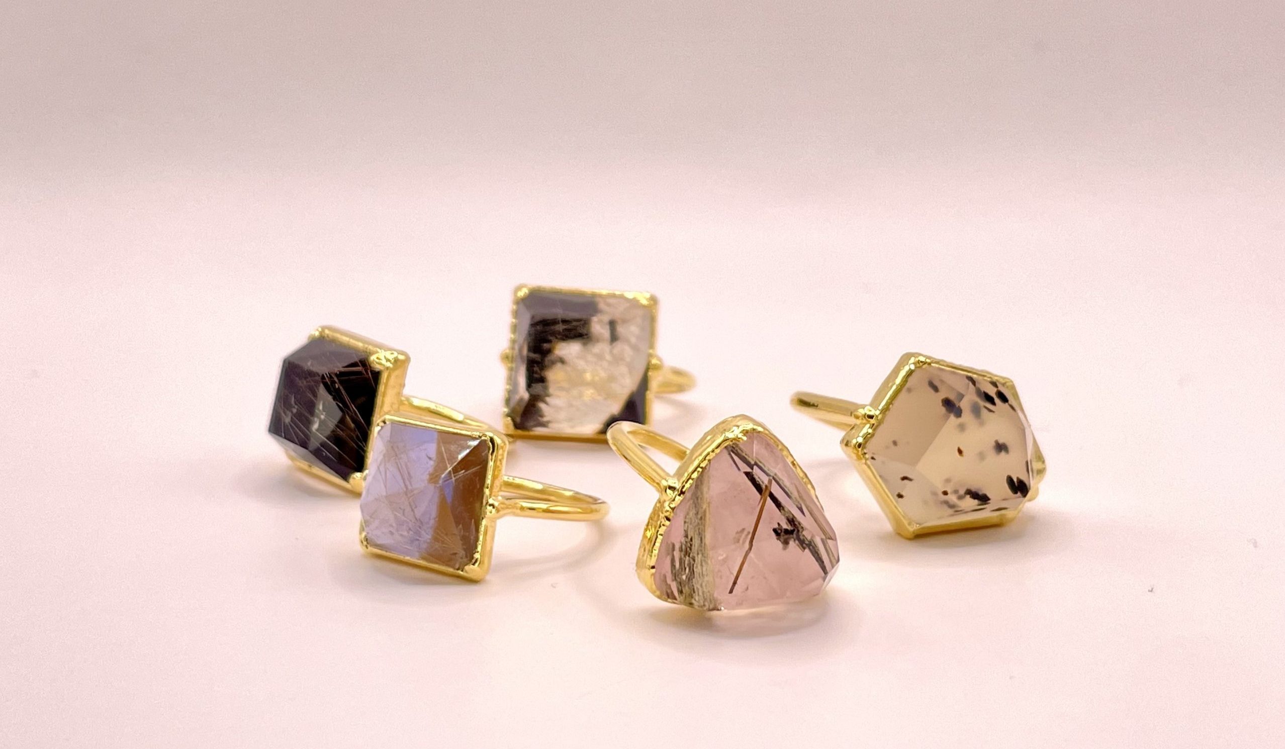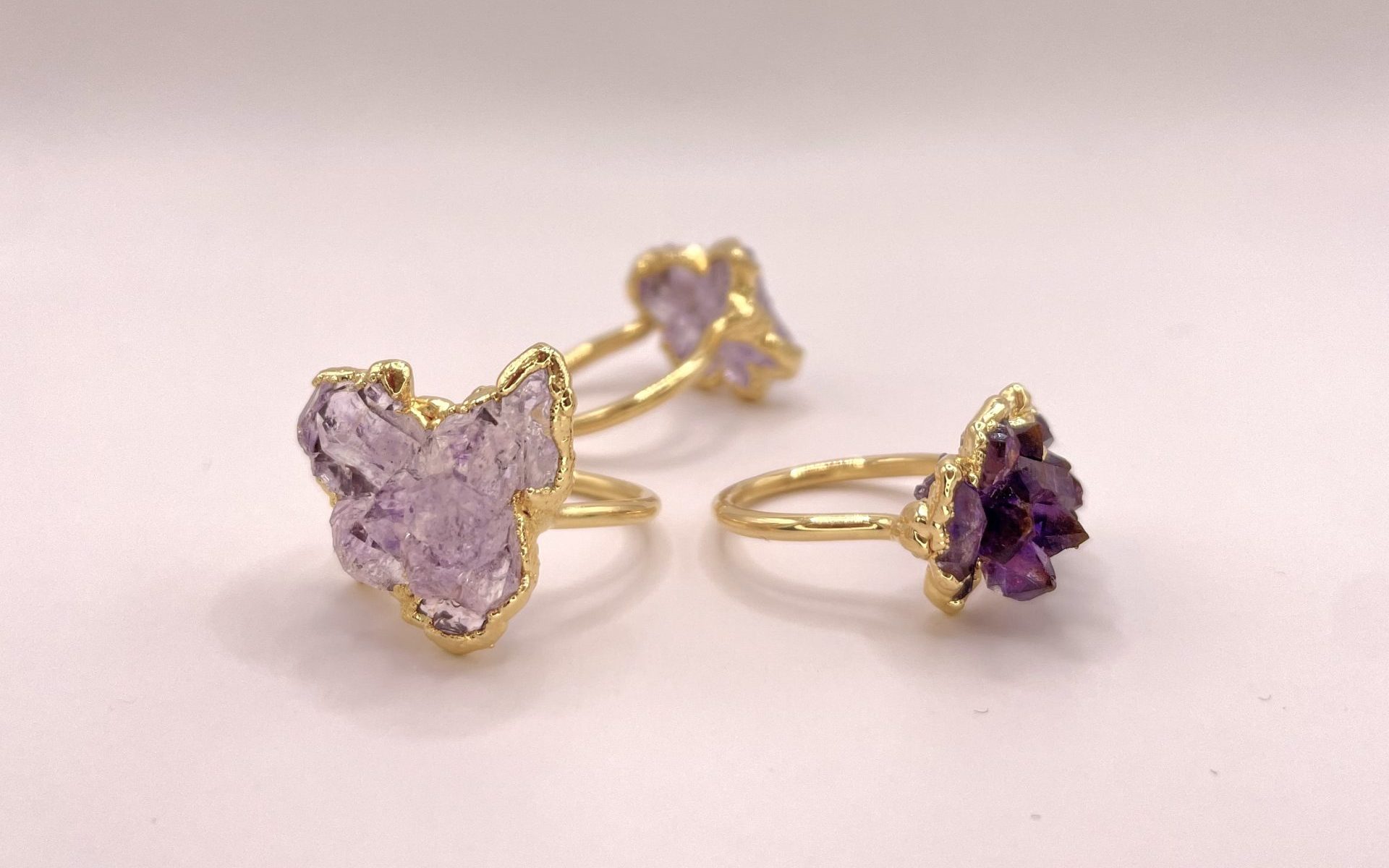 水晶の原石がもつ自然のままの造形に、金属がそっと寄り添うことで生まれたリングシリーズ。