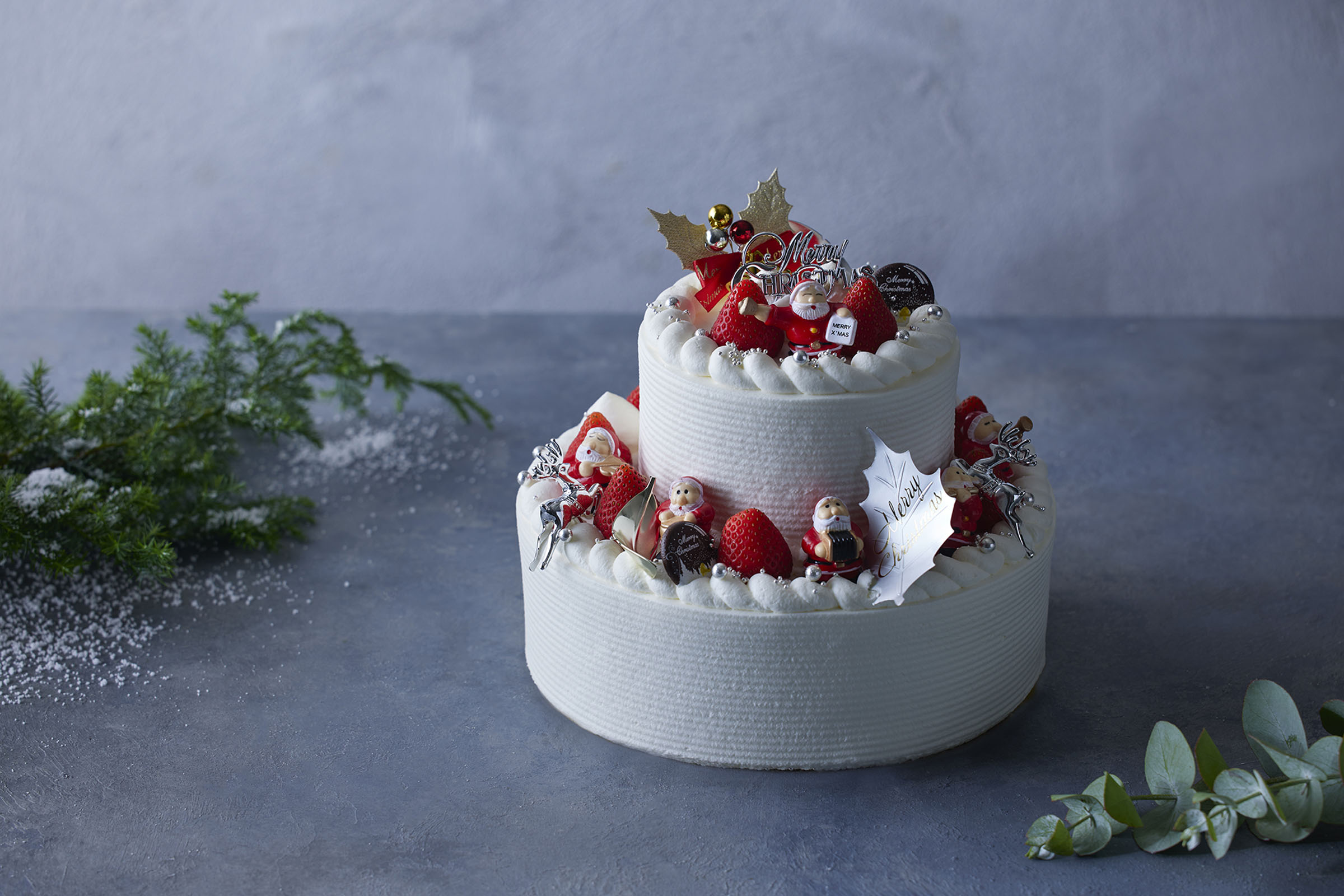 人気 No.1 のストロベリーショートケーキを、二段ケーキに仕上げました。ストロベリーシロップを染み込ませたスポンジに、生クリームと大粒の苺を。賑やかに添えたサンタクロースやトナカイの装飾が、笑顔が広がる温かなひとときをもたらします。