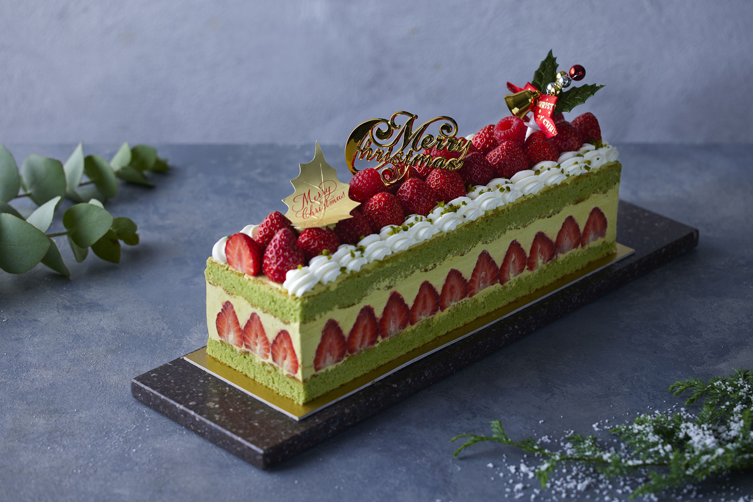 苺の季節に長く親しまれてきたフレジェを、クリスマスのお祝いにふさわしいサイズでお届けいたします。ローストピスタチオとフレッシュバターでつくる濃厚なクリームに、甘酸っぱく瑞々しい苺を贅沢に重ね、抹茶のダックワーズでサンドし、華やぎあふれる味わいに。クリスマスカラーを思わせる彩りと、それぞれ素材がもたらす味と香りのハーモニーが印象的な一品です。