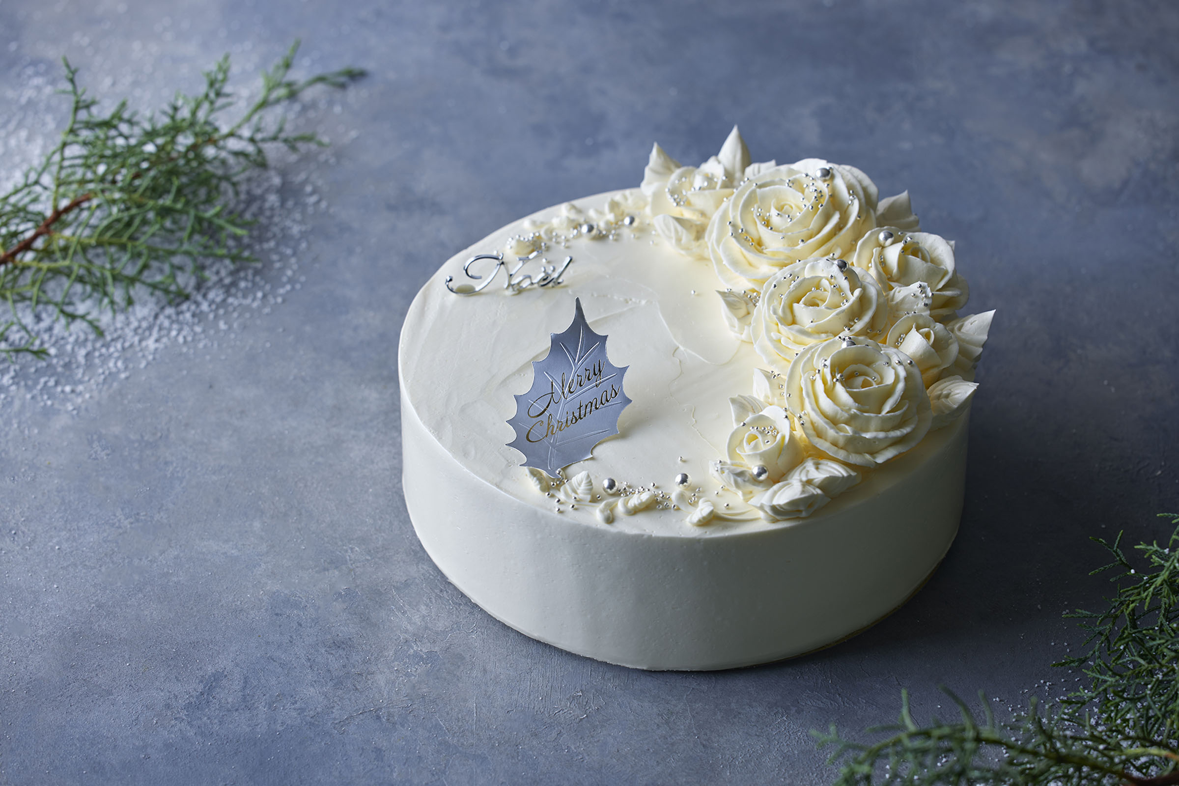 バタークリームのクリスマスケーキ。特製フレッシュバターを用いたメレンゲベースのバタークリームは、軽やかで澄んだ口どけが特徴です。ドライフルーツをふんだんに練り込んだフルーツケーキでアプリコットコンフィチュールをサンドし、深みと奥行きのある味わいに仕上げました。一つひとつ手作業で施すバラをモチーフにした端正なデコレーションが、ホリデーシーズンに輝きを添えます。上質なバターの香りと、ドライフルーツの生地、アプリコットの調和が、新たな発見とともに記憶に残るクリスマスをお届けします。