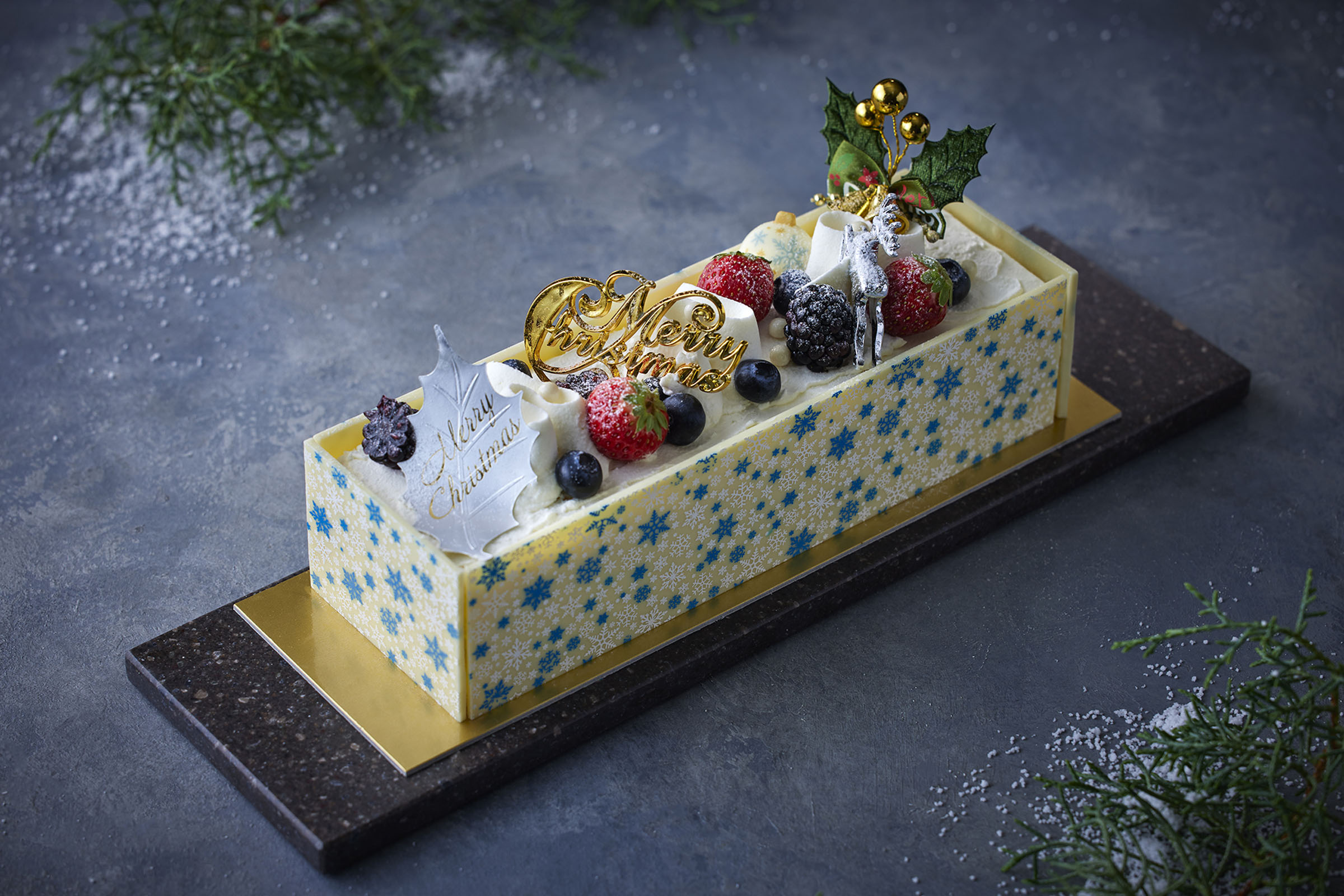 周囲はホワイトチョコレートで雪景色を表現。ブルーベリー、苺、ブラックベリーで華やぎを添えました。二種類のチーズケーキと生クリームが奥行きのある味わいを奏でます。