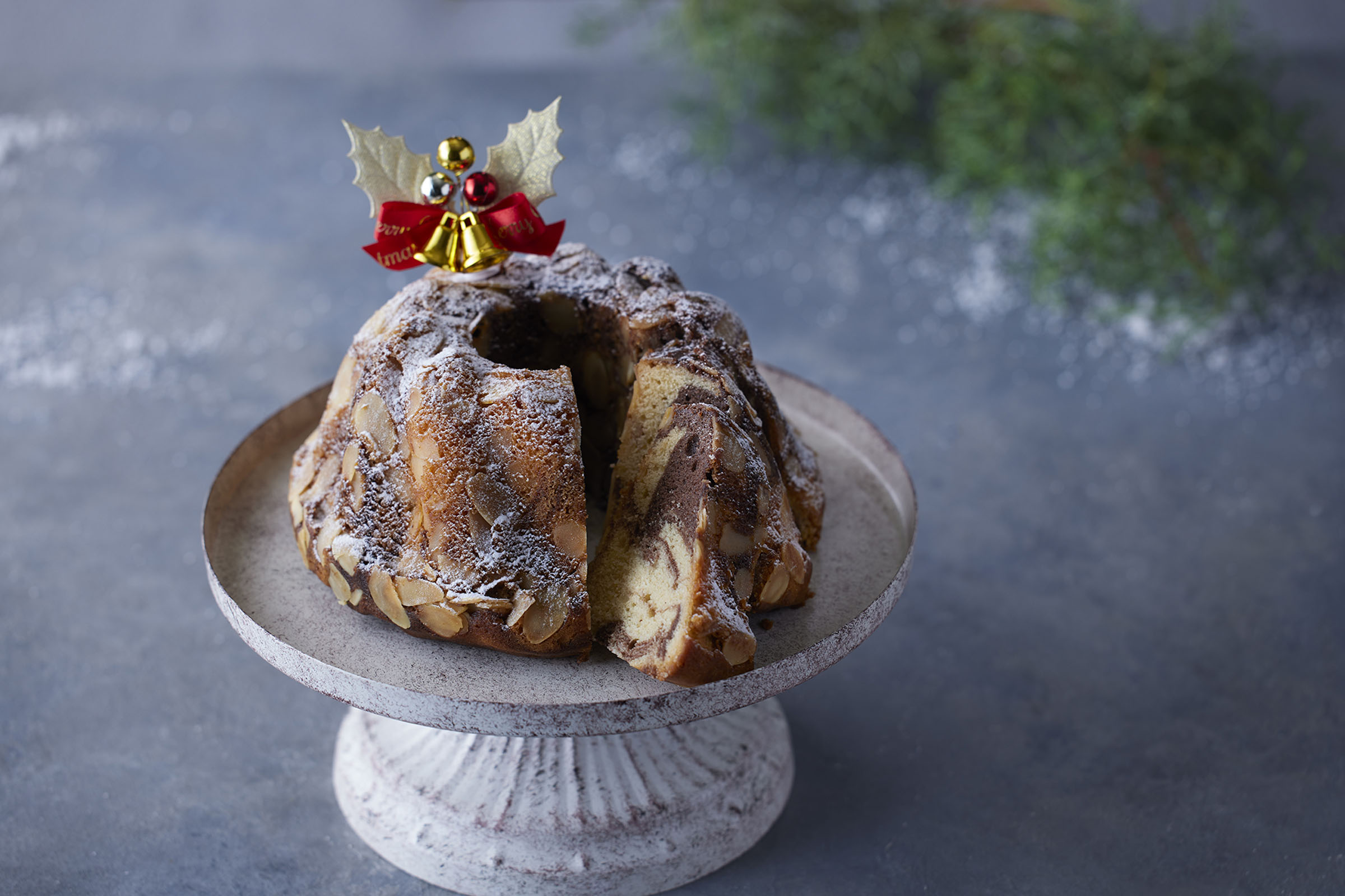 オーストリアのクリスマスに欠かせないクグロフ。シナモンやオールスパイス、ナツメグなどスパイスが豊かに香る生地に、チョコレート生地を合わせ、マーブル状に焼き上げて華やかに。甘いバターの風味にスパイスとラム酒の香りが重なる、味わい豊かな焼き菓子です。