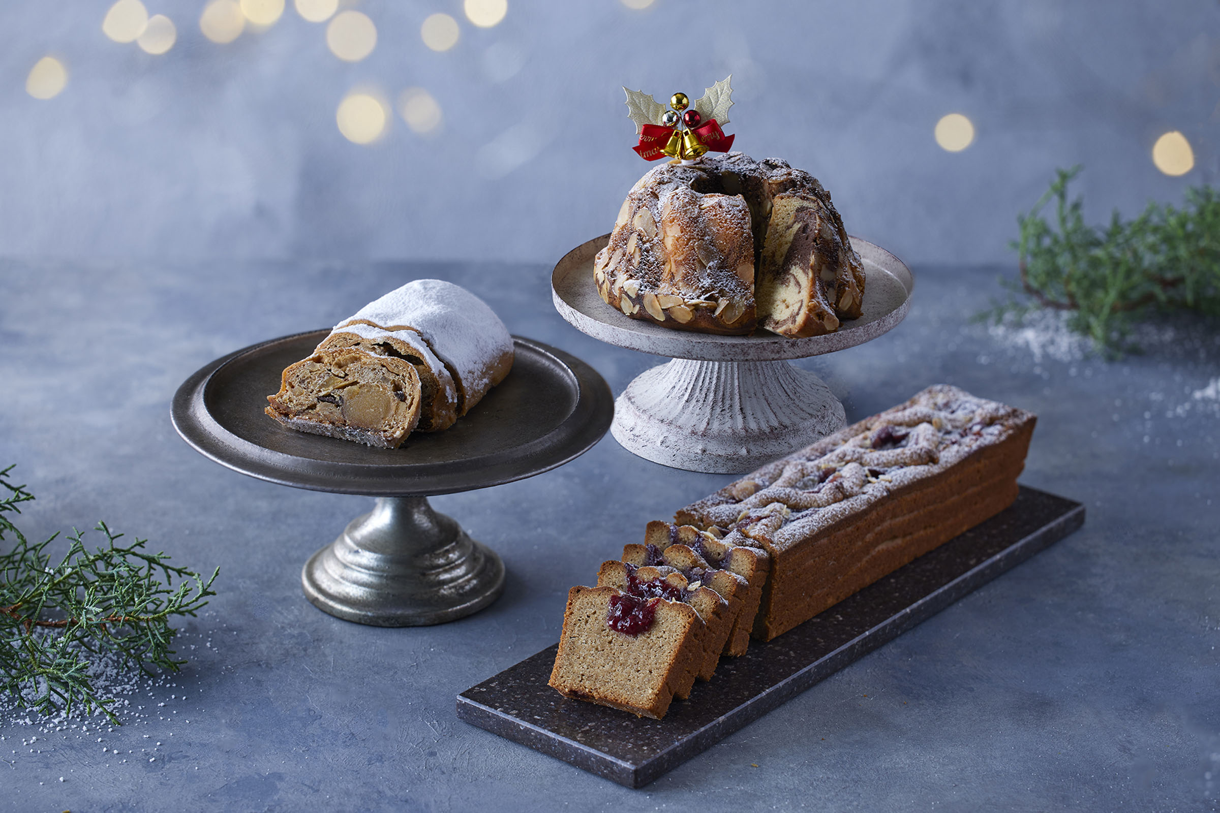 ペストリーシェフが丹精込めて焼き上げる、三種類のクリスマスの伝統菓子をご用意します。芳醇なスパイスが香る『マーブルスパイスクグロフ』、熟成された味わいが魅力の『シュトーレン』、そして、しっとりとした食感と甘酸っぱいジャムが絶妙な『リンツァーシュニッテン』。特別なオケージョンでなくても、日常の中にもホリデーシーズンを迎える喜びを感じていただきたい、という思いを込めて作る、シンプルながら細部に渡りこだわり抜いた焼き菓子です。寛ぎのひと時にも、贈り物としてもふさわしい、心温まる味わいをお届けします。