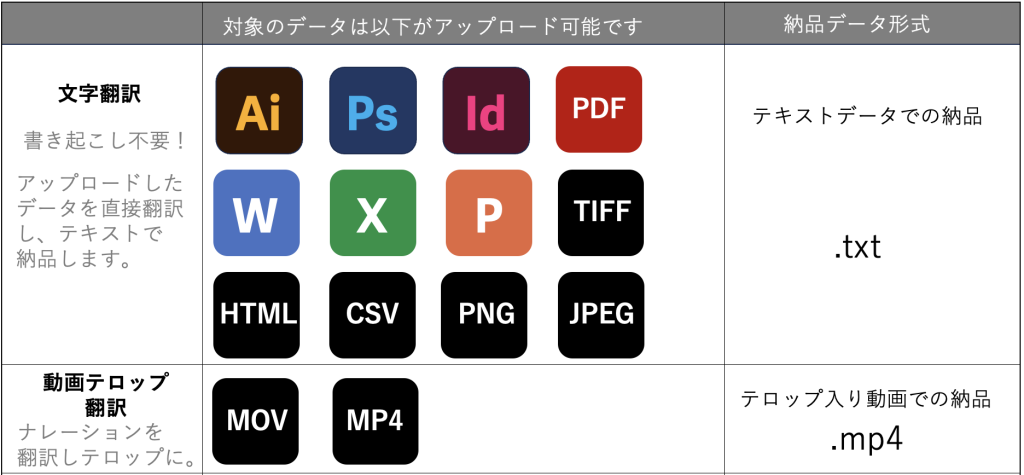 ローカライズAI翻訳サポートの種類 翻訳の種類によって、納品のデータ形式が変わります。 納品目安は、データーアップロードした日から3営業日です。 翻訳の元データは以下をご確認ください。この表に、データ形式の記載がない場合はご相談ください。 注文からお届けまでの流れ 以下、4種類のサポートからお選びいただけます。なお、翻訳する文字量によって金額は変わります AI・文字数翻訳 書き起こし不要。翻訳テキストの納品。 500文字以内/ 6,325円(税込)カートへ 1000文字以内/ 12,650円(税込)カートへ 1500文字以内/ 18,975円(税込)カートへ 2000文字以内/ 25,300円(税込)カートへ 3000文字以内/ 37,950円(税込)カートへ AI・動画テロップ翻訳 テロップをつける動画には、ナレーションが入っていることが前提です。 500文字以内 テロップ編集込み 12,650円(税込)カートへ 1000文字以内 テロップ編集込み 17,600円(税込)カートへ 1500文字以内 テロップ編集込み 22,550円(税込)カートへ 2000文字以内 テロップ編集込み 27,500円(税込)カートへ 3000文字以内 テロップ編集込み 37,400円(税込)カートへ AI・写植翻訳 マンガ・企画書・パンフレットなどデザインされたものに幅広く対応 1ページ2,200円(税込) サービス準備中(Coming Soon) AI・ゲーム翻訳 見積もりを依頼する ゲームは、ロールプレイングなどであれば文字量がい多いので、まずはお見積もりをご依頼ください。 その他、翻訳に関するご相談やお見積もり依頼があればお気軽にお問い合わせください お見積もり・ご相談 翻訳サポートに戻る▷