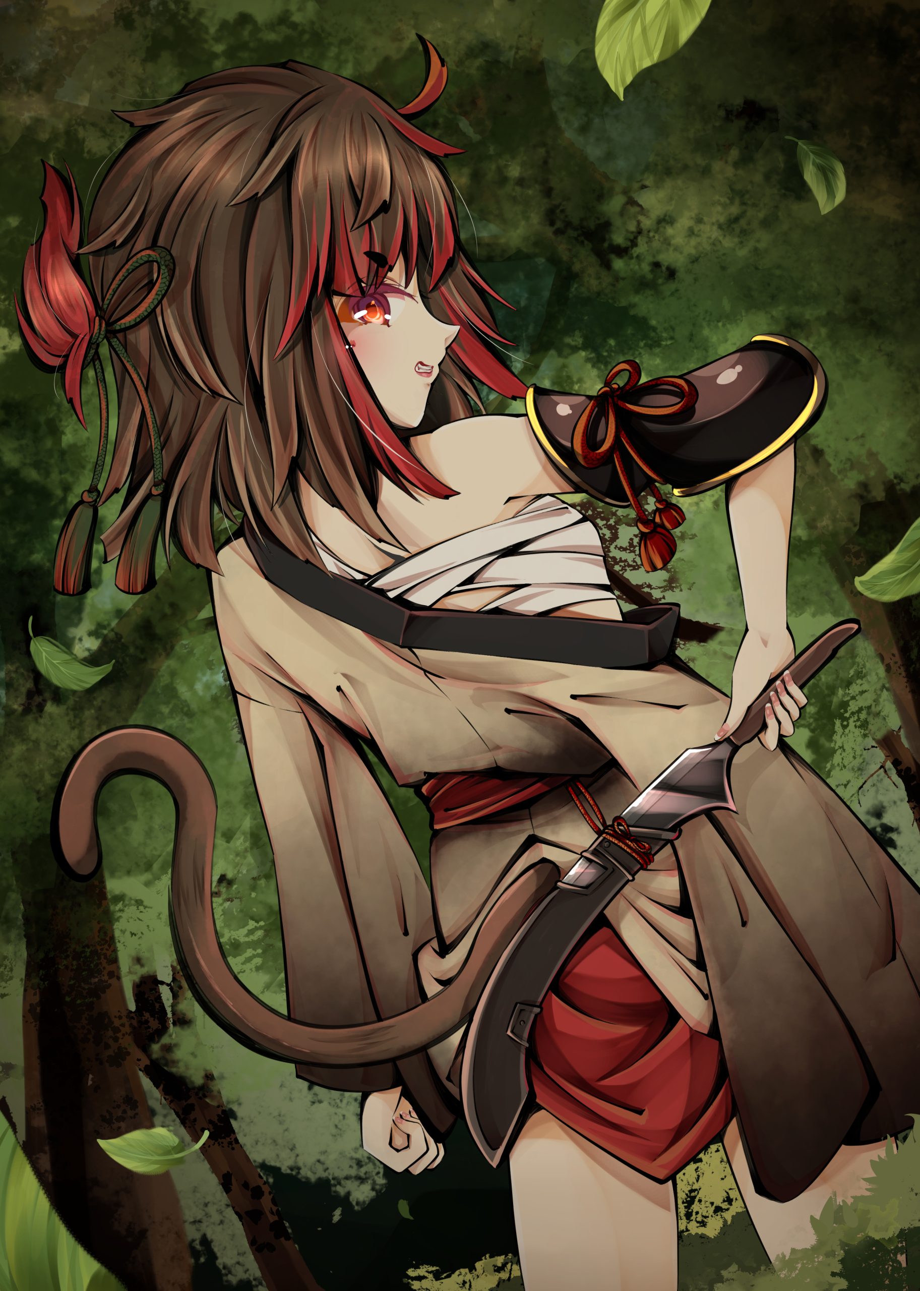 人間界のとある山の中に住むとされ、迷い込んだ獲物を待ち続けます。これまで長年猿として生きてきた為、サバイバルはおてのもの。狙った獲物は逃さず強い相手と勝負することを好む娘。素早く力強い彼女ですが尻尾を握られると弱体化します。 台詞「ひひっ、おいそこのお前、強そうじゃんかよ。あたしと勝負しな!」