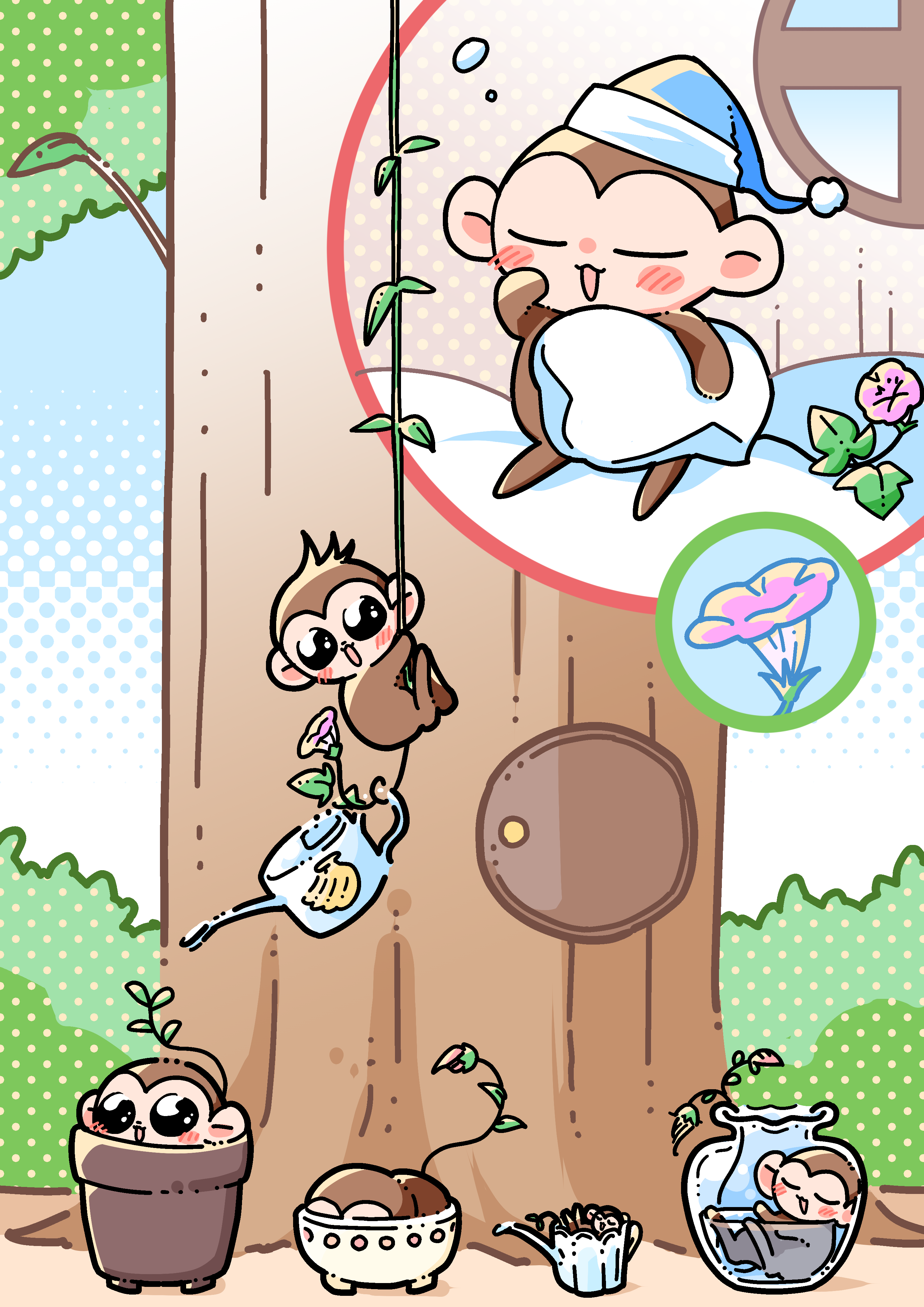 尻尾が植物になっていて、各個体により種類が異なります。 植木鉢で育ち、花が咲くと独り立ちします。 独り立ち後は棲家を見つけ、植木鉢に自生したガーデンモンキーと植物を育てます。 そうしてサイクルが回っています。
