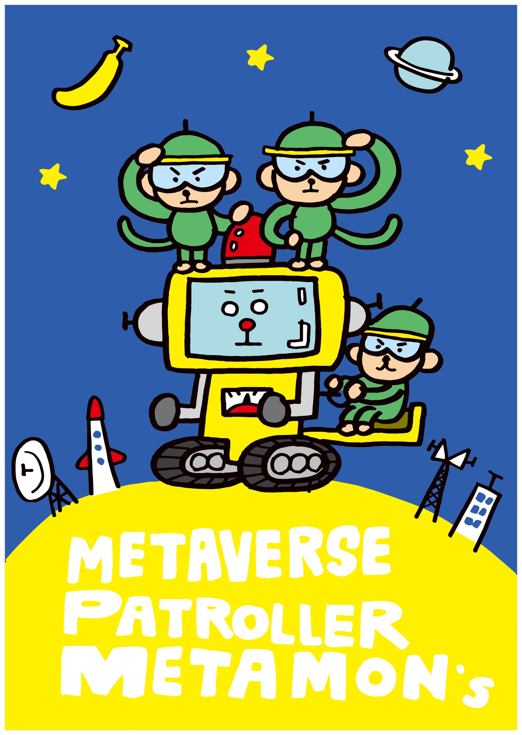 メタバース の世界を安全で楽しい世界のする為に活動しているおサルさんたち、メタモンズ。 ロボットおサルのメカメタモンは攻撃機能は一切搭載されていません。 ただ見た目重視でメタモンズたちは乗っています。 親しみやすくする為にゆるいタッチで描きました。