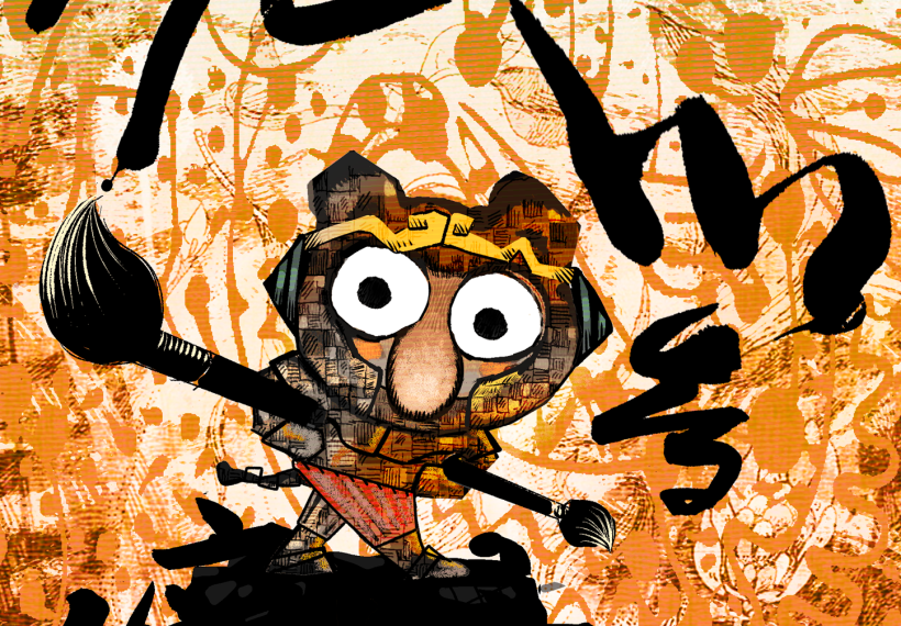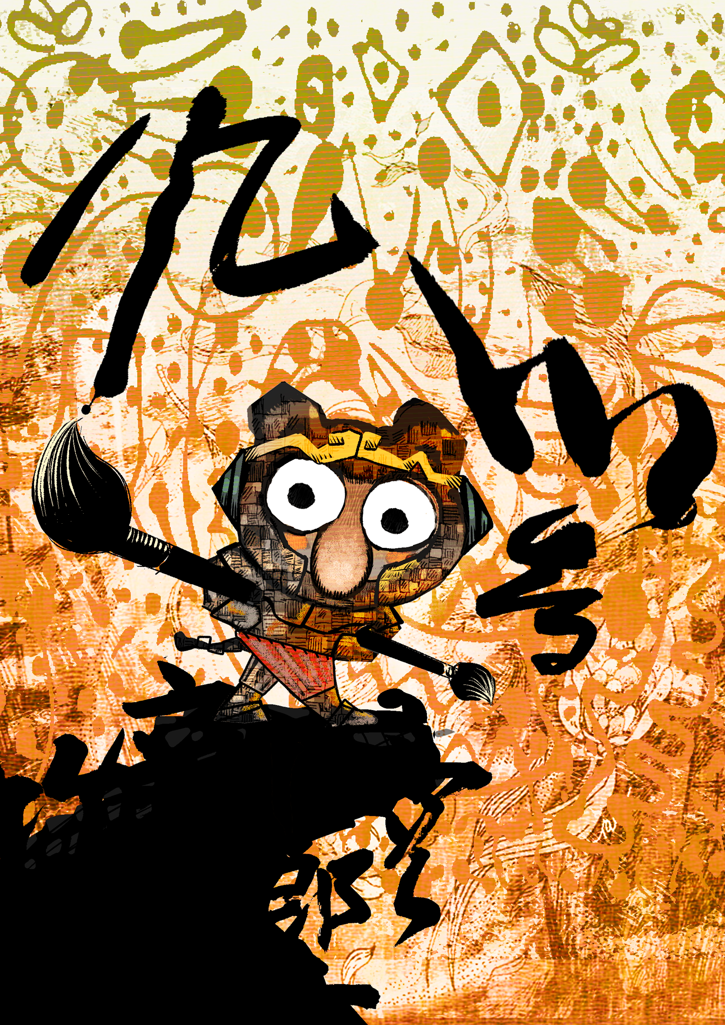 書をかく墨猿(すみざる)という名のキャラクターです。 斉天大聖(孫悟空)の如意棒のような筆と緊箍児をイメージしたデバイスを持っています。 自分の体から出る墨を使って「書」を生み出します。