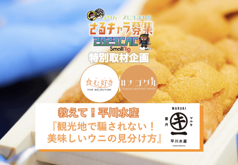 今回は「猿キャラ募集」 2023CAC国際コンペの協力をしている、グルメサイト「食む好き」と公式応援団のグルメインフルエンサー「ナゴグル」が、このコンペの協力企業「平川水産」に、特別企画として『観光地で騙されない!美味しいウニの見分け方』を教えてもらいます。